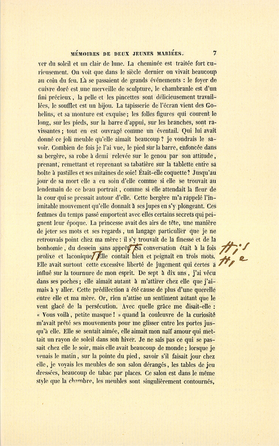 L’appartement, composé d’un salon, d’une chambre à coucher, et de ce joli cabinet en vermillon et or dont je t’ai parlé, occupe le pavillon du côté des Invalides. L’hôtel n’est séparé du boulevard que par un mur couvert de plantes grimpantes, et par une magnifique allée d’arbres qui mêlent leurs touffes à celles des ormeaux de la contre-allée du boulevard. Sans le dôme or et bleu, sans les masses grises des Invalides, on se croirait dans une forêt. Le style de ces trois pièces et leur place annoncent l’ancien appartement de parade des duchesses de Chaulieu, celui des ducs doit se trouver dans le pavillon opposé ; tous deux sont décemment séparés par les deux corps de logis et par le pavillon de la façade où sont ces grandes salles obscures et sonores que Philippe me montrait encore dépouillées de leur splendeur, et telles que je les avais vues dans mon enfance. Philippe prit un air confidentiel en voyant l’étonnement peint sur ma figure. Ma chère, dans cette maison diplomatique, tous les gens sont discrets et mystérieux. Il me dit alors qu’on attendait une loi par laquelle on rendrait aux émigrés la valeur de leurs biens. Mon père recule la restauration de son hôtel jusqu’au moment de cette {p. 6} restitution. L’architecte du roi avait évalué la dépense à trois cent mille livres. Cette confidence eut pour effet de me rejeter sur le sopha de mon salon. Eh ! quoi, mon père, au lieu d’employer cette somme à me marier, me laissait mourir au couvent ? Voilà la réflexion que j’ai trouvée sur le seuil de cette porte. Ah ! Renée, comme je me suis appuyé la tête sur ton épaule, et comme je me suis reportée aux jours où ma grand’mère animait ces deux chambres ! Elle qui n’existe que dans mon cœur, toi qui es à Maucombe, à deux cents lieues de moi, voilà les seuls êtres qui m’aiment ou m’ont aimée. Cette chère vieille au regard si jeune voulait s’éveiller à ma voix. Comme nous nous entendions ! Le souvenir a changé tout à coup les dispositions où j’étais d’abord. J’ai trouvé je ne sais quoi de saint à ce qui venait de me paraître une profanation. Il m’a semblé doux de respirer la vague odeur de poudre à la maréchale qui subsistait là, doux de dormir sous la protection de ces rideaux en damas jaune à dessins blancs où ses regards et son souffle ont dû laisser quelque chose de son âme. J’ai dit à Philippe de rendre leur lustre aux mêmes objets, de donner à mon appartement la vie propre à l’habitation. J’ai moi-même indiqué comment je voulais y être, en assignant à chaque meuble une place. J’ai passé la revue en prenant possession de tout, en disant comment se pouvaient rajeunir ces antiquités que j’aime. La chambre est d’un blanc un peu terni par le temps, comme aussi l’or des folâtres arabesques montre en quelques endroits des teintes rouges ; mais ces effets sont en harmonie avec les couleurs passées du tapis de la Savonnerie qui fut donné par Louis XV à ma grand’mère, ainsi que son portrait. La pendule est un présent du maréchal de Saxe. Les porcelaines de la cheminée viennent du maréchal de Richelieu. Le portrait de ma grand’mère, prise à vingt-cinq ans, est dans un cadre ovale en face de celui du roi. Le prince n’y est point. J’aime cet oubli franc, sans hypocrisie, qui peint d’un trait ce délicieux caractère. Dans une grande maladie que fit ma tante, son confesseur insistait pour que le prince, qui attendait dans le salon, entrât. – Avec le médecin et ses ordonnances, a-t-elle dit. Le lit est à baldaquin, à dossiers rembourrés ; les rideaux sont retroussés par des plis d’une belle ampleur ; les meubles sont en bois doré, couverts de ce damas jaune à fleurs blanches, également drapé aux fenêtres, et qui est doublé d’une étoffe de soie blanche qui ressemble à de la moire. Les dessus de porte sont peints je ne sais par qui, mais ils représentent un {p. 7} lever du soleil et un clair de lune. La cheminée est traitée fort curieusement. On voit que dans le siècle dernier on vivait beaucoup au coin du feu. Là se passaient de grands événements : le foyer de cuivre doré est une merveille de sculpture, le chambranle est d’un fini précieux, la pelle et les pincettes sont délicieusement travaillées, le soufflet est un bijou. La tapisserie de l’écran vient des Gobelins, et sa monture est exquise ; les folles figures qui courent le long, sur les pieds, sur la barre d’appui, sur les branches, sont ravissantes ; tout en est ouvragé comme un éventail. Qui lui avait donné ce joli meuble qu’elle aimait beaucoup ? je voudrais le savoir. Combien de fois je l’ai vue, le pied sur la barre, enfoncée dans sa bergère, sa robe à demi relevée sur le genou par son attitude, prenant, remettant et reprenant sa tabatière sur la tablette entre sa boîte à pastilles et ses mitaines de soie ! Était-elle coquette ? Jusqu’au jour de sa mort elle a eu soin d’elle comme si elle se trouvait au lendemain de ce beau portrait, comme si elle attendait la fleur de la cour qui se pressait autour d’elle. Cette bergère m’a rappelé l’inimitable mouvement qu’elle donnait à ses jupes en s’y plongeant. Ces femmes du temps passé emportent avec elles certains secrets qui peignent leur époque. La princesse avait des airs de tête, une manière de jeter ses mots et ses regards, un langage particulier que je ne retrouvais point chez ma mère : il s’y trouvait de la finesse et de la bonhomie, du dessein sans apprêt ; sa conversation était à la fois prolixe et laconique, elle contait bien et peignait en trois mots. Elle avait surtout cette excessive liberté de jugement qui certes a influé sur la tournure de mon esprit. De sept à dix ans, j’ai vécu dans ses poches ; elle aimait autant à m’attirer chez elle que j’aimais à y aller. Cette prédilection a été cause de plus d’une querelle entre elle et ma m