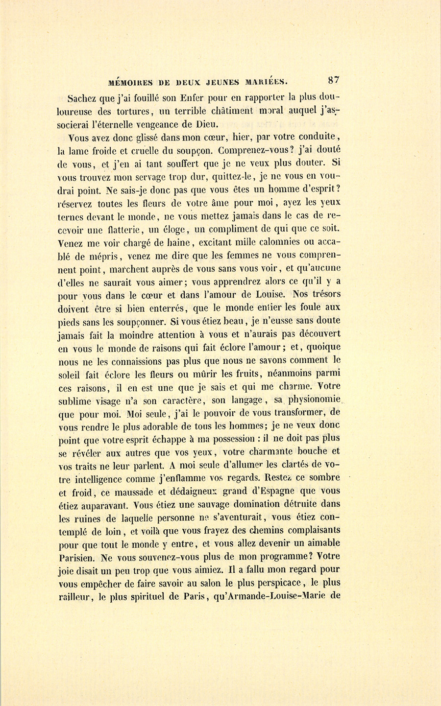 Voici quelles mesures j’ai prises pour cacher mon bonheur, car je souhaite éviter toute espèce d’occasion à ma jalousie. Je ressemble à cette belle princesse italienne qui courait comme une lionne ronger son amour dans quelque ville de Suisse, après avoir fondu sur sa proie comme une lionne. Aussi ne te parlé-je de mes dispositions que pour te demander une autre grâce, celle de ne jamais venir nous voir sans que je t’en aie priée moi-même, et de respecter la solitude dans laquelle je veux vivre.