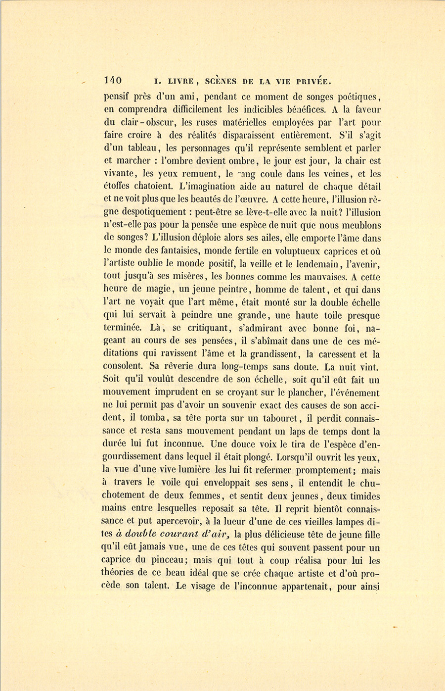 Il est pour les âmes faciles à s’épanouir une heure délicieuse qui survient au moment où la nuit n’est pas encore et où le jour n’est plus ; la lueur crépusculaire jette alors ses teintes molles ou ses reflets bizarres sur tous les objets, et favorise une rêverie qui se marie vaguement aux jeux de la lumière et de l’ombre. Le silence qui règne presque toujours en cet instant le rend plus particulièrement cher aux artistes qui se recueillent, se mettent à quelques pas de leurs œuvres auxquelles ils ne peuvent plus travailler, et ils les jugent en s’enivrant du sujet dont le sens intime éclate alors aux yeux intérieurs du génie. Celui qui n’est pas demeuré {p. 140} pensif près d’un ami, pendant ce moment de songes poétiques, en comprendra difficilement les indicibles bénéfices. À la faveur du clair-obscur, les ruses matérielles employées par l’art pour faire croire à des réalités disparaissent entièrement. S’il s’agit d’un tableau, les personnages qu’il représente semblent et parler et marcher : l’ombre devient ombre, le jour est jour, la chair est vivante, les yeux remuent, le sang coule dans les veines, et les étoffes chatoient. L’imagination aide au naturel de chaque détail et ne voit plus que les beautés de l’œuvre. À cette heure, l’illusion règne despotiquement : peut-être se lève-t-elle avec la nuit ? l’illusion n’est-elle pas pour la pensée une espèce de nuit que nous meublons de songes ? L’illusion déploie alors ses ailes, elle emporte l’âme dans le monde des fantaisies, monde fertile en voluptueux caprices et où l’artiste oublie le monde positif, la veille et le lendemain, l’avenir, tout jusqu’à ses misères, les bonnes comme les mauvaises. À cette heure de magie, un jeune peintre, homme de talent, et qui dans l’art ne voyait que l’art même, était monté sur la double échelle qui lui servait à peindre une grande, une haute toile presque terminée. Là, se critiquant, s’admirant avec bonne foi, nageant au cours de ses pensées, il s’abîmait dans une de ces méditations qui ravissent l’âme et la grandissent, la caressent et la consolent. Sa rêverie dura long-temps sans doute. La nuit vint. Soit qu’il voulût descendre de son échelle, soit qu’il eût fait un mouvement imprudent en se croyant sur le plancher, l’événement ne lui permit pas d’avoir un souvenir exact des causes de son accident, il tomba, sa tête porta sur un tabouret, il perdit connaissance et resta sans mouvement pendant un laps de temps dont la durée lui fut inconnue. Une douce voix le tira de l’espèce d’engourdissement dans lequel il était plongé. Lorsqu’il ouvrit les yeux, la vue d’une vive lumière les lui fit refermer promptement ; mais à travers le voile qui enveloppait ses sens, il entendit le chuchotement de deux femmes, et sentit deux jeunes, deux timides mains entre lesquelles reposait sa tête. Il reprit bientôt connaissance et put apercevoir, à la lueur d’une de ces vieilles lampes dites à double courant d’air, la plus délicieuse tête de jeune fille qu’il eût jamais vue, une de ces têtes qui souvent passent pour un caprice du pinceau ; mais qui tout à coup réalisa pour lui les théories de ce beau idéal que se crée chaque artiste et d’où procède son talent. Le visage de l’inconnue appartenait, pour ainsi {p. 141} dire, au type fin et délicat de l’école de Prudhon, et possédait aussi cette poésie que Girodet donnait à ses figures fantastiques. La fraîcheur des tempes, la régularité des sourcils, la pureté des lignes, la virginité fortement empreinte dans tous les traits de cette physionomie faisaient de la jeune fille une création accomplie. La taille était souple et mince, les formes étaient frêles. Ses vêtements, quoique simples et propres, n’annonçaient ni fortune ni misère. En reprenant possession de lui-même, le peintre exprima son admiration par un regard de surprise, et balbutia de confus remercîments. Il trouva son front pressé par un mouchoir, et reconnut, malgré l’odeur particulière aux ateliers, la senteur forte de l’éther, sans doute employé pour le tirer de son évanouissement. Puis, il finit par voir une vieille femme, qui ressemblait aux marquises de l’ancien régime, et qui tenait la lampe en donnant des conseils à la jeune inconnue.