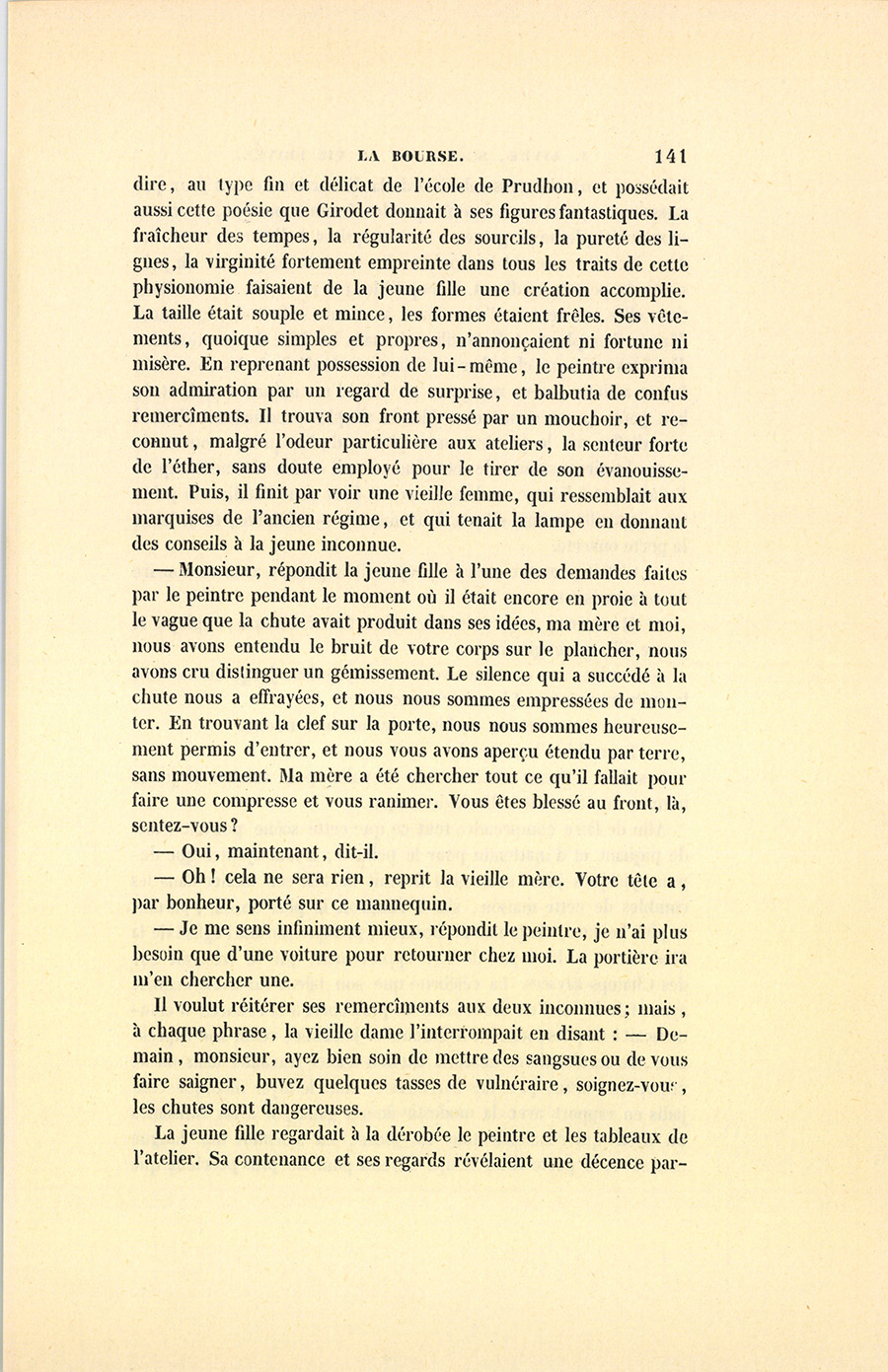 – Monsieur, répondit la jeune fille à l’une des demandes faites par le peintre pendant le moment où il était encore en proie à tout le vague que la chute avait produit dans ses idées, ma mère et moi, nous avons entendu le bruit de votre corps sur le plancher, nous avons cru distinguer un gémissement. Le silence qui a succédé à la chute nous a effrayées, et nous nous sommes empressées de monter. En trouvant la clef sur la porte, nous nous sommes heureusement permis d’entrer, et nous vous avons aperçu étendu par terre, sans mouvement. Ma mère a été chercher tout ce qu’il fallait pour faire une compresse et vous ranimer. Vous êtes blessé au front, là, sentez-vous ?