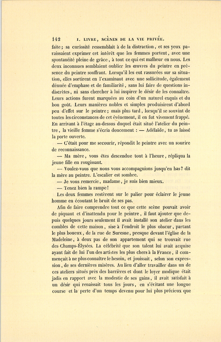 La jeune fille regardait à la dérobée le peintre et les tableaux de l’atelier. Sa contenance et ses regards révélaient une décence {p. 142} parfaite ; sa curiosité ressemblait à de la distraction, et ses yeux paraissaient exprimer cet intérêt que les femmes portent, avec une spontanéité pleine de grâce, à tout ce qui est malheur en nous. Les deux inconnues semblaient oublier les œuvres du peintre en présence du peintre souffrant. Lorsqu’il les eut rassurées sur sa situation, elles sortirent en l’examinant avec une sollicitude, également dénuée d’emphase et de familiarité, sans lui faire de questions indiscrètes, ni sans chercher à lui inspirer le désir de les connaître. Leurs actions furent marquées au coin d’un naturel exquis et du bon goût. Leurs manières nobles et simples produisirent d’abord peu d’effet sur le peintre ; mais plus tard, lorsqu’il se souvint de toutes les circonstances de cet événement, il en fut vivement frappé. En arrivant à l’étage au-dessus duquel était situé l’atelier du peintre, la vieille femme s’écria doucement : – Adélaïde, tu as laissé la porte ouverte. [ill.]