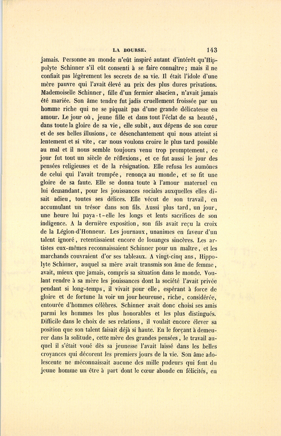 Afin de faire comprendre tout ce que cette scène pouvait avoir de piquant et d’inattendu pour le peintre, il faut ajouter que depuis quelques jours seulement il avait installé son atelier dans les combles de cette maison, sise à l’endroit le plus obscur, partant le plus boueux, de la rue de Suresne, presque devant l’église de la Madeleine, à deux pas de son appartement qui se trouvait rue des Champs-Élysées. La célébrité que son talent lui avait acquise ayant fait de lui l’un des artistes les plus chers à la France, il commençait à ne plus connaître le besoin, et jouissait, selon son expression, de ses dernières misères. Au lieu d’aller travailler dans un de ces ateliers situés près des barrières et dont le loyer modique était jadis en rapport avec la modestie de ses gains, il avait satisfait à un désir qui renaissait tous les jours, en s’évitant une longue course et la perte d’un temps devenu pour lui plus précieux que {p. 143} jamais. Personne au monde n’eût inspiré autant d’intérêt qu’Hippolyte Schinner s’il eût consenti à se faire connaître ; mais il ne confiait pas légèrement les secrets de sa vie. Il était l’idole d’une mère pauvre qui l’avait élevé au prix des plus dures privations. Mademoiselle Schinner, fille d’un fermier alsacien, n’avait jamais été mariée. Son âme tendre fut jadis cruellement froissée par un homme riche qui ne se piquait pas d’une grande délicatesse en amour. Le jour où, jeune fille et dans tout l’éclat de sa beauté, dans toute la gloire de sa vie, elle subit, aux dépens de son cœur et de ses belles illusions, ce désenchantement qui nous atteint si lentement et si vite, car nous voulons croire le plus tard possible au mal et il nous semble toujours venu trop promptement, ce jour fut tout un siècle de réflexions, et ce fut aussi le jour des pensées religieuses et de la résignation. Elle refusa les aumônes de celui qui l’avait trompée, renonça au monde, et se fit une gloire de sa faute. Elle se donna toute à l’amour maternel en lui demandant, pour les jouissances sociales auxquelles elle disait adieu, toutes ses délices. Elle vécut de son travail, en accumulant un trésor dans son fils. Aussi plus tard, un jour, une heure lui paya-t-elle les longs et lents sacrifices de son indigence. À la dernière exposition, son fils avait reçu la croix de la Légion-d’Honneur. Les journaux, unanimes en faveur d’un talent ignoré, retentissaient encore de louanges sincères. Les artistes eux-mêmes reconnaissaient Schinner pour un maître, et les marchands couvraient d’or ses tableaux. [ill.] À vingt-cinq ans, Hippolyte Schinner, auquel sa mère avait transmis son âme de femme, avait, mieux que jamais, compris sa situation dans le monde. Voulant rendre à sa mère les jouissances dont la société l’avait privée pendant si long-temps, il vivait pour elle, espérant à force de gloire et de fortune la voir un jour heureuse, riche, considérée, entourée d’hommes célèbres. Schinner avait donc choisi ses amis parmi les hommes les plus honorables et les plus distingués. Difficile dans le choix de ses relations, il voulait encore élever sa position que son talent faisait déjà si haute. En le forçant à demeurer dans la solitude, cette mère des grandes pensées, le travail auquel il s’était voué dès sa jeunesse l’avait laissé dans les belles croyances qui décorent les premiers jours de la vie. Son âme adolescente ne méconnaissait aucune des mille pudeurs qui font du jeune homme un être à part dont le cœur abonde en félicités, en {p. 144} poésies, en espérances vierges, faibles aux yeux des gens blasés, mais profondes parce qu’elles sont simples. Il avait été doué de ces manières douces et polies qui vont si bien à l’âme et séduisent ceux mêmes par qui elles ne sont pas comprises. Il était bien fait. Sa voix, qui partait du cœur, y remuait chez les autres des sentiments nobles, et témoignait d’une modestie vraie par une certaine candeur dans l’accent. En le voyant, on se sentait porté vers lui par une de ces attractions morales que les savants ne savent heureusement pas encore analyser, ils y trouveraient quelque phénomène de galvanisme ou le jeu de je ne sais quel fluide, et formuleraient nos sentiments par des proportions d’oxigène et d’électricité. Ces détails feront peut-être comprendre aux gens hardis par caractère et aux hommes bien cravatés pourquoi, pendant l’absence du portier, qu’il avait envoyé chercher une voiture au bout de la rue de la Madeleine, Hippolyte Schinner ne fit à la portière aucune question sur les deux personnes dont le bon cœur s’était dévoilé pour lui. Mais quoiqu’il répondît par oui et non aux demandes, naturelles en semblable occurrence, qui lui furent faites par cette femme sur son accident et sur l’intervention officieuse des locataires qui occupaient le quatrième étage, il ne put l’empêcher d’obéir à l’instinct des portiers : elle lui parla des deux inconnues selon les intérêts de sa politique et d’après les jugements souterrains de la loge.