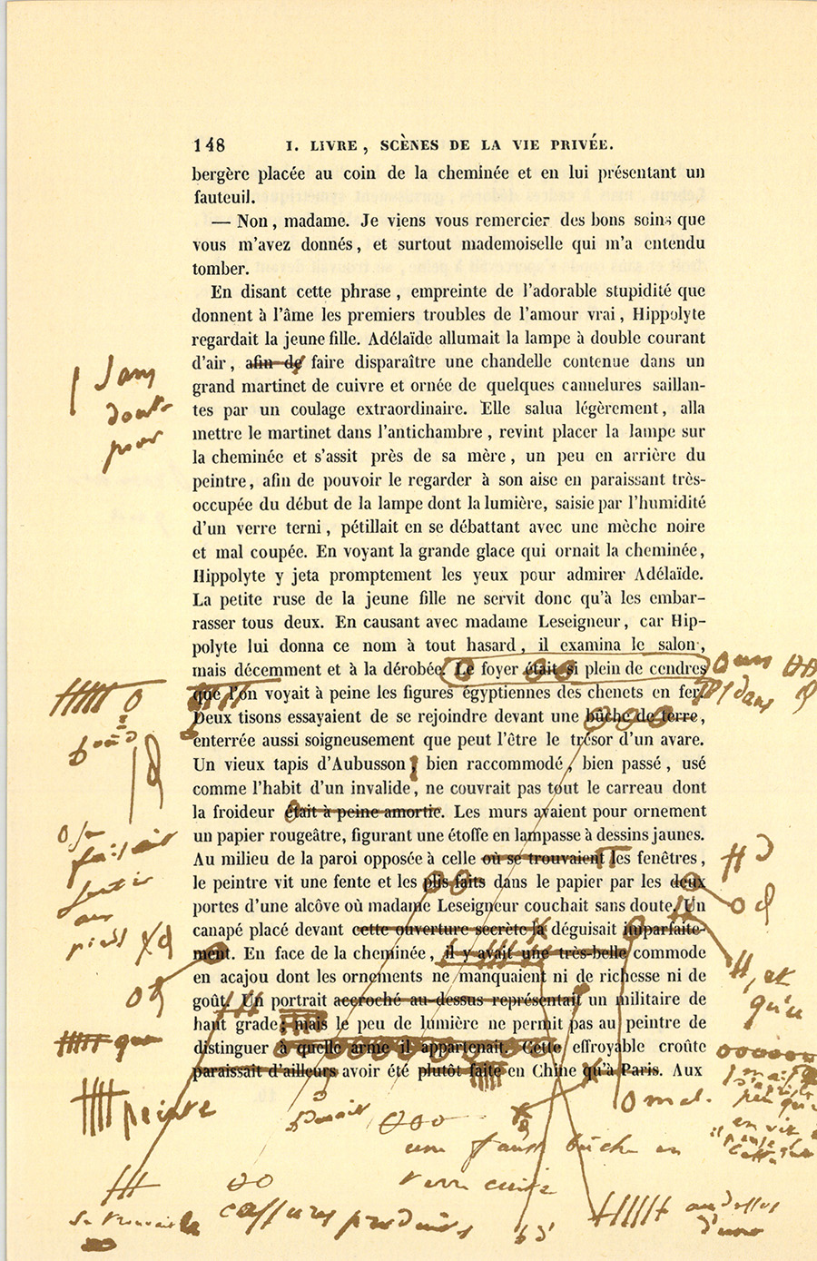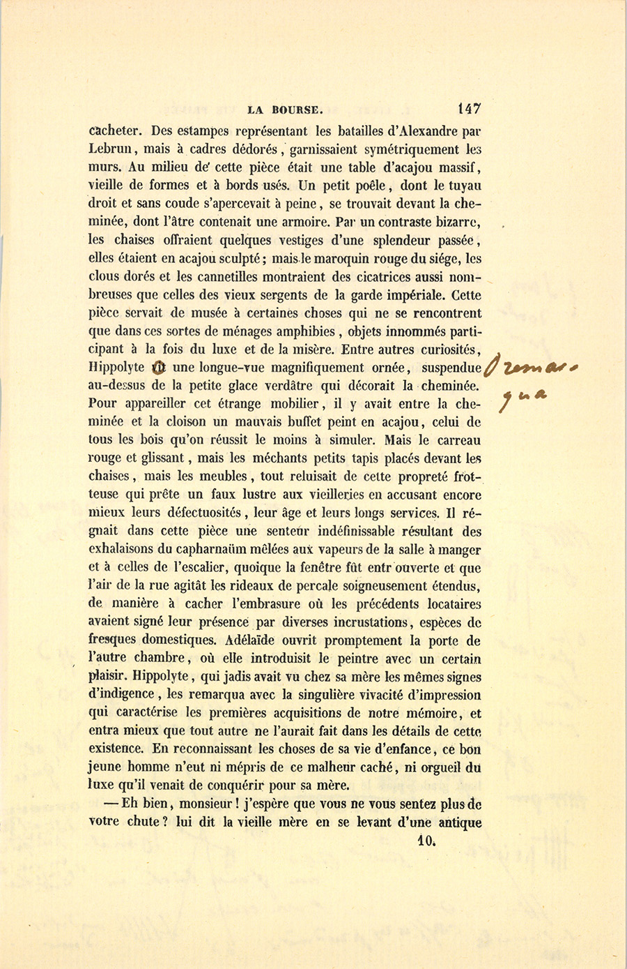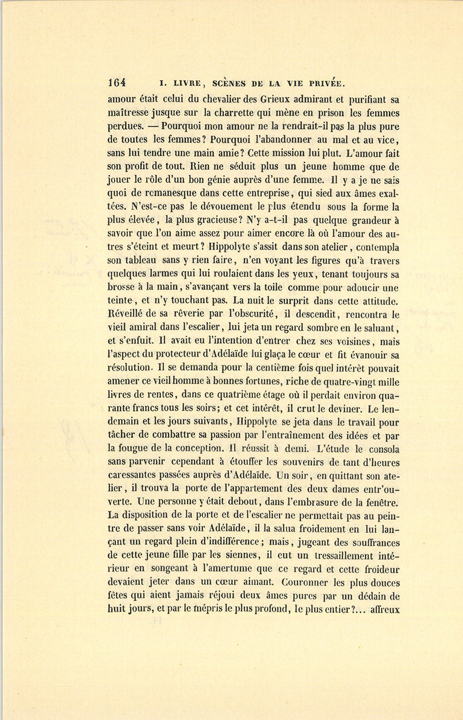 Mademoiselle Leseigneur vint elle-même ouvrir la porte. En reconnaissant le jeune peintre, elle le salua ; puis, en même temps, avec cette dextérité parisienne et cette présence d’esprit que la fierté donne, elle se retourna pour fermer la porte d’une cloison vitrée à travers laquelle Hippolyte aurait pu entrevoir quelques linges étendus sur des cordes au-dessus des fourneaux économiques, un vieux lit de sangles, la braise, le charbon, les fers à repasser, la fontaine filtrante, la vaisselle et tous les ustensiles particuliers aux petits ménages. Des rideaux de mousseline assez propres cachaient soigneusement ce capharnaüm, mot en usage pour désigner familièrement ces espèces de laboratoires, mal éclairé d’ailleurs par des jours de souffrance pris sur une cour voisine. Avec le rapide coup d’œil des artistes, Hippolyte vit la destination, les meubles, l’ensemble et l’état de cette première pièce coupée en deux. La partie honorable, qui servait à la fois d’antichambre et de salle à manger, était tendue d’un vieux papier de couleur aurore, à bordure veloutée, sans doute fabriqué par Réveillon, et dont les trous ou les taches avaient été soigneusement dissimulés sous des pains à {p. 147} cacheter. Des estampes représentant les batailles d’Alexandre par Lebrun, mais à cadres dédorés, garnissaient symétriquement les murs. Au milieu de cette pièce était une table d’acajou massif, vieille de formes et à bords usés. Un petit poêle, dont le tuyau droit et sans coude s’apercevait à peine, se trouvait devant la cheminée, dont l’âtre contenait une armoire. Par un contraste bizarre, les chaises offraient quelques vestiges d’une splendeur passée, elles étaient en acajou sculpté ; mais le maroquin rouge du siége, les clous dorés et les cannetilles montraient des cicatrices aussi nombreuses que celles des vieux sergents de la garde impériale. Cette pièce servait de musée à certaines choses qui ne se rencontrent que dans ces sortes de ménages amphibies, objets innommés participant à la fois du luxe et de la misère. Entre autres curiosités, Hippolyte remarqua une longue-vue magnifiquement ornée, suspendue au-dessus de la petite glace verdâtre qui décorait la cheminée. Pour appareiller cet étrange mobilier, il y avait entre la cheminée et la cloison un mauvais buffet peint en acajou, celui de tous les bois qu’on réussit le moins à simuler. Mais le carreau rouge et glissant, mais les méchants petits tapis placés devant les chaises, mais les meubles, tout reluisait de cette propreté frotteuse qui prête un faux lustre aux vieilleries en accusant encore mieux leurs défectuosités, leur âge et leurs longs services. Il régnait dans cette pièce une senteur indéfinissable résultant des exhalaisons du capharnaüm mêlées aux vapeurs de la salle à manger et à celles de l’escalier, quoique la fenêtre fût entr’ouverte et que l’air de la rue agitât les rideaux de percale soigneusement étendus, de manière à cacher l’embrasure où les précédents locataires avaient signé leur présence par diverses incrustations, espèces de fresques domestiques. Adélaïde ouvrit promptement la porte de l’autre chambre, où elle introduisit le peintre avec un certain plaisir. Hippolyte, qui jadis avait vu chez sa mère les mêmes signes d’indigence, les remarqua avec la singulière vivacité d’impression qui caractérise les premières acquisitions de notre mémoire, et entra mieux que tout autre ne l’aurait fait dans les détails de cette existence. En reconnaissant les choses de sa vie d’enfance, ce bon jeune homme n’eut ni mépris de ce malheur caché, ni orgueil du luxe qu’il venait de conquérir pour sa mère.