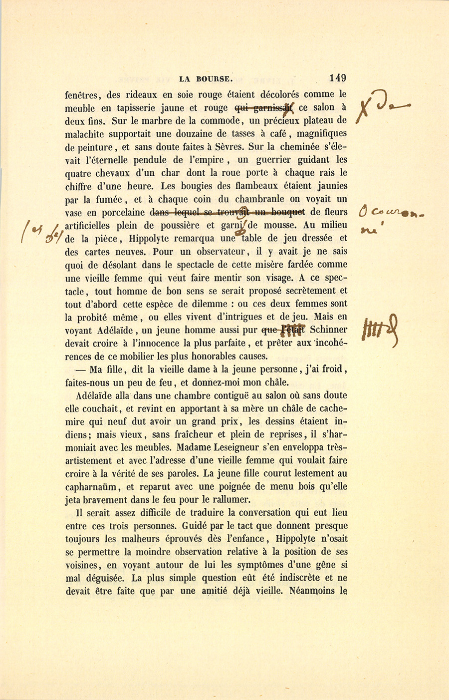 En disant cette phrase, empreinte de l’adorable stupidité que donnent à l’âme les premiers troubles de l’amour vrai, Hippolyte regardait la jeune fille. Adélaïde allumait la lampe à double courant d’air, sans doute pour faire disparaître une chandelle contenue dans un grand martinet de cuivre et ornée de quelques cannelures saillantes par un coulage extraordinaire. Elle salua légèrement, alla mettre le martinet dans l’antichambre, revint placer la lampe sur la cheminée et s’assit près de sa mère, un peu en arrière du peintre, afin de pouvoir le regarder à son aise en paraissant très-occupée du début de la lampe dont la lumière, saisie par l’humidité d’un verre terni, pétillait en se débattant avec une mèche noire et mal coupée. En voyant la grande glace qui ornait la cheminée, Hippolyte y jeta promptement les yeux pour admirer Adélaïde. La petite ruse de la jeune fille ne servit donc qu’à les embarrasser tous deux. En causant avec madame Leseigneur, car Hippolyte lui donna ce nom à tout hasard, il examina le salon, mais décemment et à la dérobée. On voyait à peine les figures égyptiennes des chenets en fer dans un foyer plein de cendres où des tisons essayaient de se rejoindre devant une fausse bûche en terre cuite, enterrée aussi soigneusement que peut l’être le trésor d’un avare. Un vieux tapis d’Aubusson bien raccommodé, bien passé, usé comme l’habit d’un invalide, ne couvrait pas tout le carreau dont la froideur se faisait sentir aux pieds. Les murs avaient pour ornement un papier rougeâtre, figurant une étoffe en lampas 1 à dessins jaunes. Au milieu de la paroi opposée à celle des fenêtres, le peintre vit une fente et les cassures produites dans le papier par les portes d’une alcôve où madame Leseigneur couchait sans doute, et qu’un canapé placé devant déguisait mal. En face de la cheminée, au-dessus d’une commode en acajou dont les ornements ne manquaient ni de richesse ni de goût se trouvait le portrait d’un militaire de haut grade que le peu de lumière ne permit pas au peintre de distinguer ; mais d’après le peu qu’il en vit, il pensa que cette effroyable croûte devait avoir été peinte en Chine. Aux {p. 149} fenêtres, des rideaux en soie rouge étaient décolorés comme le meuble en tapisserie jaune et rouge de ce salon à deux fins. Sur le marbre de la commode, un précieux plateau de malachite supportait une douzaine de tasses à café, magnifiques de peinture, et sans doute faites à Sèvres. Sur la cheminée s’élevait l’éternelle pendule de l’empire, un guerrier guidant les quatre chevaux d’un char dont la roue porte à chaque rais le chiffre d’une heure. Les bougies des flambeaux étaient jaunies par la fumée, et à chaque coin du chambranle on voyait un vase en porcelaine couronné de fleurs artificielles pleines de poussière et garnies de mousse. Au milieu de la pièce, Hippolyte remarqua une table de jeu dressée et des cartes neuves. Pour un observateur, il y avait je ne sais quoi de désolant dans le spectacle de cette misère fardée comme une vieille femme qui veut faire mentir son visage. À ce spectacle, tout homme de bon sens se serait proposé secrètement et tout d’abord cette espèce de dilemme : ou ces deux femmes sont la probité même, ou elles vivent d’intrigues et de jeu. Mais en voyant Adélaïde, un jeune homme aussi pur que Schinner devait croire à l’innocence la plus parfaite, et prêter aux incohérences de ce mobilier les plus honorables causes.