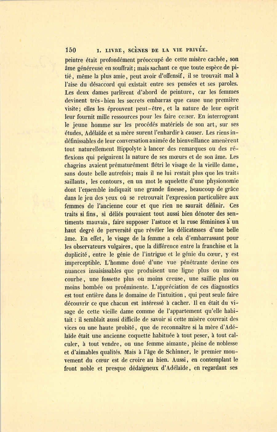 Il serait assez difficile de traduire la conversation qui eut lieu entre ces trois personnes. Guidé par le tact que donnent presque toujours les malheurs éprouvés dès l’enfance, Hippolyte n’osait se permettre la moindre observation relative à la position de ses voisines, en voyant autour de lui les symptômes d’une gêne si mal déguisée. La plus simple question eût été indiscrète et ne devait être faite que par une amitié déjà vieille. Néanmoins le {p. 150} peintre était profondément préoccupé de cette misère cachée, son âme généreuse en souffrait ; mais sachant ce que toute espèce de pitié, même la plus amie, peut avoir d’offensif, il se trouvait mal à l’aise du désaccord qui existait entre ses pensées et ses paroles. Les deux dames parlèrent d’abord de peinture, car les femmes devinent très-bien les secrets embarras que cause une première visite ; elles les éprouvent peut-être, et la nature de leur esprit leur fournit mille ressources pour les faire cesser. En interrogeant le jeune homme sur les procédés matériels de son art, sur ses études, Adélaïde et sa mère surent l’enhardir à causer. Les riens indéfinissables de leur conversation animée de bienveillance amenèrent tout naturellement Hippolyte à lancer des remarques ou des réflexions qui peignirent la nature de ses mœurs et de son âme. Les chagrins avaient prématurément flétri le visage de la vieille dame, sans doute belle autrefois ; mais il ne lui restait plus que les traits saillants, les contours, en un mot le squelette d’une physionomie dont l’ensemble indiquait une grande finesse, beaucoup de grâce dans le jeu des yeux où se retrouvait l’expression particulière aux femmes de l’ancienne cour et que rien ne saurait définir. Ces traits si fins, si déliés pouvaient tout aussi bien dénoter des sentiments mauvais, faire supposer l’astuce et la ruse féminines à un haut degré de perversité que révéler les délicatesses d’une belle âme. En effet, le visage de la femme a cela d’embarrassant pour les observateurs vulgaires, que la différence entre la franchise et la duplicité, entre le génie de l’intrigue et le génie du cœur, y est imperceptible. L’homme doué d’une vue pénétrante devine ces nuances insaisissables que produisent une ligne plus ou moins courbe, une fossette plus ou moins creuse, une saillie plus ou moins bombée ou proéminente. L’appréciation de ces diagnostics est tout entière dans le domaine de l’intuition, qui peut seule faire découvrir ce que chacun est intéressé à cacher. Il en était du visage de cette vieille dame comme de l’appartement qu’elle habitait : il semblait aussi difficile de savoir si cette misère couvrait des vices ou une haute probité, que de reconnaître si la mère d’Adélaïde était une ancienne coquette habituée à tout peser, à tout calculer, à tout vendre, ou une femme aimante, pleine de noblesse et d’aimables qualités. Mais à l’âge de Schinner, le premier mouvement du cœur est de croire au bien. Aussi, en contemplant le front noble et presque dédaigneux d’Adélaïde, en regardant ses {p. 151} yeux pleins d’âme et de pensées, respira-t-il, pour ainsi dire, les suaves et modestes parfums de la vertu. Au milieu de la conversation, il saisit l’occasion de parler des portraits en général, pour avoir le droit d’examiner l’effroyable pastel dont toutes les teintes avaient pâli, et dont la poussière était en grande partie tombée.