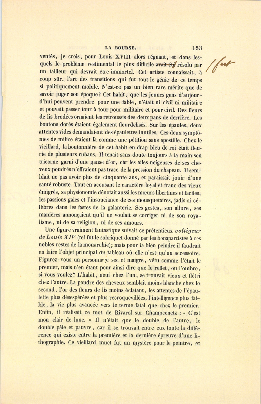 Une figure vraiment fantastique suivait ce prétentieux voltigeur de Louis XIV (tel fut le sobriquet donné par les bonapartistes à ces nobles restes de la monarchie) ; mais pour la bien peindre il faudrait en faire l’objet principal du tableau où elle n’est qu’un accessoire. Figurez-vous un personnage sec et maigre, vêtu comme l’était le premier, mais n’en étant pour ainsi dire que le reflet, ou l’ombre, si vous voulez ? L’habit, neuf chez l’un, se trouvait vieux et flétri chez l’autre. La poudre des cheveux semblait moins blanche chez le second, l’or des fleurs de lis moins éclatant, les attentes de l’épaulette plus désespérées et plus recroquevillées, l’intelligence plus faible, la vie plus avancée vers le terme fatal que chez le premier. Enfin, il réalisait ce mot de Rivarol sur Champcenetz : « C’est mon clair de lune. » Il n’était que le double de l’autre, le double pâle et pauvre, car il se trouvait entre eux toute la différence qui existe entre la première et la dernière épreuve d’une lithographie. Ce vieillard muet fut un mystère pour le peintre, et {p. 154} resta constamment un mystère. Le chevalier, il était chevalier, ne parla pas, et personne ne lui parla. Était-ce un ami, un parent pauvre, un homme qui restait près du vieux galant comme une demoiselle de compagnie près d’une vieille femme ? Tenait-il le milieu entre le chien, le perroquet et l’ami ? Avait-il sauvé la fortune ou seulement la vie de son bienfaiteur ? Était-ce le Trim d’un autre capitaine Tobie ? Ailleurs, comme chez la baronne de Rouville, il excitait toujours la curiosité sans jamais la satisfaire. Qui pouvait, sous la Restauration, se rappeler l’attachement qui liait avant la Révolution ce chevalier à la femme de son ami, morte depuis vingt ans ?