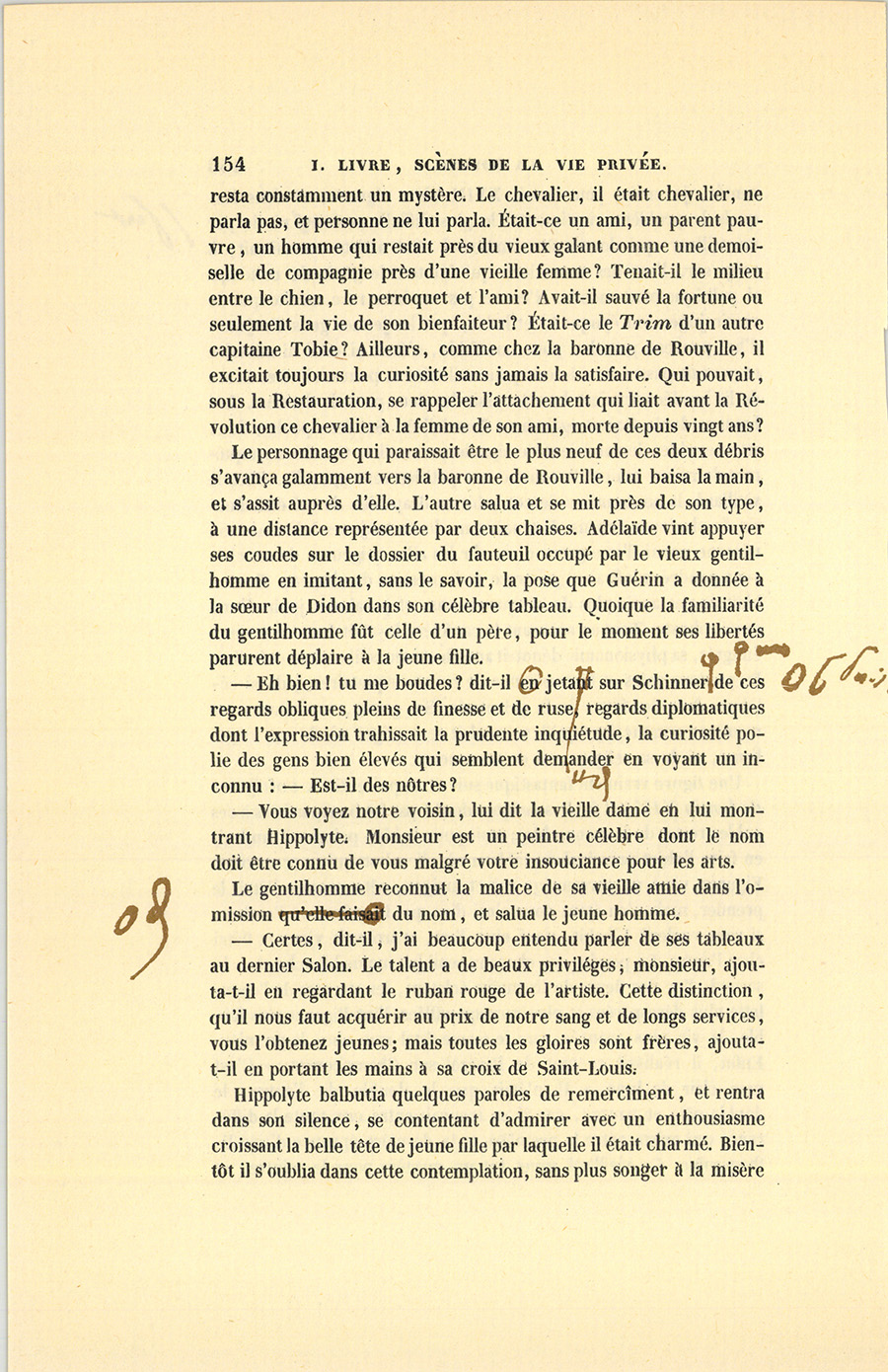 – Certes, dit-il, j’ai beaucoup entendu parler de ses tableaux au dernier Salon. Le talent a de beaux priviléges, monsieur, ajouta-t-il en regardant le ruban rouge de l’artiste. Cette distinction, qu’il nous faut acquérir au prix de notre sang et de longs services, vous l’obtenez jeunes ; mais toutes les gloires sont frères, ajouta-t-il en portant les mains à sa croix de Saint-Louis.