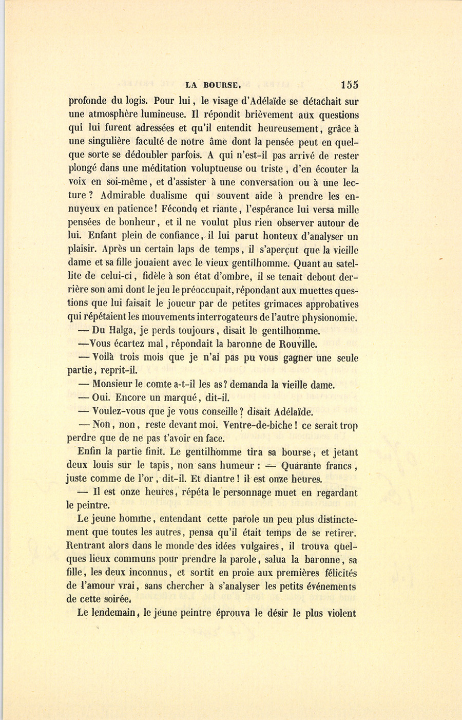 Hippolyte balbutia quelques paroles de remercîment, et rentra dans son silence, se contentant d’admirer avec un enthousiasme croissant la belle tête de jeune fille par laquelle il était charmé. Bientôt il s’oublia dans cette contemplation, sans plus songer à la misère {p. 155} profonde du logis. Pour lui, le visage d’Adélaïde se détachait sur une atmosphère lumineuse. Il répondit brièvement aux questions qui lui furent adressées et qu’il entendit heureusement, grâce à une singulière faculté de notre âme dont la pensée peut en quelque sorte se dédoubler parfois. À qui n’est-il pas arrivé de rester plongé dans une méditation voluptueuse ou triste, d’en écouter la voix en soi-même, et d’assister à une conversation ou à une lecture ? Admirable dualisme qui souvent aide à prendre les ennuyeux en patience ! Féconde et riante, l’espérance lui versa mille pensées de bonheur, et il ne voulut plus rien observer autour de lui. Enfant plein de confiance, il lui parut honteux d’analyser un plaisir. Après un certain laps de temps, il s’aperçut que la vieille dame et sa fille jouaient avec le vieux gentilhomme. Quant au satellite de celui-ci, fidèle à son état d’ombre, il se tenait debout derrière son ami dont le jeu le préoccupait, répondant aux muettes questions que lui faisait le joueur par de petites grimaces approbatives qui répétaient les mouvements interrogateurs de l’autre physionomie.