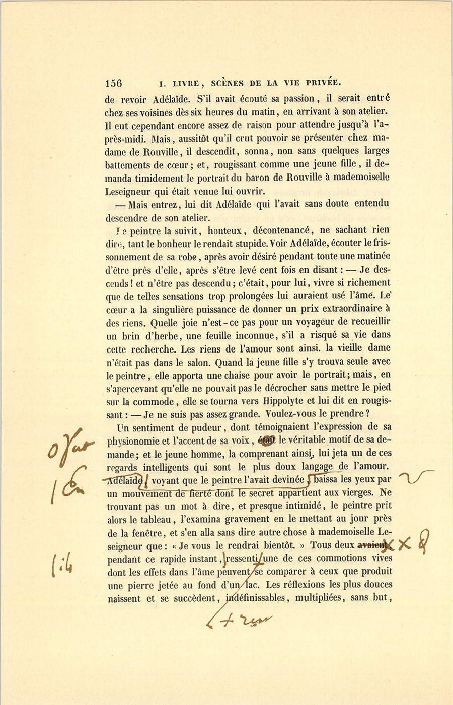 Un sentiment de pudeur, dont témoignaient l’expression de sa physionomie et l’accent de sa voix, fut le véritable motif de sa demande ; et le jeune homme, la comprenant ainsi, lui jeta un de ces regards intelligents qui sont le plus doux langage de l’amour. En voyant que le peintre l’avait devinée, Adélaïde baissa les yeux par un mouvement de fierté dont le secret appartient aux vierges. Ne trouvant pas un mot à dire, et presque intimidé, le peintre prit alors le tableau, l’examina gravement en le mettant au jour près de la fenêtre, et s’en alla sans dire autre chose à mademoiselle Leseigneur que : « Je vous le rendrai bientôt. » Tous deux, pendant ce rapide instant, ils ressentirent une de ces commotions vives dont les effets dans l’âme peuvent se comparer à ceux que produit une pierre jetée au fond d’un lac. Les réflexions les plus douces naissent et se succèdent, indéfinissables, multipliées, sans but, {p. 157} agitant le cœur comme les rides circulaires qui plissent long-temps l’onde en partant du point où la pierre est tombée. Hippolyte revint dans son atelier armé de ce portrait. Déjà son chevalet avait été garni d’une toile, une palette chargée de couleurs ; les pinceaux étaient nettoyés, la place et le jour choisis. Aussi, jusqu’à l’heure du dîner, travailla-t-il au portrait avec cette ardeur que les artistes mettent à leurs caprices. Il revint le soir même chez la baronne de Rouville, et y resta depuis neuf heures jusqu’à onze. Hormis les différents sujets de conversation, cette soirée ressembla fort exactement à la précédente. Les deux vieillards arrivèrent à la même heure, la même partie de piquet eut lieu, les mêmes phrases furent dites par les joueurs, la somme perdue par l’ami d’Adélaïde fut aussi considérable que celle perdue la veille ; seulement Hippolyte, un peu plus hardi, osa causer avec la jeune fille.