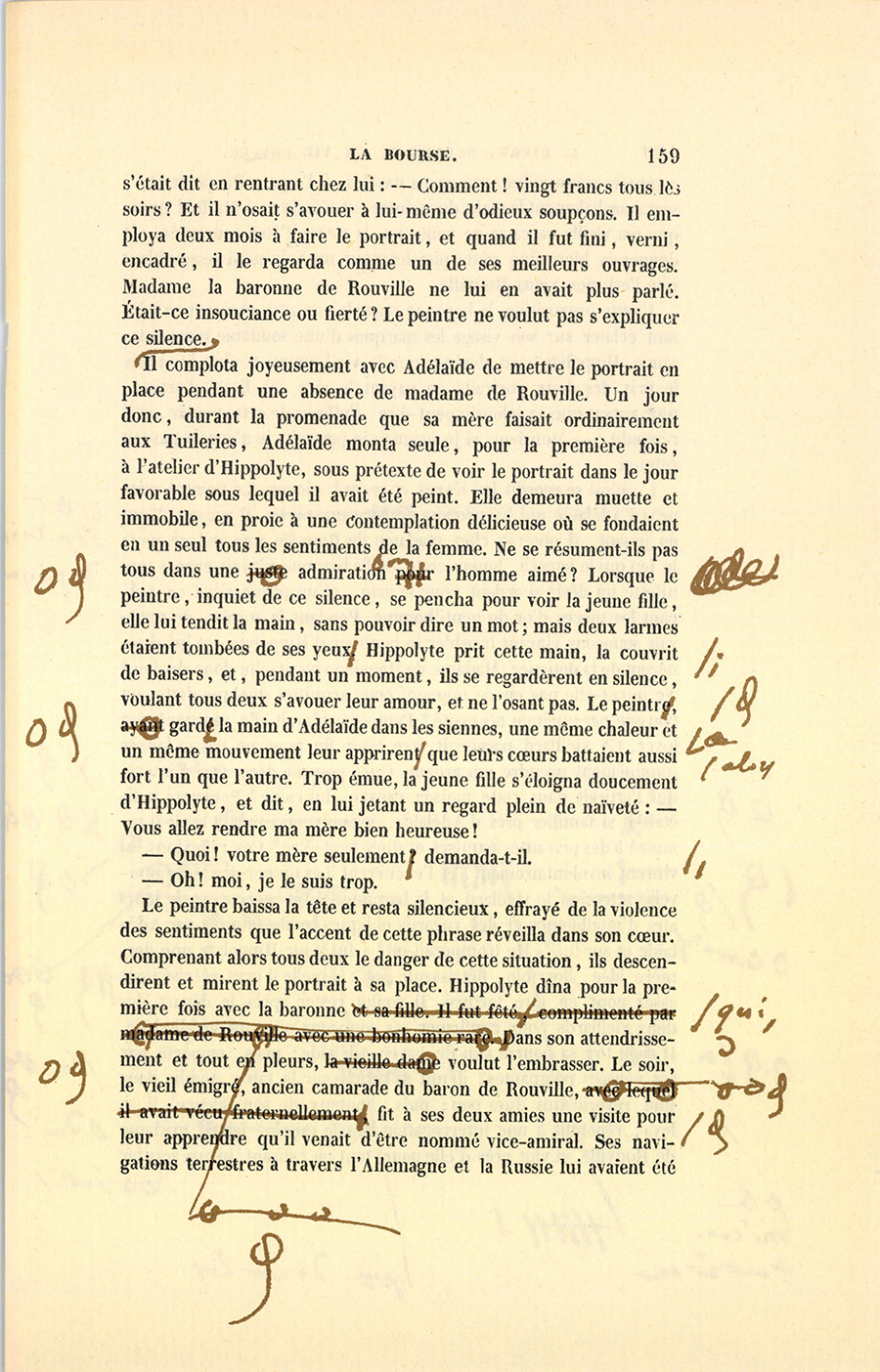 Le peintre baissa la tête et resta silencieux, effrayé de la violence des sentiments que l’accent de cette phrase réveilla dans son cœur. Comprenant alors tous deux le danger de cette situation, ils descendirent et mirent le portrait à sa place. Hippolyte dîna pour la première fois avec la baronne qui, dans son attendrissement et tout en pleurs, voulut l’embrasser. Le soir, le vieil émigré, ancien camarade du baron de Rouville, fit à ses deux amies une visite pour leur apprendre qu’il venait d’être nommé vice-amiral. Ses navigations terrestres à travers l’Allemagne et la Russie lui avaient été {p. 160} comptées comme des campagnes navales. À l’aspect du portrait, il 4 serra cordialement la main du peintre, et s’écria : – Ma foi ! quoique ma vieille carcasse ne vaille pas la peine d’être conservée, je donnerais bien cinq cents pistoles pour me voir aussi ressemblant que l’est mon vieux Rouville.