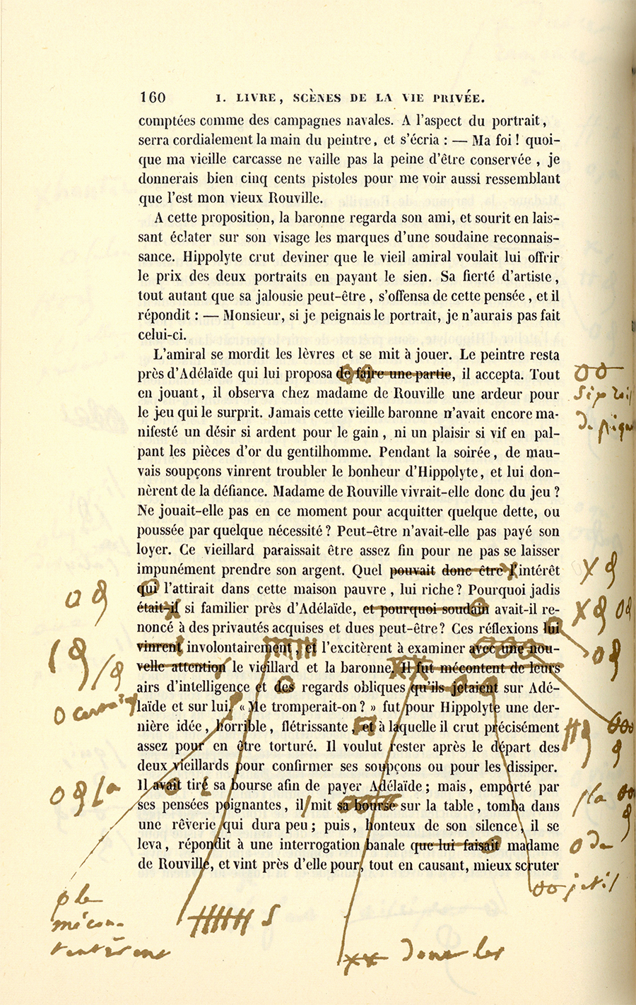 L’amiral se mordit les lèvres et se mit à jouer. Le peintre resta près d’Adélaïde qui lui proposa six rois de piquet, il accepta. Tout en jouant, il observa chez madame de Rouville une ardeur pour le jeu qui le surprit. Jamais cette vieille baronne n’avait encore manifesté un désir si ardent pour le gain, ni un plaisir si vif en palpant les pièces d’or du gentilhomme. Pendant la soirée, de mauvais soupçons vinrent troubler le bonheur d’Hippolyte, et lui donnèrent de la défiance. Madame de Rouville vivrait-elle donc du jeu ? Ne jouait-elle pas en ce moment pour acquitter quelque dette, ou poussée par quelque nécessité ? Peut-être n’avait-elle pas payé son loyer. Ce vieillard paraissait être assez fin pour ne pas se laisser impunément prendre son argent. Quel intérêt l’attirait dans cette maison pauvre, lui riche ? Pourquoi jadis si familier près d’Adélaïde, avait-il renoncé à des privautés acquises et dues peut-être ? Ces réflexions involontaires l’excitèrent à examiner le vieillard et la baronne, dont les airs d’intelligence et certains regards obliques jetés sur Adélaïde et sur lui le mécontentèrent. « Me tromperait-on ? » fut pour Hippolyte une dernière idée, horrible, flétrissante, à laquelle il crut précisément assez pour en être torturé. Il voulut rester après le départ des deux vieillards pour confirmer ses soupçons ou pour les dissiper. Il tira sa bourse afin de payer Adélaïde ; mais, emporté par ses pensées poignantes, il la mit sur la table, tomba dans une rêverie qui dura peu ; puis, honteux de son silence, il se leva, répondit à une interrogation banale de madame de Rouville, et vint près d’elle pour, tout en causant, mieux scruter {p. 161} ce vieux visage. Il sortit en proie à mille incertitudes. Après avoir descendu quelques marches, il rentra pour prendre sa bourse oubliée.