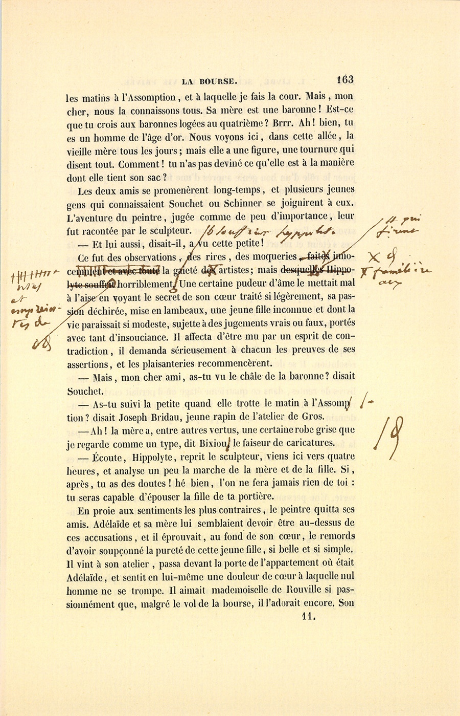 Insensiblement, les confidences commencèrent, et le peintre avoua son amour. Au moment où il parla de la rue de Suresne et d’une jeune personne logée à un quatrième étage : – Halte là ! s’écria gaiement Souchet. C’est une petite fille que je viens voir tous {p. 163} les matins à l’Assomption, et à laquelle je fais la cour. Mais, mon cher, nous la connaissons tous. Sa mère est une baronne ! Est-ce que tu crois aux baronnes logées au quatrième ? Brrr. Ah ! bien, tu es un homme de l’âge d’or. Nous voyons ici, dans cette allée, la vieille mère tous les jours ; mais elle a une figure, une tournure qui disent tout. Comment ! tu n’as pas deviné ce qu’elle est à la manière dont elle tient son sac ?