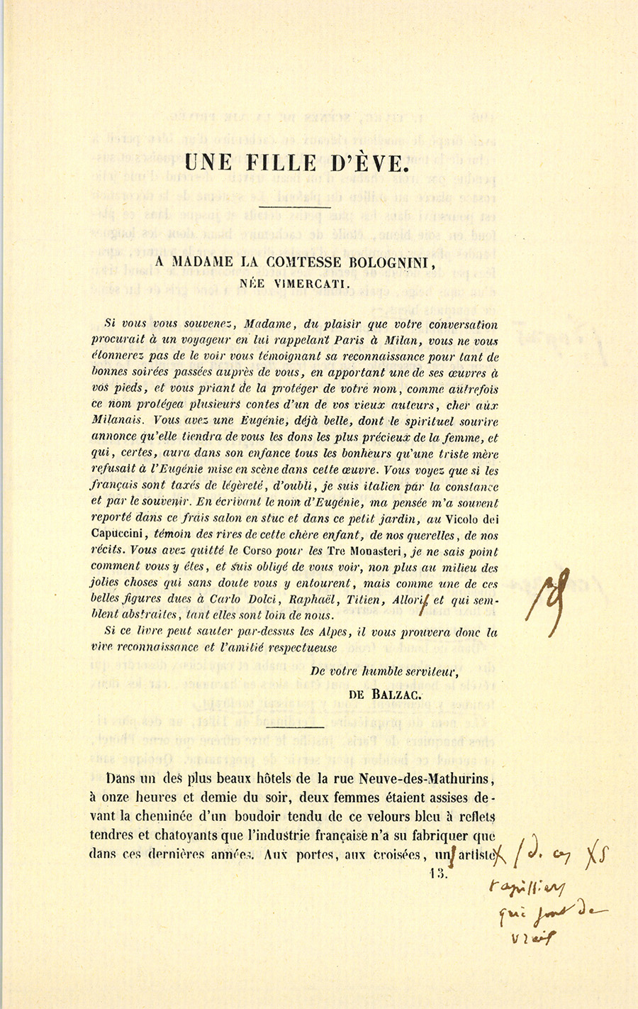 Si vous vous souvenez, Madame, du plaisir que votre conversation procurait à un voyageur en lui rappelant Paris à Milan, vous ne vous étonnerez pas de le voir vous témoignant sa reconnaissance pour tant de bonnes soirées passées auprès de vous, en apportant une de ses œuvres à vos pieds, et vous priant de la protéger de votre nom, comme autrefois ce nom protégea plusieurs contes d’un de vos vieux auteurs, cher aux Milanais. Vous avez une Eugénie, déjà belle, dont le spirituel sourire annonce qu’elle tiendra de vous les dons les plus précieux de la femme, et qui, certes, aura dans son enfance tous les bonheurs qu’une triste mère refusait à l’Eugénie mise en scène dans cette œuvre. Vous voyez que si les français sont taxés de légèreté, d’oubli, je suis italien par la constance et par le souvenir. En écrivant le nom d’Eugénie, ma pensée m’a souvent reporté dans ce frais salon en stuc et dans ce petit jardin, au Vicolo dei Capuccini, témoin des rires de cette chère enfant, de nos querelles, de nos récits. Vous avez quitté le Corso pour les Tre Monasteri, je ne sais point comment vous y êtes, et suis obligé de vous voir, non plus au milieu des jolies choses qui sans doute vous y entourent, mais comme une de ces belles figures dues à Carlo Dolci, Raphaël, Titien, Allori, et qui semblent abstraites, tant elles sont loin de nous.