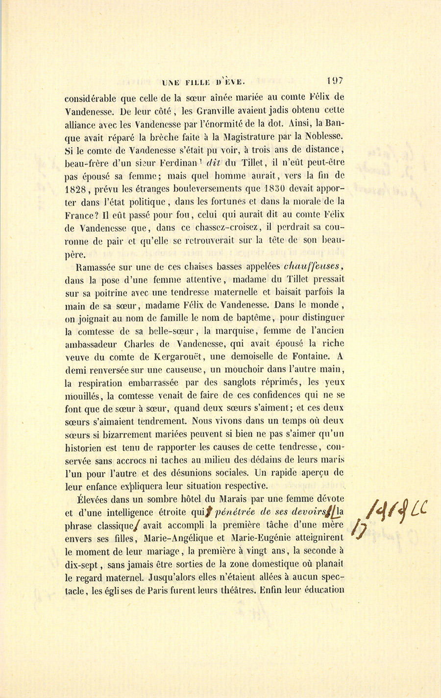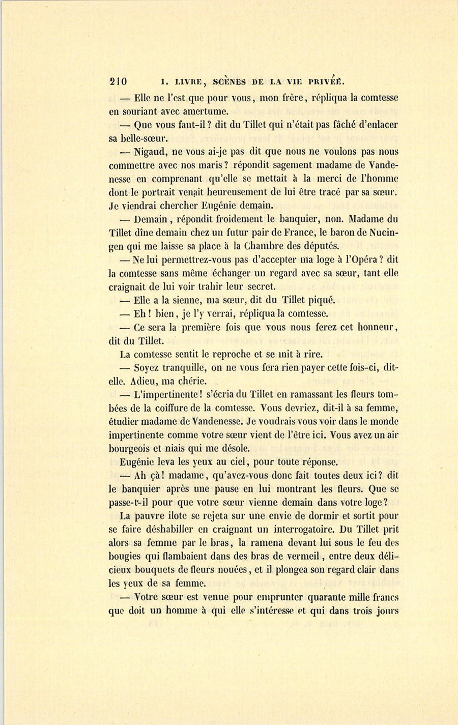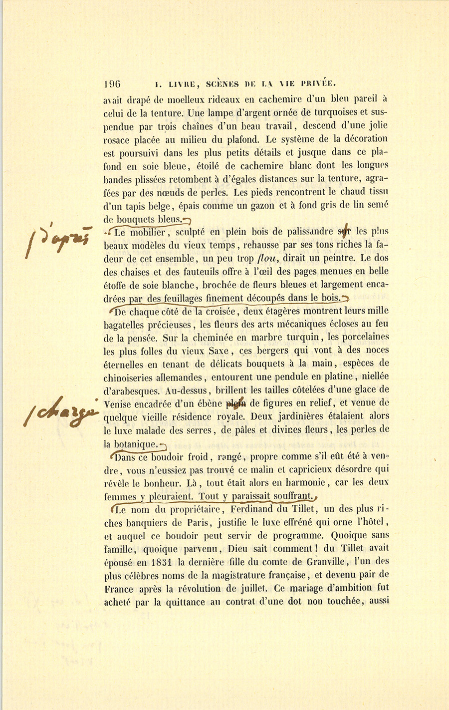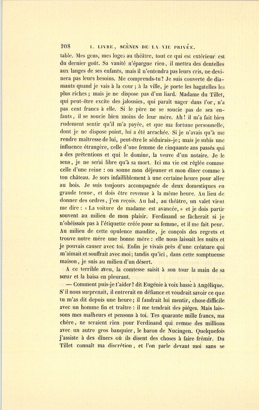 Dans un des plus beaux hôtels de la rue Neuve-des-Mathurins, à onze heures et demie du soir, deux femmes étaient assises devant la cheminée d’un boudoir tendu de ce velours bleu à reflets tendres et chatoyants que l’industrie française n’a su fabriquer que dans ces dernières années. Aux portes, aux croisées, un de ces tapissiers qui sont de vrais artistes {p. 196} avait drapé de moelleux rideaux en cachemire d’un bleu pareil à celui de la tenture. Une lampe d’argent ornée de turquoises et suspendue par trois chaînes d’un beau travail, descend d’une jolie rosace placée au milieu du plafond. Le système de la décoration est poursuivi dans les plus petits détails et jusque dans ce plafond en soie bleue, étoilé de cachemire blanc dont les longues bandes plissées retombent à d’égales distances sur la tenture, agrafées par des nœuds de perles. Les pieds rencontrent le chaud tissu d’un tapis belge, épais comme un gazon et à fond gris de lin semé de bouquets bleus. Le mobilier, sculpté en plein bois de palissandre d’après les plus beaux modèles du vieux temps, rehausse par ses tons riches la fadeur de cet ensemble, un peu trop flou, dirait un peintre. Le dos des chaises et des fauteuils offre à l’œil des pages menues en belle étoffe de soie blanche, brochée de fleurs bleues et largement encadrées par des feuillages finement découpés dans le bois. De chaque côté de la croisée, deux étagères montrent leurs mille bagatelles précieuses, les fleurs des arts mécaniques écloses au feu de la pensée. Sur la cheminée en marbre turquin, les porcelaines les plus folles du vieux Saxe, ces bergers qui vont à des noces éternelles en tenant de délicats bouquets à la main, espèces de chinoiseries allemandes, entourent une pendule en platine, niellée d’arabesques. Au-dessus, brillent les tailles côtelées d’une glace de Venise encadrée d’un ébène chargé de figures en relief, et venue de quelque vieille résidence royale. Deux jardinières étalaient alors le luxe malade des serres, de pâles et divines fleurs, les perles de la botanique. Dans ce boudoir froid, rangé, propre comme s’il eût été à vendre, vous n’eussiez pas trouvé ce malin et capricieux désordre qui révèle le bonheur. Là, tout était alors en harmonie, car les deux femmes y pleuraient. Tout y paraissait souffrant. Le nom du propriétaire, Ferdinand du Tillet, un des plus riches banquiers de Paris, justifie le luxe effréné qui orne l’hôtel, et auquel ce boudoir peut servir de programme. Quoique sans famille, quoique parvenu, Dieu sait comment ! du Tillet avait épousé en 1831 la dernière fille du comte de Granville, l’un des plus célèbres noms de la magistrature française, et devenu pair de France après la révolution de juillet. Ce mariage d’ambition fut acheté par la quittance au contrat d’une dot non touchée, aussi {p. 197} considérable que celle de la sœur aînée mariée au comte Félix de Vandenesse. [ill.] De leur côté, les Granville avaient jadis obtenu cette alliance avec les Vandenesse par l’énormité de la dot. Ainsi, la Banque avait réparé la brèche faite à la Magistrature par la Noblesse. Si le comte de Vandenesse s’était pu voir, à trois ans de distance, beau-frère d’un sieur Ferdinand dit du Tillet, il n’eût peut-être pas épousé sa femme ; mais quel homme aurait, vers la fin de 1828, prévu les étranges bouleversements que 1830 devait apporter dans l’état politique, dans les fortunes et dans la morale de la France ? Il eût passé pour fou, celui qui aurait dit au comte Félix de Vandenesse que, dans ce chassez-croisez, il perdrait sa couronne de pair et qu’elle se retrouverait sur la tête de son beau-père.