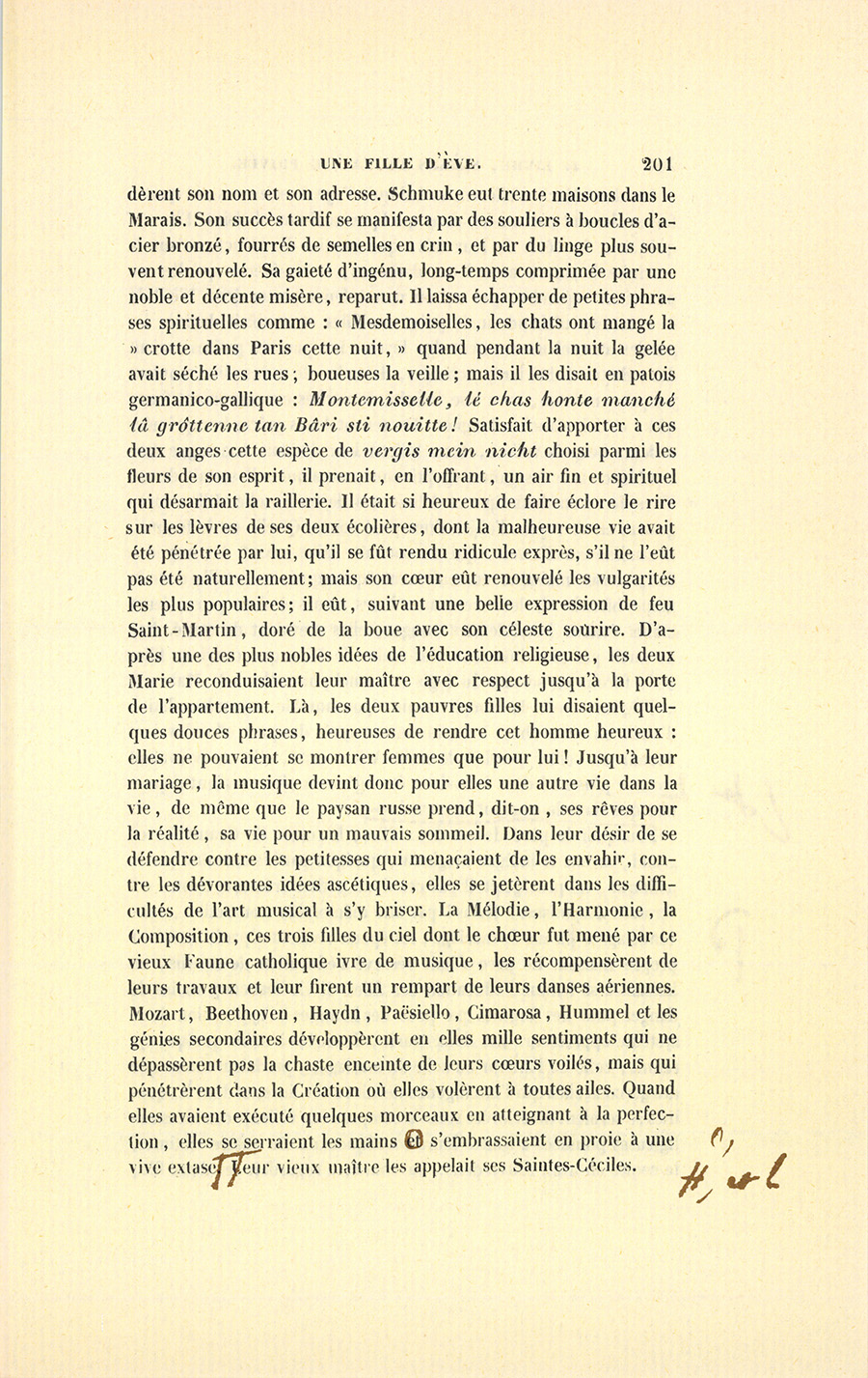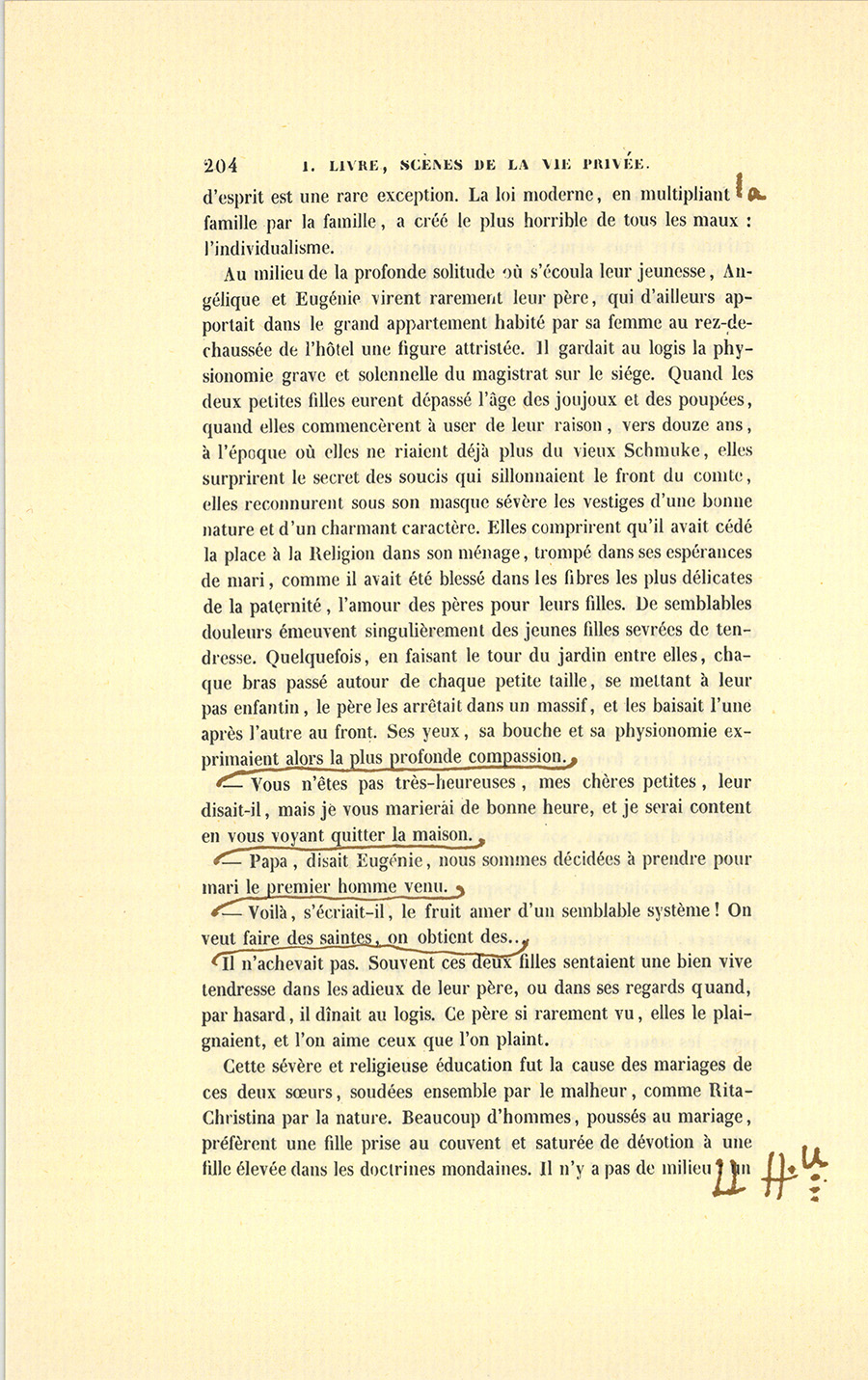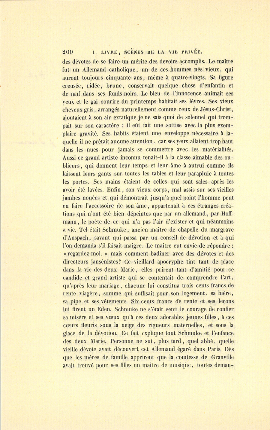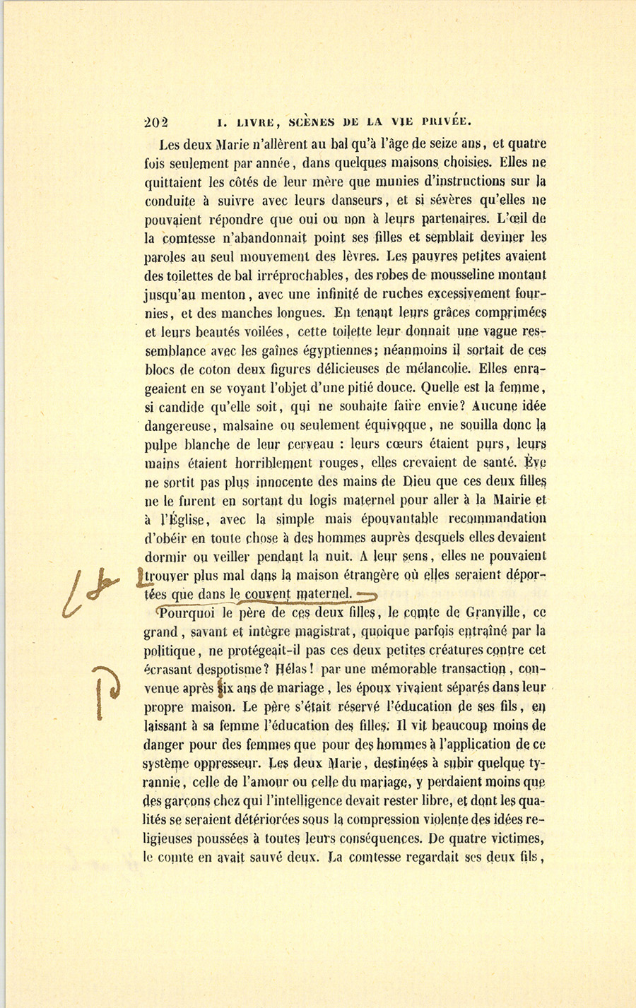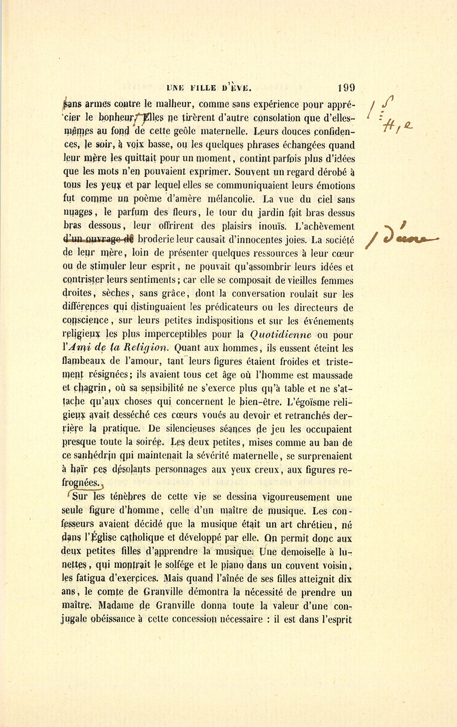 Élevées dans un sombre hôtel du Marais par une femme dévote et d’une intelligence étroite qui pénétrée de ses devoirs (la phrase classique) avait accompli la première tâche d’une mère envers ses filles, Marie-Angélique et Marie-Eugénie atteignirent le moment de leur mariage, la première à vingt ans, la seconde à dix-sept, sans jamais être sorties de la zone domestique où planait le regard maternel. Jusqu’alors elles n’étaient allées à aucun spectacle, les églises de Paris furent leurs théâtres. Enfin leur éducation {p. 198} avait été aussi rigoureuse à l’hôtel de leur mère qu’elle aurait pu l’être dans un cloître. Depuis l’âge de raison, elles avaient toujours couché dans une chambre contiguë à celle de la comtesse de Granville, et dont la porte restait ouverte pendant la nuit. Le temps que ne prenaient pas le soin de leurs personnes, les devoirs religieux ou les études indispensables à des filles bien nées se passait en travaux à l’aiguille faits pour les pauvres, en promenades accomplies dans le genre de celles que se permettent les Anglais, le dimanche, en disant : « N’allons pas si vite, nous aurions l’air de nous amuser. » Leur instruction ne dépassa point les limites imposées par des confesseurs élus parmi les ecclésiastiques les moins tolérants et les plus jansénistes. Jamais filles ne furent livrées à des maris ni plus pures ni plus vierges : leur mère semblait avoir vu dans ce point, assez essentiel d’ailleurs, l’accomplissement de tous ses devoirs envers le ciel et les hommes. Ces deux pauvres créatures n’avaient, avant leur mariage, ni lu des romans ni dessiné autre chose que des figures dont l’anatomie eût paru le chef-d’œuvre de l’impossible à Cuvier, et gravées de manière à féminiser l’Hercule Farnèse lui-même. Une vieille fille leur apprit le dessin. Un respectable prêtre leur enseigna la grammaire, la langue française, l’histoire, la géographie et le peu d’arithmétique nécessaire aux femmes. Leurs lectures, choisies dans les livres autorisés, comme les Lettres édifiantes et les Leçons de Littérature de Noël, se faisaient le soir à haute voix, mais en compagnie du directeur de leur mère, car il pouvait s’y rencontrer des passages qui, sans de sages commentaires, eussent éveillé leur imagination. Le Télémaque de Fénelon parut dangereux. La comtesse de Granville aimait assez ses filles pour en vouloir faire des anges à la façon de Marie Alacoque, mais ses filles auraient préféré une mère moins vertueuse et plus aimable. Cette éducation porta ses fruits. Imposée comme un joug et présentée sous des formes austères, la Religion lassa de ses pratiques ces jeunes cœurs innocents, traités comme s’ils eussent été criminels ; elle y comprima les sentiments, et quoiqu’elle y jetât de profondes racines, elle ne fut pas aimée. Les deux Marie devaient ou devenir imbéciles ou souhaiter leur indépendance, elles souhaitèrent de se marier dès qu’elles purent entrevoir le monde et comparer quelques idées ; mais leurs grâces touchantes et leur valeur, elles l’ignorèrent. Elles ignoraient leur propre candeur, comment auraient-elles su la vie ? {p. 199} Sans armes contre le malheur, comme sans expérience pour apprécier le bonheur, elles ne tirèrent d’autre consolation que d’elles-mêmes au fond de cette geôle maternelle. Leurs douces confidences, le soir, à voix basse, ou les quelques phrases échangées quand leur mère les quittait pour un moment, contint parfois plus d’idées que les mots n’en pouvaient exprimer. Souvent un regard dérobé à tous les yeux et par lequel elles se communiquaient leurs émotions fut comme un poème d’amère mélancolie. La vue du ciel sans nuages, le parfum des fleurs, le tour du jardin fait bras dessus bras dessous, leur offrirent des plaisirs inouïs. L’achèvement d’une broderie leur causait d’innocentes joies. La société de leur mère, loin de présenter quelques ressources à leur cœur ou de stimuler leur esprit, ne pouvait qu’assombrir leurs idées et contrister leurs sentiments ; car elle se composait de vieilles femmes droites, sèches, sans grâce, dont la conversation roulait sur les différences qui distinguaient les prédicateurs ou les directeurs de conscience, sur leurs petites indispositions et sur les événements religieux les plus imperceptibles pour la Quotidienne ou pour l’Ami de la Religion. Quant aux hommes, ils eussent éteint les flambeaux de l’amour, tant leurs figures étaient froides et tristement résignées ; ils avaient tous cet âge où l’homme est maussade et chagrin, où sa sensibilité ne s’exerce plus qu’à table et ne s’attache qu’aux choses qui concernent le bien-être. L’égoïsme religieux avait desséché ces cœurs voués au devoir et retranchés derrière la pratique. De silencieuses séances de jeu les occupaient presque toute la soirée. Les deux petites, mises comme au ban de ce sanhédrin qui maintenait la sévérité maternelle, se surprenaient à haïr ces désolants personnages aux yeux creux, aux figures refrognées. Sur les ténèbres de cette vie se dessina vigoureusement une seule figure d’homme, celle d’un maître de musique. Les confesseurs avaient décidé que la musique était un art chrétien, né dans l’Église catholique et développé par elle. On permit donc aux deux petites filles d’apprendre la musique. Une demoiselle à lunettes, qui montrait le solfége et le piano dans un couvent voisin, les fatigua d’exercices. Mais quand l’aînée de ses filles atteignit dix ans, le comte de Granville démontra la nécessité de prendre un maître. Madame de Granville donna toute la valeur d’une conjugale obéissance à cette concession nécessaire : il est dans l’esprit {p. 200} des dévotes de se faire un mérite des devoirs accomplis. Le maître fut un Allemand catholique, un de ces hommes nés vieux