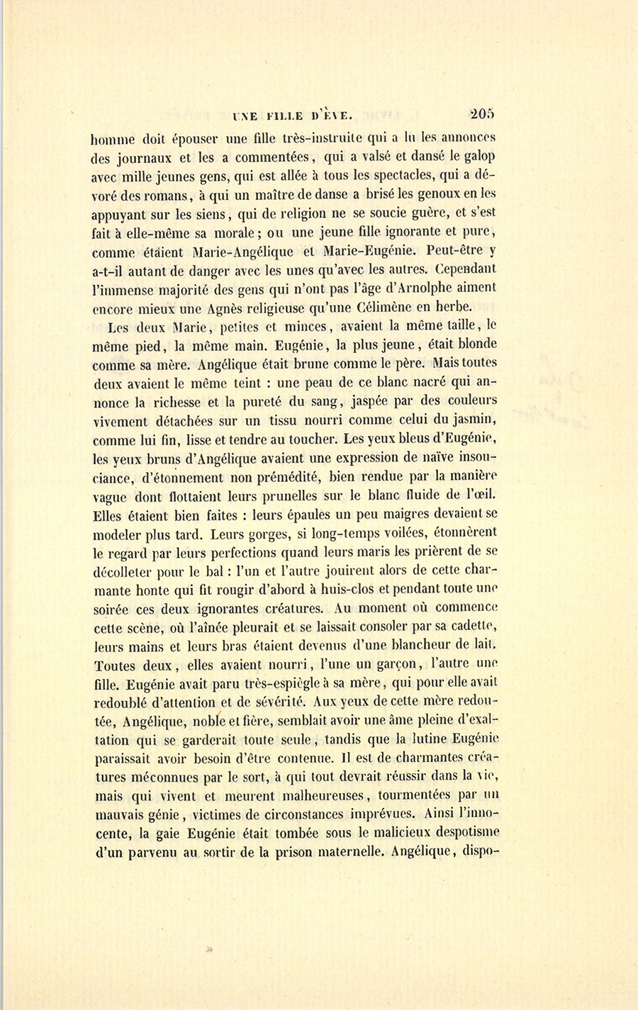 Les deux Marie, petites et minces, avaient la même taille, le même pied, la même main. Eugénie, la plus jeune, était blonde comme sa mère. Angélique était brune comme le père. Mais toutes deux avaient le même teint : une peau de ce blanc nacré qui annonce la richesse et la pureté du sang, jaspée par des couleurs vivement détachées sur un tissu nourri comme celui du jasmin, comme lui fin, lisse et tendre au toucher. Les yeux bleus d’Eugénie, les yeux bruns d’Angélique avaient une expression de naïve insouciance, d’étonnement non prémédité, bien rendue par la manière vague dont flottaient leurs prunelles sur le blanc fluide de l’œil. Elles étaient bien faites : leurs épaules un peu maigres devaient se modeler plus tard. Leurs gorges, si long-temps voilées, étonnèrent le regard par leurs perfections quand leurs maris les prièrent de se décolleter pour le bal : l’un et l’autre jouirent alors de cette charmante honte qui fit rougir d’abord à huis-clos et pendant toute une soirée ces deux ignorantes créatures. Au moment où commence cette scène, où l’aînée pleurait et se laissait consoler par sa cadette, leurs mains et leurs bras étaient devenus d’une blancheur de lait. Toutes deux, elles avaient nourri, l’une un garçon, l’autre une fille. Eugénie avait paru très-espiègle à sa mère, qui pour elle avait redoublé d’attention et de sévérité. Aux yeux de cette mère redoutée, Angélique, noble et fière, semblait avoir une âme pleine d’exaltation qui se garderait toute seule, tandis que la lutine Eugénie paraissait avoir besoin d’être contenue. Il est de charmantes créatures méconnues par le sort, à qui tout devrait réussir dans la vie, mais qui vivent et meurent malheureuses, tourmentées par un mauvais génie, victimes de circonstances imprévues. Ainsi l’innocente, la gaie Eugénie était tombée sous le malicieux despotisme d’un parvenu au sortir de la prison maternelle. Angélique, {p. 206} disposée aux grandes luttes du sentiment, avait été jetée dans les plus hautes sphères de la société parisienne, la bride sur le cou.