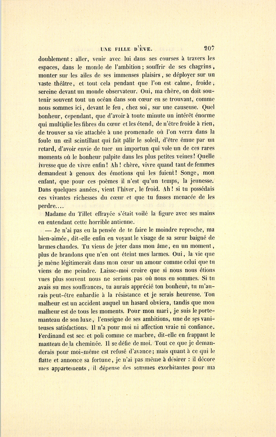 – Je n’ai pas eu la pensée de te faire le moindre reproche, ma bien-aimée, dit-elle enfin en voyant le visage de sa sœur baigné de larmes chaudes. Tu viens de jeter dans mon âme, en un moment, plus de brandons que n’en ont éteint mes larmes. Oui, la vie que je mène légitimerait dans mon cœur un amour comme celui que tu viens de me peindre. Laisse-moi croire que si nous nous étions vues plus souvent nous ne serions pas où nous en sommes. Si tu avais su mes souffrances, tu aurais apprécié ton bonheur, tu m’aurais peut-être enhardie à la résistance et je serais heureuse. Ton malheur est un accident auquel un hasard obviera, tandis que mon malheur est de tous les moments. Pour mon mari, je suis le portemanteau de son luxe, l’enseigne de ses ambitions, une de ses vaniteuses satisfactions. Il n’a pour moi ni affection vraie ni confiance. Ferdinand est sec et poli comme ce marbre, dit-elle en frappant le manteau de la cheminée. Il se défie de moi. Tout ce que je demanderais pour moi-même est refusé d’avance ; mais quant à ce qui le flatte et annonce sa fortune, je n’ai pas même à désirer : il décore mes appartements, il dépense des sommes exorbitantes pour ma {p. 208} table. Mes gens, mes loges au théâtre, tout ce qui est extérieur est du dernier goût. Sa vanité n’épargne rien, il mettra des dentelles aux langes de ses enfants, mais il n’entendra pas leurs cris, ne devinera pas leurs besoins. Me comprends-tu ? Je suis couverte de diamants quand je vais à la cour ; à la ville, je porte les bagatelles les plus riches ; mais je ne dispose pas d’un liard. Madame du Tillet, qui peut-être excite des jalousies, qui paraît nager dans l’or, n’a pas cent francs à elle. Si le père ne se soucie pas de ses enfants, il se soucie bien moins de leur mère. Ah ! il m’a fait bien rudement sentir qu’il m’a payée, et que ma fortune personnelle, dont je ne dispose point, lui a été arrachée. Si je n’avais qu’à me rendre maîtresse de lui, peut-être le séduirais-je ; mais je subis une influence étrangère, celle d’une femme de cinquante ans passés qui a des prétentions et qui le domine, la veuve d’un notaire. Je le sens, je ne serai libre qu’à sa mort. Ici ma vie est réglée comme celle d’une reine : on sonne mon déjeuner et mon dîner comme à ton château. Je sors infailliblement à une certaine heure pour aller au bois. Je suis toujours accompagnée de deux domestiques en grande tenue, et dois être revenue à la même heure. Au lieu de donner des ordres, j’en reçois. Au bal, au théâtre, un valet vient me dire : « La voiture de madame est avancée », et je dois partir souvent au milieu de mon plaisir. Ferdinand se fâcherait si je n’obéissais pas à l’étiquette créée pour sa femme, et il me fait peur. Au milieu de cette opulence maudite, je conçois des regrets et trouve notre mère une bonne mère : elle nous laissait les nuits et je pouvais causer avec toi. Enfin je vivais près d’une créature qui m’aimait et souffrait avec moi ; tandis qu’ici, dans cette somptueuse maison, je suis au milieu d’un désert.
