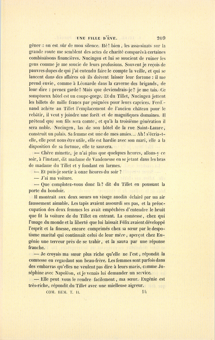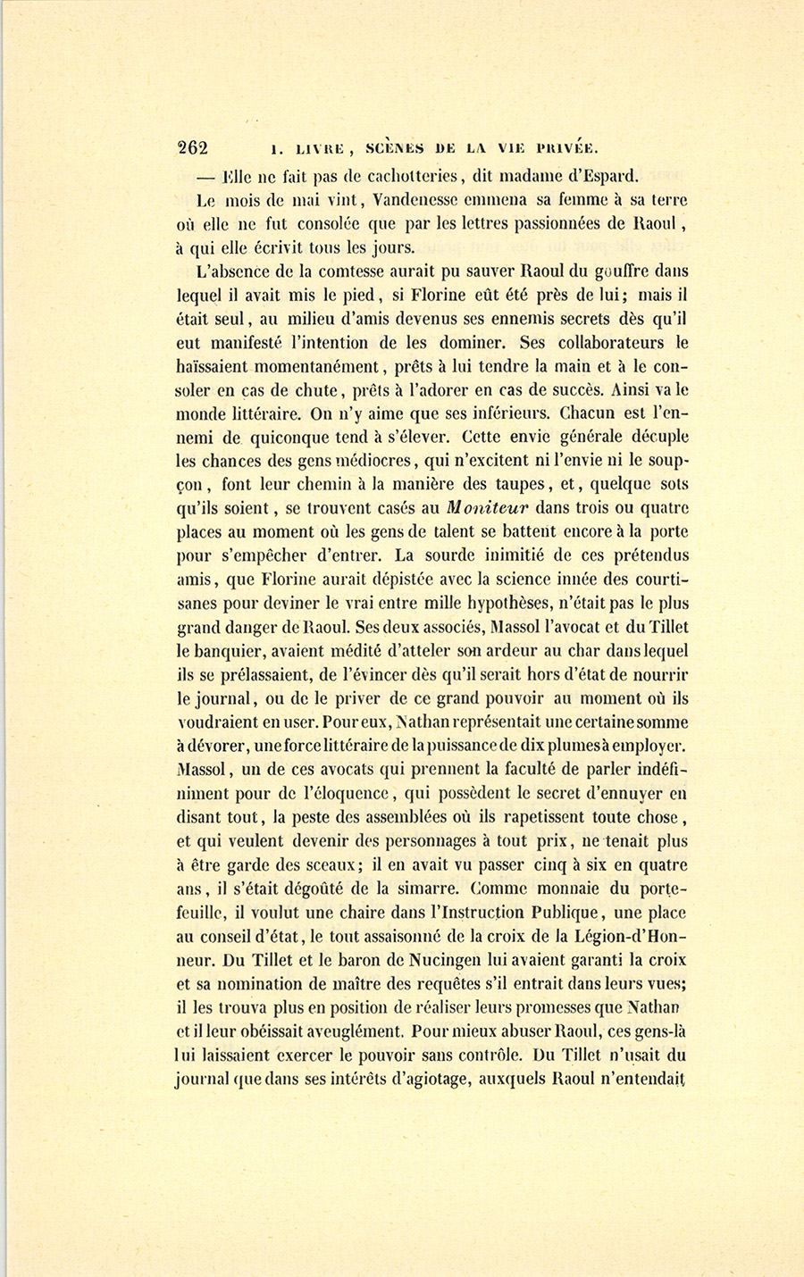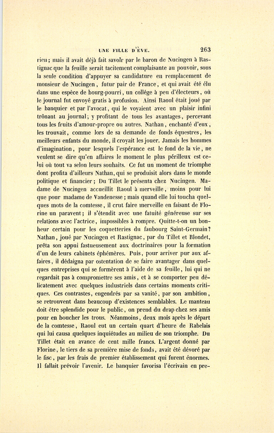 {p. 291} – Voulez-vous de lui pour victime ? vous l’épouvanterez, dit le comte en continuant sans faire attention au visage de sa femme. Je vous mettrai à même de lui prouver qu’il est joué comme un enfant par votre beau-frère du Tillet. Ce misérable veut le faire mettre en prison, afin de le rendre incapable de se porter son concurrent dans le collége électoral où Nucingen a été nommé. Je sais par un ami de Florine la somme produite par la vente de son mobilier, qu’elle lui a donnée pour fonder son journal, je sais ce qu’elle lui a envoyé sur la récolte qu’elle est allée faire cette année dans les départements et en Belgique ; argent qui profite en définitif à Du Tillet, à Nucingen, à Massol. Tous trois, par avance, ils ont vendu le journal au ministère, tant ils sont sûrs d’évincer ce grand homme.