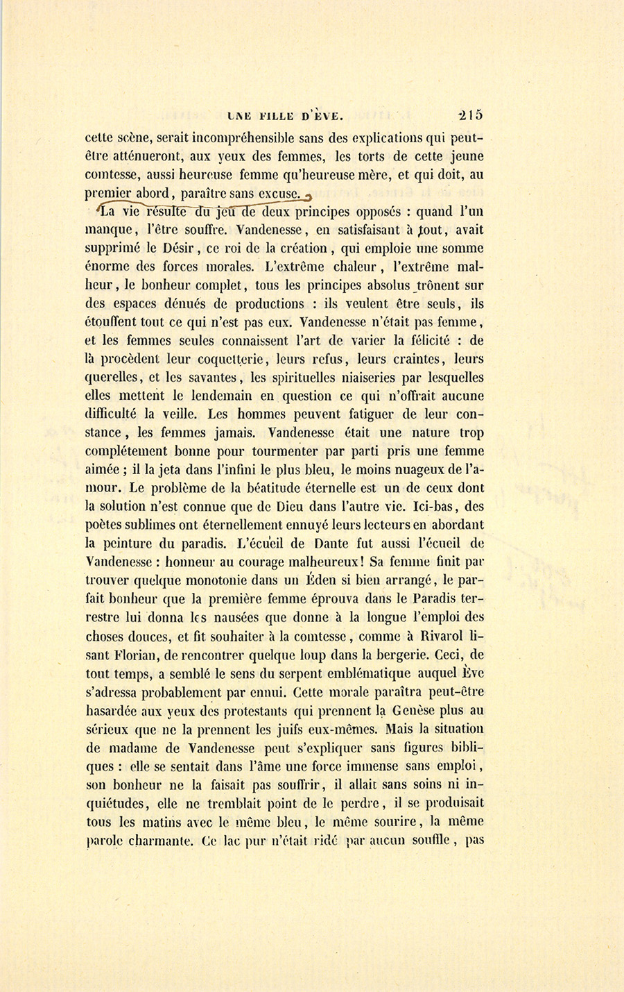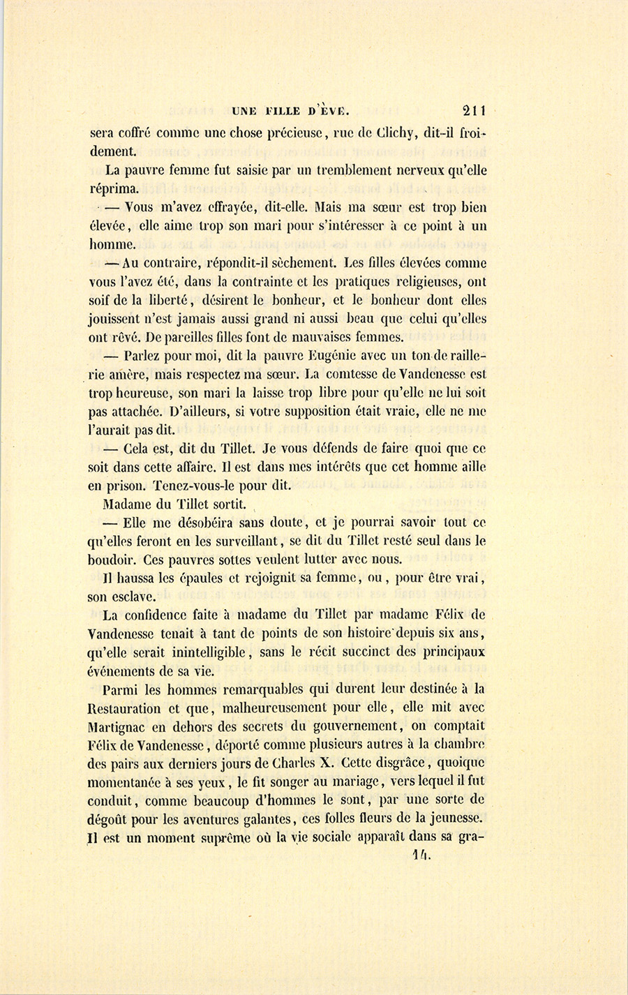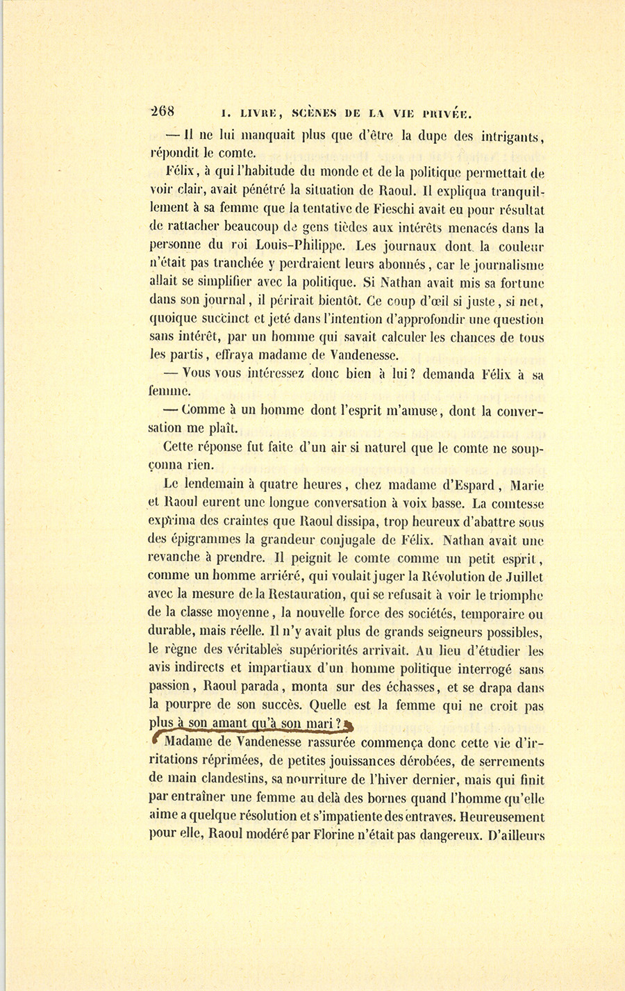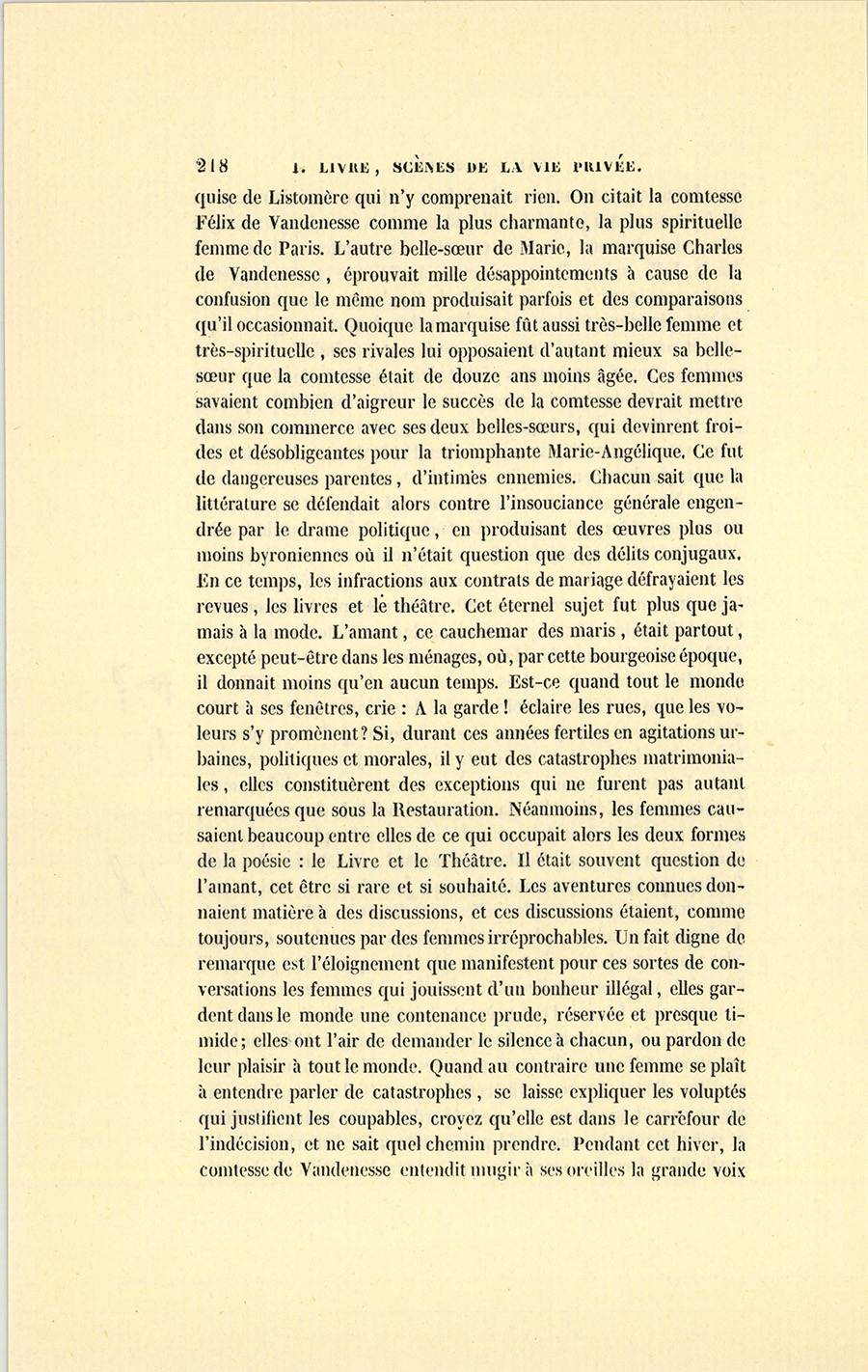 « – On vivotte avec son mari, ma chère, on ne vit qu’avec son amant, lui disait sa belle-sœur, la marquise de Vandenesse. – Le mariage, mon enfant, est notre purgatoire ; l’amour est le paradis, disait lady Dudley. – Ne la croyez pas, s’écriait mademoiselle des Touches, c’est l’enfer. – Mais c’est un enfer où l’on aime, faisait observer la marquise de Rochefide. On a souvent plus de plaisir dans la souffrance que dans le bonheur, voyez les martyrs ? – Avec un mari, petite niaise, nous vivons pour ainsi dire de notre vie ; mais aimer, c’est vivre de la vie d’un autre, lui disait la marquise d’Espard. – Un amant, c’est le fruit défendu, mot qui pour moi résume tout ! » disait en riant la jolie Moïna de Saint-Héréen. Quand elle n’allait pas à des raoûts diplomatiques ou au bal chez quelques riches étrangers, comme lady Dudley ou la princesse Galathionne, la comtesse allait presque tous les soirs dans le monde, après les Italiens ou l’Opéra, soit chez la marquise d’Espard, soit chez madame de Listomère, mademoiselle des Touches, la comtesse de Montcornet ou la vicomtesse de Grandlieu, les seules maisons aristocratiques ouvertes ; et jamais elle n’en sortait sans que de mauvaises graines n’eussent été semées dans son cœur. On lui parlait de compléter sa vie, un mot à la mode dans ce temps-là ; d’être comprise, autre mot auquel les femmes donnent d’étranges significations. Elle revenait chez elle inquiète, émue, curieuse, pensive. Elle trouvait je ne sais quoi de moins dans sa vie, mais elle n’allait pas jusqu’à la voir déserte.