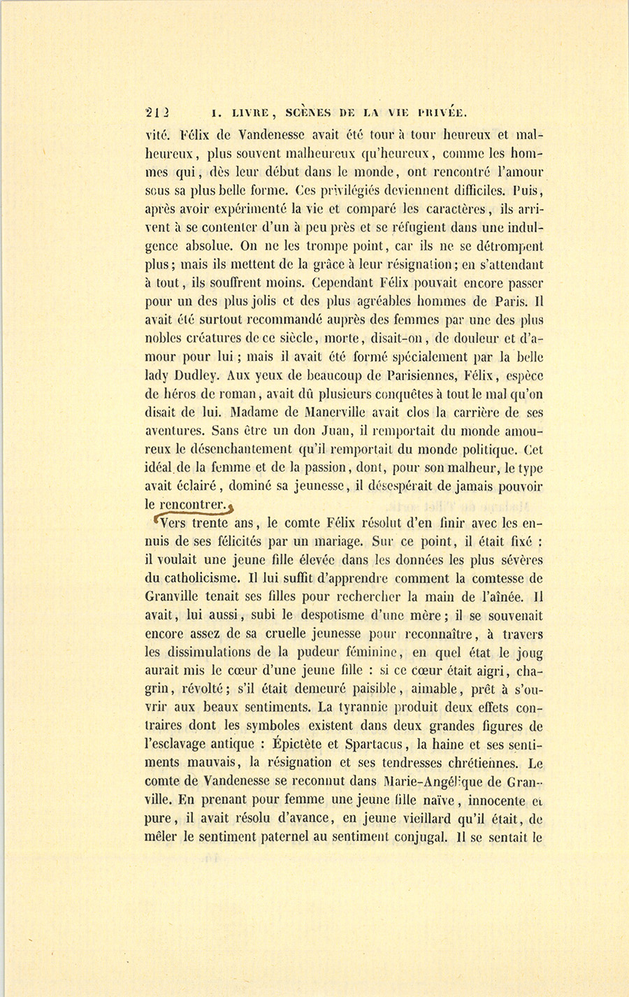 Parmi les hommes remarquables qui durent leur destinée à la Restauration et que, malheureusement pour elle, elle mit avec Martignac en dehors des secrets du gouvernement, on comptait Félix de Vandenesse, déporté comme plusieurs autres à la chambre des pairs aux derniers jours de Charles X. Cette disgrâce, quoique momentanée à ses yeux, le fit songer au mariage, vers lequel il fut conduit, comme beaucoup d’hommes le sont, par une sorte de dégoût pour les aventures galantes, ces folles fleurs de la jeunesse. Il est un moment suprême où la vie sociale apparaît dans sa {p. 212} gravité. Félix de Vandenesse avait été tour à tour heureux et malheureux, plus souvent malheureux qu’heureux, comme les hommes qui, dès leur début dans le monde, ont rencontré l’amour sous sa plus belle forme. Ces privilégiés deviennent difficiles. Puis, après avoir expérimenté la vie et comparé les caractères, ils arrivent à se contenter d’un à peu près et se réfugient dans une indulgence absolue. On ne les trompe point, car ils ne se détrompent plus ; mais ils mettent de la grâce à leur résignation ; en s’attendant à tout, ils souffrent moins. Cependant Félix pouvait encore passer pour un des plus jolis et des plus agréables hommes de Paris. Il avait été surtout recommandé auprès des femmes par une des plus nobles créatures de ce siècle, morte, disait-on, de douleur et d’amour pour lui ; mais il avait été formé spécialement par la belle lady Dudley. Aux yeux de beaucoup de Parisiennes, Félix, espèce de héros de roman, avait dû plusieurs conquêtes à tout le mal qu’on disait de lui. Madame de Manerville avait clos la carrière de ses aventures. Sans être un don Juan, il remportait du monde amoureux le désenchantement qu’il remportait du monde politique. Cet idéal de la femme et de la passion, dont, pour son malheur, le type avait éclairé, dominé sa jeunesse, il désespérait de jamais pouvoir le rencontrer. Vers trente ans, le comte Félix résolut d’en finir avec les ennuis de ses félicités par un mariage. Sur ce point, il était fixé : il voulait une jeune fille élevée dans les données les plus sévères du catholicisme. Il lui suffit d’apprendre comment la comtesse de Granville tenait ses filles pour rechercher la main de l’aînée. Il avait, lui aussi, subi le despotisme d’une mère ; il se souvenait encore assez de sa cruelle jeunesse pour reconnaître, à travers les dissimulations de la pudeur féminine, en quel état le joug aurait mis le cœur d’une jeune fille : si ce cœur était aigri, chagrin, révolté ; s’il était demeuré paisible, aimable, prêt à s’ouvrir aux beaux sentiments. La tyrannie produit deux effets contraires dont les symboles existent dans deux grandes figures de l’esclavage antique : Épictète et Spartacus, la haine et ses sentiments mauvais, la résignation et ses tendresses chrétiennes. Le comte de Vandenesse se reconnut dans Marie-Angélique de Granville. En prenant pour femme une jeune fille naïve, innocente et pure, il avait résolu d’avance, en jeune vieillard qu’il était, de mêler le sentiment paternel au sentiment conjugal. Il se sentait le {p. 213} cœur desséché par le monde, par la politique, et savait qu’en échange d’une vie adolescente, il allait donner les restes d’une vie usée. Auprès des fleurs du printemps, il mettrait les glaces de l’hiver, l’expérience chenue auprès de la pimpante, de l’insouciante imprudence. Après avoir ainsi jugé sainement sa position, il se cantonna dans ses quartiers conjugaux avec d’amples provisions. L’indulgence et la confiance furent les deux ancres sur lesquelles il s’amarra. Les mères de famille devraient rechercher de pareils hommes pour leurs filles : l’Esprit est protecteur comme la Divinité, le Désenchantement est perspicace comme un chirurgien, l’Expérience est prévoyante comme une mère. Ces trois sentiments sont les vertus théologales du mariage. Les recherches, les délices que ses habitudes d’homme à bonnes fortunes et d’homme élégant avaient apprises à Félix de Vandenesse, les enseignements de la haute politique, les observations de sa vie tour à tour occupée, pensive, littéraire, toutes ses forces furent employées à rendre sa femme heureuse, et il y appliqua son esprit. Au sortir du purgatoire maternel, Marie-Angélique monta tout à coup au paradis conjugal que lui avait élevé Félix, rue du Rocher, dans un hôtel où les moindres choses avaient un parfum d’aristocratie, mais où le vernis de la bonne compagnie ne gênait pas cet harmonieux laissez-aller que souhaitent les cœurs aimants et jeunes. Marie-Angélique savoura d’abord les jouissances de la vie matérielle dans leur entier, son mari se fit pendant deux ans son intendant. Félix expliqua lentement et avec beaucoup d’art à sa femme les choses de la vie, l’initia par degrés aux mystères de la haute société, lui apprit les généalogies de toutes les maisons nobles, lui enseigna le monde, la guida dans l’art de la toilette et de la conversation, la mena de théâtre en théâtre, lui fit faire un cours de littérature et d’histoire. Il acheva cette éducation avec un soin d’amant, de père, de maître et de mari ; mais avec une sobriété bien entendue, il ménageait les jouissances et les leçons, sans détruire les idées religieuses. Enfin, il s’acquitta de son entreprise en grand maître. Au bout de quatre années, il eut le bonheur d’avoir formé dans la comtesse de Vandenesse une des femmes les plus aimables et les plus remarquables du temps actuel. Marie-Angélique éprouva précisément pour Félix le sentiment que Félix souhaitait de lui inspirer : une amitié vraie, une reconnaissance bien sentie, un amour fraternel qui se mélangeait {p. 214} à propos de tendresse noble et digne comme elle doit être entre mari et femme. Elle était mère, et bonne mère. Félix s’attachait 