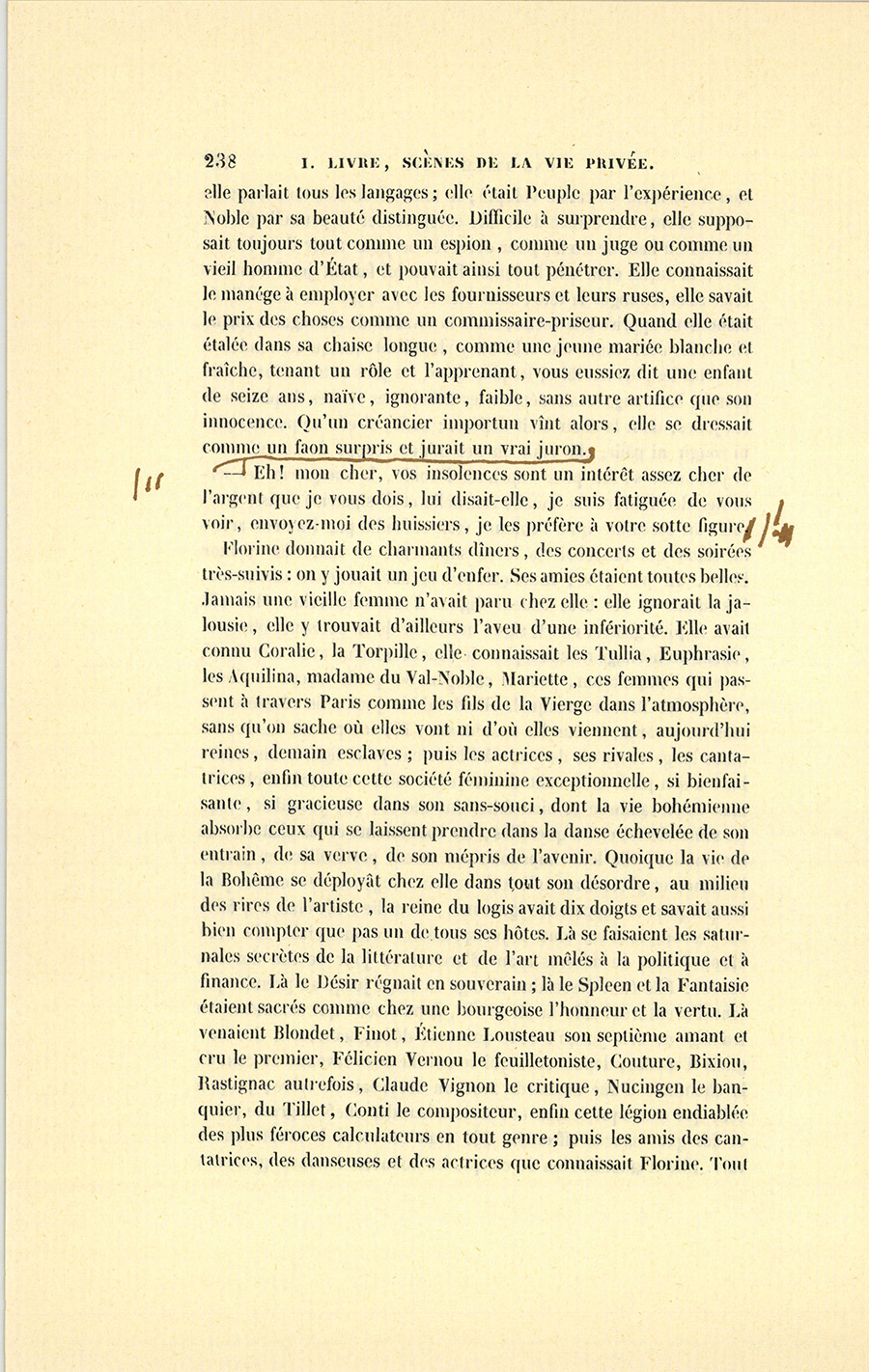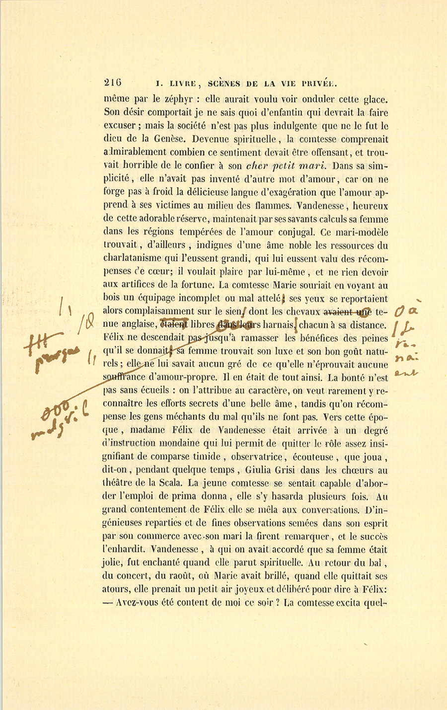 – Sûre, reprit Vandenesse. Reste masquée, je te fais souper avec Nathan et Florine : il sera bien amusant pour une femme de ton rang d’intriguer une actrice après avoir fait caracoler l’esprit d’un homme célèbre autour de secrets si importants ; tu les attelleras l’un et l’autre à la même mystification. Je vais me mettre à la piste des infidélités de Nathan. Si je puis saisir les détails de quelque aventure récente, tu jouiras d’une colère de courtisane, une chose magnifique, celle à laquelle se livrera Florine bouillonnera comme un torrent des Alpes : elle adore Nathan, il est tout pour elle ; elle y tient comme la chair aux os, comme la lionne à ses petits. Je me souviens d’avoir vu dans ma jeunesse une célèbre actrice qui écrivait comme une cuisinière venant redemander ses lettres à un de mes amis ; je n’ai jamais depuis retrouvé ce spectacle, cette fureur {p. 292} tranquille, cette impertinente majesté, cette attitude de sauvage… Souffres-tu, Marie ?