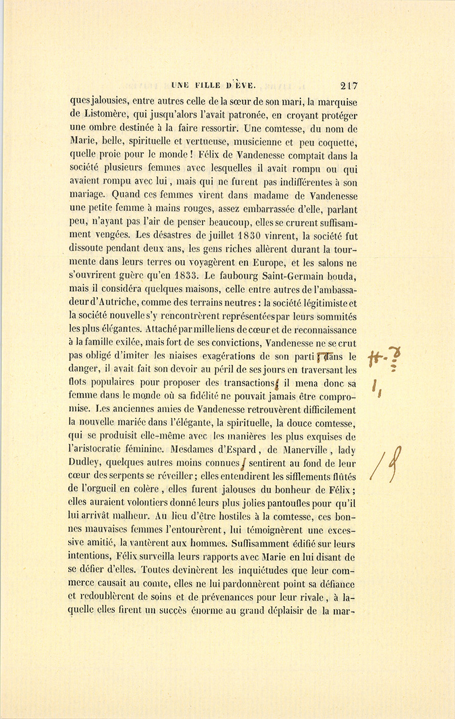 La comtesse excita {p. 217} quelques jalousies, entre autres celle de la sœur de son mari, la marquise de Listomère, qui jusqu’alors l’avait patronnée, en croyant protéger une ombre destinée à la faire ressortir. Une comtesse, du nom de Marie, belle, spirituelle et vertueuse, musicienne et peu coquette, quelle proie pour le monde ! Félix de Vandenesse comptait dans la société plusieurs femmes avec lesquelles il avait rompu ou qui avaient rompu avec lui, mais qui ne furent pas indifférentes à son mariage. Quand ces femmes virent dans madame de Vandenesse une petite femme à mains rouges, assez embarrassée d’elle, parlant peu, n’ayant pas l’air de penser beaucoup, elles se crurent suffisamment vengées. Les désastres de juillet 1830 vinrent, la société fut dissoute pendant deux ans, les gens riches allèrent durant la tourmente dans leurs terres ou voyagèrent en Europe, et les salons ne s’ouvrirent guère qu’en 1833. Le faubourg Saint-Germain bouda, mais il considéra quelques maisons, celle entre autres de l’ambassadeur d’Autriche, comme des terrains neutres : la société légitimiste et la société nouvelle s’y rencontrèrent représentées par leurs sommités les plus élégantes. Attaché par mille liens de cœur et de reconnaissance à la famille exilée, mais fort de ses convictions, Vandenesse ne se crut pas obligé d’imiter les niaises exagérations de son parti. Dans le danger, il avait fait son devoir au péril de ses jours en traversant les flots populaires pour proposer des transactions, il mena donc sa femme dans le monde où sa fidélité ne pouvait jamais être compromise. Les anciennes amies de Vandenesse retrouvèrent difficilement la nouvelle mariée dans l’élégante, la spirituelle, la douce comtesse, qui se produisit elle-même avec les manières les plus exquises de l’aristocratie féminine. Mesdames d’Espard, de Manerville, lady Dudley, quelques autres moins connues sentirent au fond de leur cœur des serpents se réveiller ; elles entendirent les sifflements flûtés de l’orgueil en colère, elles furent jalouses du bonheur de Félix ; elles auraient volontiers donné leurs plus jolies pantoufles pour qu’il lui arrivât malheur. Au lieu d’être hostiles à la comtesse, ces bonnes mauvaises femmes l’entourèrent, lui témoignèrent une excessive amitié, la vantèrent aux hommes. Suffisamment édifié sur leurs intentions, Félix surveilla leurs rapports avec Marie en lui disant de se défier d’elles. Toutes devinèrent les inquiétudes que leur commerce causait au comte, elles ne lui pardonnèrent point sa défiance et redoublèrent de soins et de prévenances pour leur rivale, à laquelle elles firent un succès énorme au grand déplaisir de la {p. 218} marquise de Listomère qui n’y comprenait rien. On citait la comtesse Félix de Vandenesse comme la plus charmante, la plus spirituelle femme de Paris. L’autre belle-sœur de Marie, la marquise Charles de Vandenesse, éprouvait mille désappointements à cause de la confusion que le même nom produisait parfois et des comparaisons qu’il occasionnait. Quoique la marquise fût aussi très-belle femme et très-spirituelle, ses rivales lui opposaient d’autant mieux sa belle-sœur que la comtesse était de douze ans moins âgée. Ces femmes savaient combien d’aigreur le succès de la comtesse devrait mettre dans son commerce avec ses deux belles-sœurs, qui devinrent froides et désobligeantes pour la triomphante Marie-Angélique. Ce fut de dangereuses parentes, d’intimes ennemies. Chacun sait que la littérature se défendait alors contre l’insouciance générale engendrée par le drame politique, en produisant des œuvres plus ou moins byroniennes où il n’était question que des délits conjugaux. En ce temps, les infractions aux contrats de mariage défrayaient les revues, les livres et le théâtre. Cet éternel sujet fut plus que jamais à la mode. L’amant, ce cauchemar des maris, était partout, excepté peut-être dans les ménages, où, par cette bourgeoise époque, il donnait moins qu’en aucun temps. Est-ce quand tout le monde court à ses fenêtres, crie : À la garde ! éclaire les rues, que les voleurs s’y promènent ? Si, durant ces années fertiles en agitations urbaines, politiques et morales, il y eut des catastrophes matrimoniales, elles constituèrent des exceptions qui ne furent pas autant remarquées que sous la Restauration. Néanmoins, les femmes causaient beaucoup entre elles de ce qui occupait alors les deux formes de la poésie : le Livre et le Théâtre. Il était souvent question de l’amant, cet être si rare et si souhaité. Les aventures connues donnaient matière à des discussions, et ces discussions étaient, comme toujours, soutenues par des femmes irréprochables. Un fait digne de remarque est l’éloignement que manifestent pour ces sortes de conversations les femmes qui jouissent d’un bonheur illégal, elles gardent dans le monde une contenance prude, réservée et presque timide ; elles ont l’air de demander le silence à chacun, ou pardon de leur plaisir à tout le monde. Quand au contraire une femme se plaît à entendre parler de catastrophes, se laisse expliquer les voluptés qui justifient les coupables, croyez qu’elle est dans le carrefour de l’indécision, et ne sait quel chemin prendre. Pendant cet hiver, la comtesse de Vandenesse entendit mugir à ses oreilles la grande voix {p. 219} du monde, le vent des orages siffla autour d’elle. Ses prétendues amies, qui dominaient leur réputation de toute la hauteur de leurs noms et de leurs positions, lui dessinèrent à plusieurs reprises la séduisante figure de l’amant, et lui jetèrent dans l’âme des paroles ardentes sur l’amour, le mot de l’énigme que la vie offre aux femmes, la grande passion, suivant madame de Staël qui prêcha d’exemple. Quand la comtesse demandait naïvement en petit comité quelle différence il y avait
