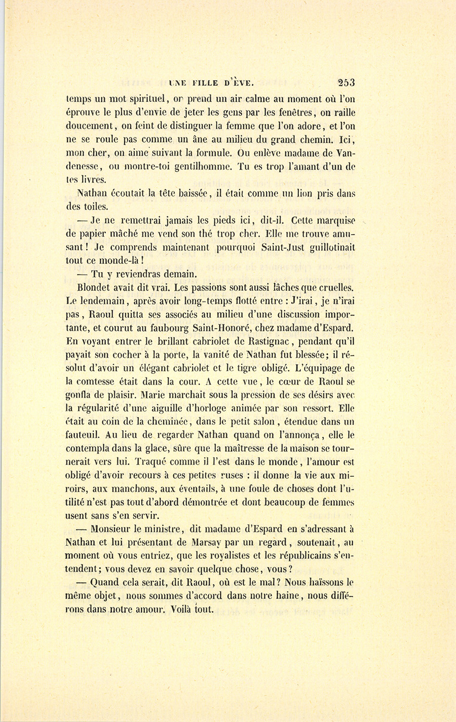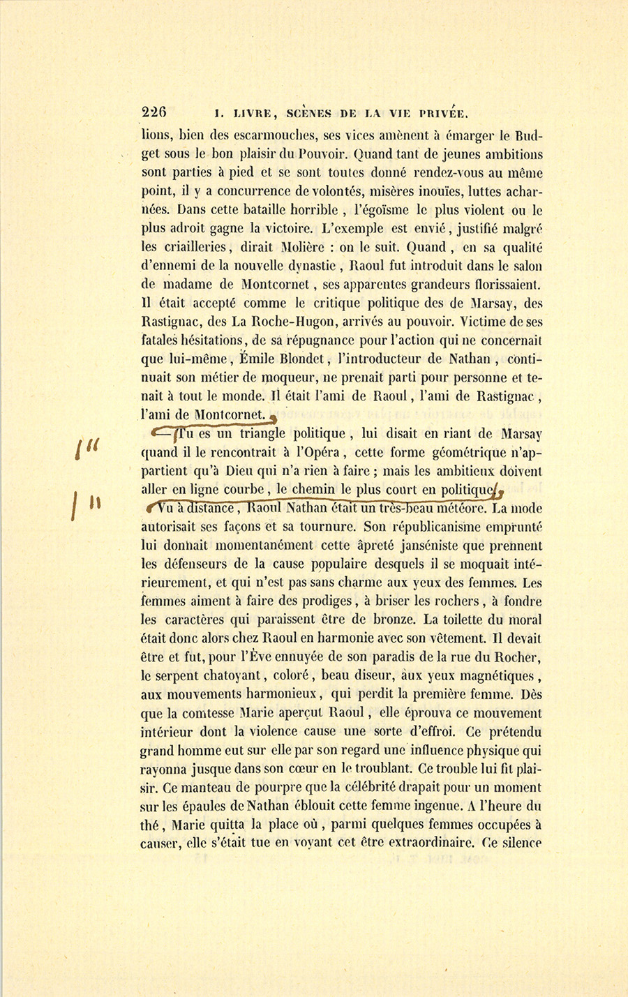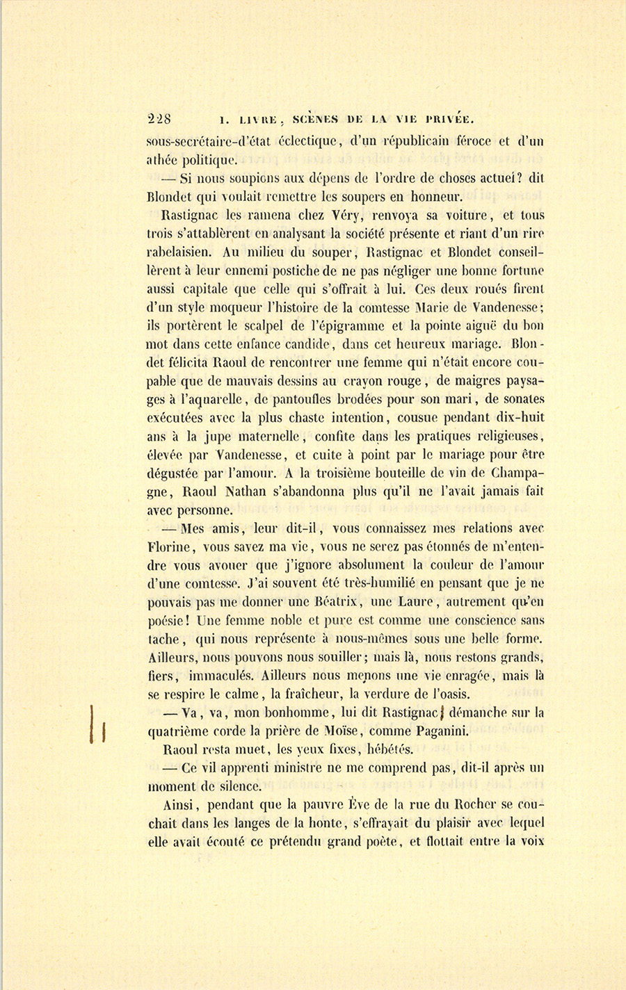 Raoul et Blondet partirent ensemble avec Rastignac, qui leur offrit sa voiture. Tous trois se mirent à rire de la réunion d’un {p. 228} sous-secrétaire-d’état éclectique, d’un républicain féroce et d’un athée politique.