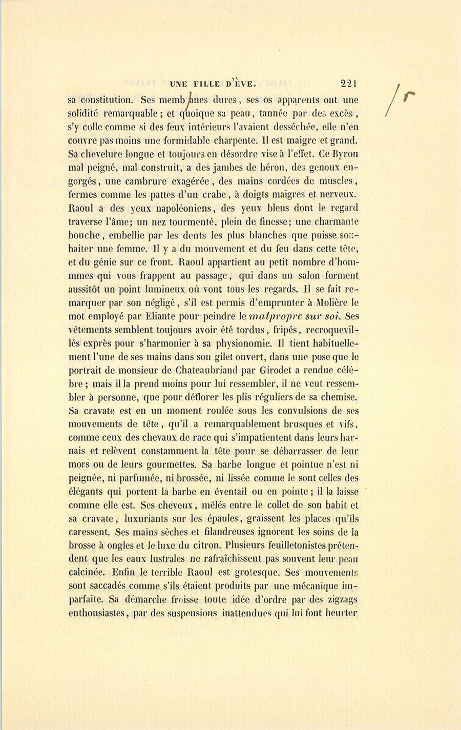 Depuis le moment où il s’était fait jour après avoir long-temps lutté, Raoul Nathan avait profité du subit engouement que manifestèrent pour la forme ces élégants sectaires du moyen âge, si plaisamment nommés Jeune-France. Il s’était donné les singularités d’un homme de génie en s’enrôlant parmi ces adorateurs de l’art dont les intentions furent d’ailleurs excellentes ; car rien de plus ridicule que le costume des Français au dix-neuvième siècle, il y avait du courage à le renouveler. Raoul, rendons-lui cette justice, offre dans sa personne je ne sais quoi de grand, de fantasque et d’extraordinaire qui veut un cadre. Ses ennemis ou ses amis, les uns valent les autres, conviennent que rien au monde ne concorde mieux avec son esprit que sa forme. Raoul Nathan serait peut-être plus singulier au naturel qu’il ne l’est avec ses accompagnements. Sa figure ravagée, détruite, lui donne l’air de s’être battu avec les anges ou les démons, elle ressemble à celle que les peintres allemands attribuent au Christ mort : il y paraît mille signes d’une lutte constante entre la faible nature humaine et les puissances d’en haut. Mais les rides creuses de ses joues, les redans de son crâne tortueux et sillonné, les salières qui marquent ses yeux et ses tempes, n’indiquent rien de débile dans {p. 221} sa constitution. Ses membranes dures, ses os apparents ont une solidité remarquable ; et quoique sa peau, tannée par des excès, s’y colle comme si des feux intérieurs l’avaient desséchée, elle n’en couvre pas moins une formidable charpente. Il est maigre et grand. Sa chevelure longue et toujours en désordre vise à l’effet. Ce Byron mal peigné, mal construit, a des jambes de héron, des genoux engorgés, une cambrure exagérée, des mains cordées de muscles, fermes comme les pattes d’un crabe, à doigts maigres et nerveux. Raoul a des yeux napoléoniens, des yeux bleus dont le regard traverse l’âme ; un nez tourmenté, plein de finesse ; une charmante bouche, embellie par les dents les plus blanches que puisse souhaiter une femme. Il y a du mouvement et du feu dans cette tête, et du génie sur ce front. Raoul appartient au petit nombre d’hommes qui vous frappent au passage, qui dans un salon forment aussitôt un point lumineux où vont tous les regards. Il se fait remarquer par son négligé, s’il est permis d’emprunter à Molière le mot employé par Éliante pour peindre le malpropre sur soi. Ses vêtements semblent toujours avoir été tordus, fripés, recroquevillés exprès pour s’harmonier à sa physionomie. Il tient habituellement l’une de ses mains dans son gilet ouvert, dans une pose que le portrait de monsieur de Chateaubriand par Girodet a rendue célèbre ; mais il la prend moins pour lui ressembler, il ne veut ressembler à personne, que pour déflorer les plis réguliers de sa chemise. Sa cravate est en un moment roulée sous les convulsions de ses mouvements de tête, qu’il a remarquablement brusques et vifs, comme ceux des chevaux de race qui s’impatientent dans leurs harnais et relèvent constamment la tête pour se débarrasser de leur mors ou de leurs gourmettes. Sa barbe longue et pointue n’est ni peignée, ni parfumée, ni brossée, ni lissée comme le sont celles des élégants qui portent la barbe en éventail ou en pointe ; il la laisse comme elle est. Ses cheveux, mêlés entre le collet de son habit et sa cravate, luxuriants sur les épaules, graissent les places qu’ils caressent. Ses mains sèches et filandreuses ignorent les soins de la brosse à ongles et le luxe du citron. Plusieurs feuilletonistes prétendent que les eaux lustrales ne rafraîchissent pas souvent leur peau calcinée. Enfin le terrible Raoul est grotesque. Ses mouvements sont saccadés comme s’ils étaient produits par une mécanique imparfaite. Sa démarche froisse toute idée d’ordre par des zigzags enthousiastes, par des suspensions inattendues qui lui font heurter {p. 222} les bourgeois pacifiques en promenade sur les boulevards de Paris. Sa conversation, pleine d’humeur caustique, d’épigrammes âpres, imite l’allure de son corps : elle quitte subitement le ton de la vengeance et devient suave, poétique, consolante, douce, hors de propos ; elle a des silences inexplicables, des soubresauts d’esprit qui fatiguent parfois. Il apporte dans le monde une gaucherie hardie, un dédain des conventions, un air de critique pour tout ce qu’on y respecte, qui le met mal avec les petits esprits comme avec ceux qui s’efforcent de conserver les doctrines de l’ancienne politesse ; mais c’est quelque chose d’original comme les créations chinoises et que les femmes ne haïssent pas. D’ailleurs, pour elles, il se montre souvent d’une amabilité recherchée, il semble se complaire à faire oublier ses formes bizarres, à remporter sur les antipathies une victoire qui flatte sa vanité, son amour-propre ou son orgueil. – Pourquoi êtes-vous comme cela ? lui dit un jour la marquise de Vandenesse. – Les perles ne sont-elles pas dans des écailles ? répondit-il fastueusement. À un autre qui lui adressait la même question, il répondit : – Si j’étais bien pour tout le monde, comment pourrais-je paraître mieux à une personne choisie entre toutes ? Raoul Nathan porte dans sa vie intellectuelle le désordre qu’il prend pour enseigne. Son annonce n’est pas menteuse : son talent ressemble à celui de ces pauvres filles qui se présentent dans les maisons bourgeoises pour tout faire : il fut d’abord critique, et grand critique ; mais il trouva de la duperie à ce métier. Ses articles valaient des livres, disait-il. Les revenus du théâtre l’avaient séduit ; mais incapable du travail lent et soutenu que veut la mise en scène, il avait été obligé de s’associer à un vaudevilliste, à du Bruel, qui mettait en œuvre ses idées et les avait toujours réduites en petites pièces productives,