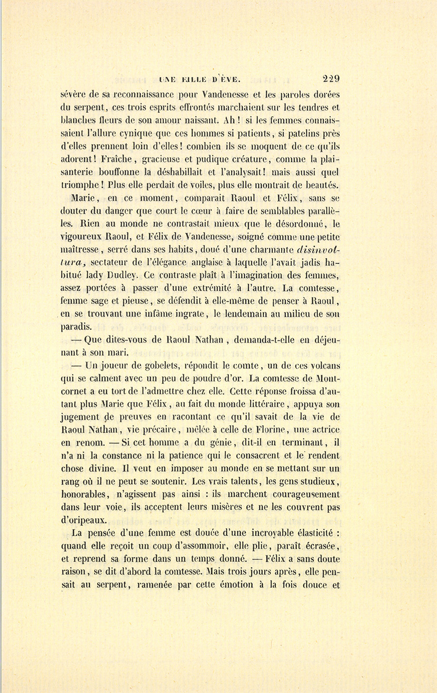 Ainsi, pendant que la pauvre Ève de la rue du Rocher se couchait dans les langes de la honte, s’effrayait du plaisir avec lequel elle avait écouté ce prétendu grand poète, et flottait entre la voix {p. 229} sévère de sa reconnaissance pour Vandenesse et les paroles dorées du serpent, ces trois esprits effrontés marchaient sur les tendres et blanches fleurs de son amour naissant. Ah ! si les femmes connaissaient l’allure cynique que ces hommes si patients, si patelins près d’elles prennent loin d’elles ! combien ils se moquent de ce qu’ils adorent ! Fraîche, gracieuse et pudique créature, comme la plaisanterie bouffonne la déshabillait et l’analysait ! mais aussi quel triomphe ! Plus elle perdait de voiles, plus elle montrait de beautés.