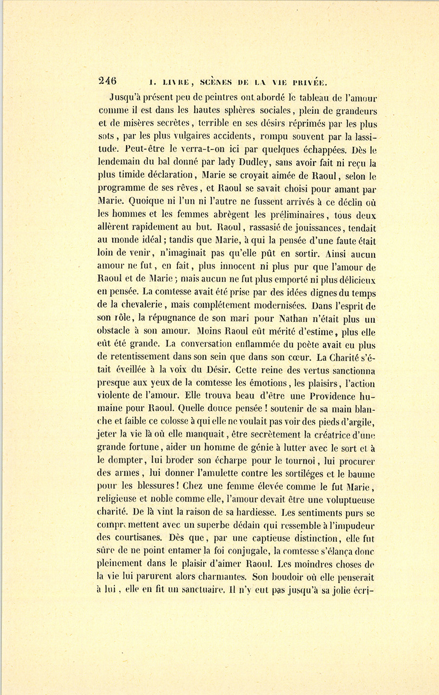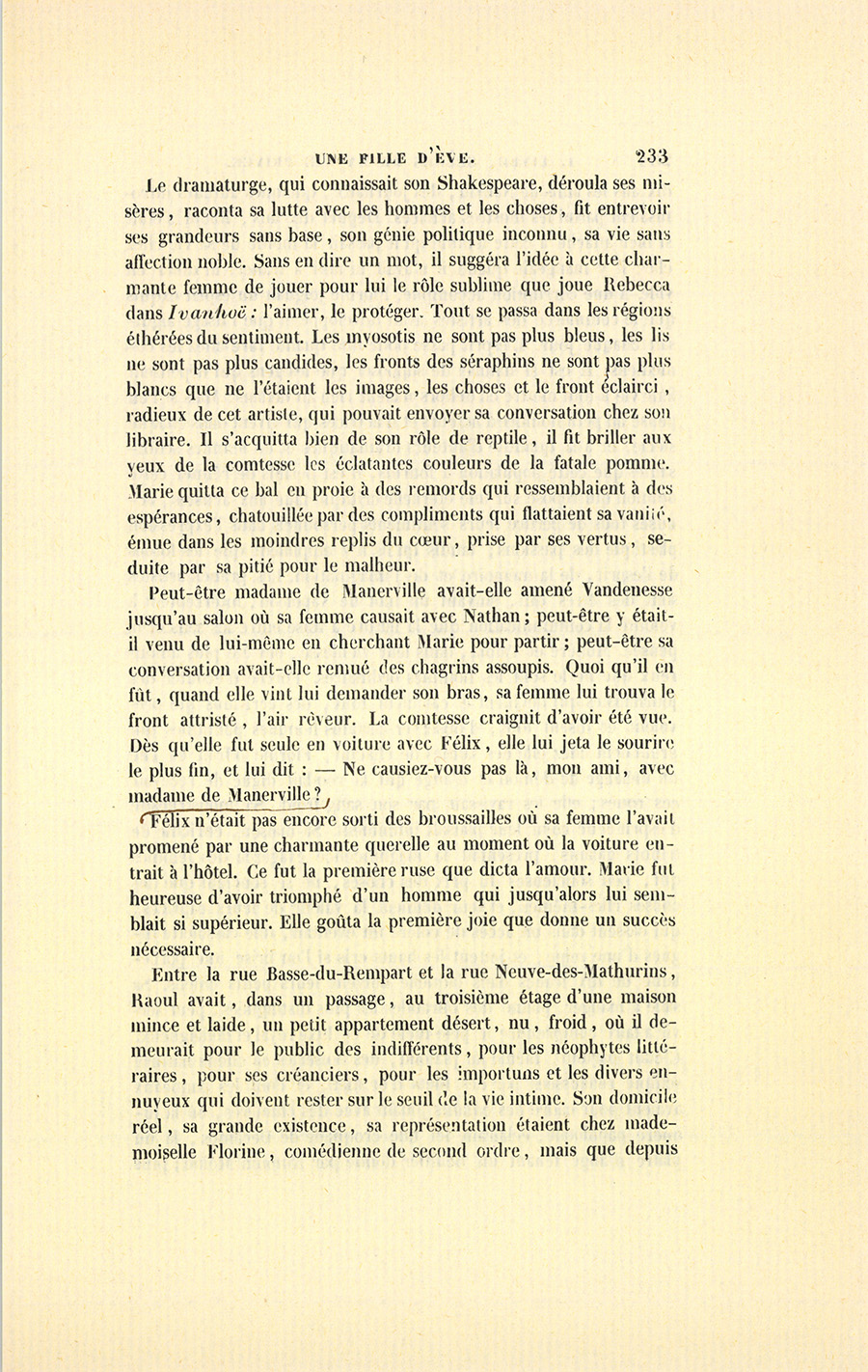 {p. 233} Le dramaturge, qui connaissait son Shakespeare, déroula ses misères, raconta sa lutte avec les hommes et les choses, fit entrevoir ses grandeurs sans base, son génie politique inconnu, sa vie sans affection noble. Sans en dire un mot, il suggéra l’idée à cette charmante femme de jouer pour lui le rôle sublime que joue Rebecca dans Ivanhoë : l’aimer, le protéger. Tout se passa dans les régions éthérées du sentiment. Les myosotis ne sont pas plus bleus, les lis ne sont pas plus candides, les fronts des séraphins ne sont pas plus blancs que ne l’étaient les images, les choses et le front éclairci, radieux de cet artiste, qui pouvait envoyer sa conversation chez son libraire. Il s’acquitta bien de son rôle de reptile, il fit briller aux yeux de la comtesse les éclatantes couleurs de la fatale pomme. Marie quitta ce bal en proie à des remords qui ressemblaient à des espérances, chatouillée par des compliments qui flattaient sa vanité, émue dans les moindres replis du cœur, prise par ses vertus, séduite par sa pitié pour le malheur.