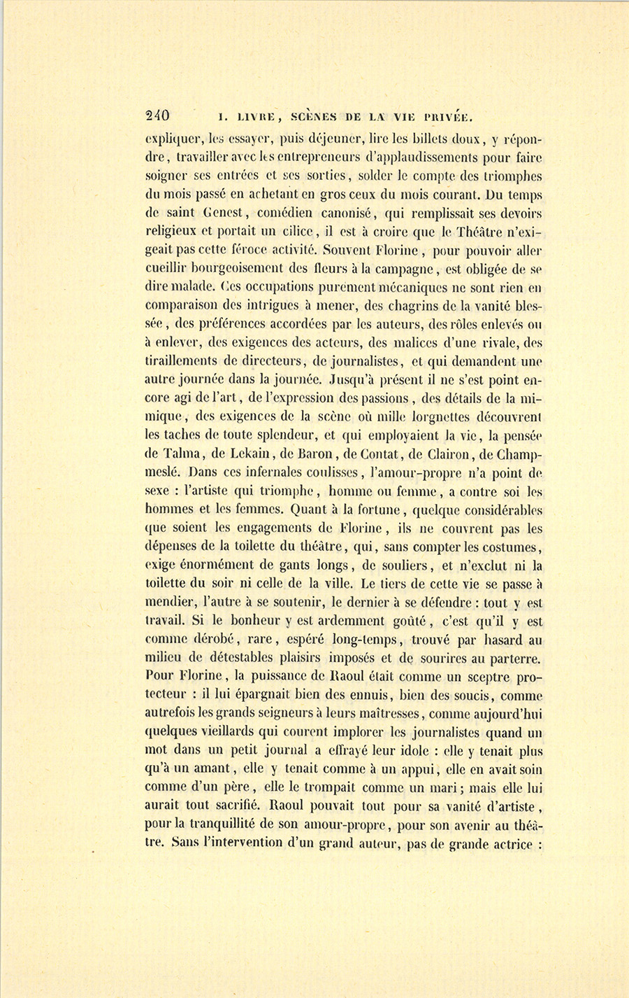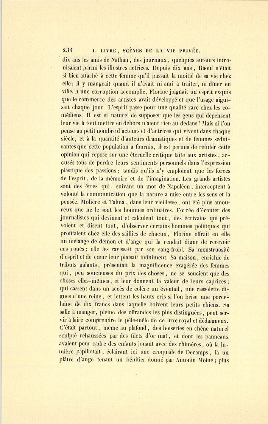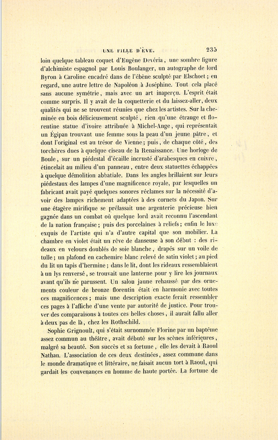 Entre la rue Basse-du-Rempart et la rue Neuve-des-Mathurins, Raoul avait, dans un passage, au troisième étage d’une maison mince et laide, un petit appartement désert, nu, froid, où il demeurait pour le public des indifférents, pour les néophytes littéraires, pour ses créanciers, pour les importuns et les divers ennuyeux qui doivent rester sur le seuil de la vie intime. Son domicile réel, sa grande existence, sa représentation étaient chez mademoiselle Florine, comédienne de second ordre, mais que depuis {p. 234} dix ans les amis de Nathan, des journaux, quelques auteurs intronisaient parmi les illustres actrices. Depuis dix ans, Raoul s’était si bien attaché à cette femme qu’il passait la moitié de sa vie chez elle ; il y mangeait quand il n’avait ni ami à traiter, ni dîner en ville. À une corruption accomplie, Florine joignait un esprit exquis que le commerce des artistes avait développé et que l’usage aiguisait chaque jour. L’esprit passe pour une qualité rare chez les comédiens. Il est si naturel de supposer que les gens qui dépensent leur vie à tout mettre en dehors n’aient rien au dedans ! Mais si l’on pense au petit nombre d’acteurs et d’actrices qui vivent dans chaque siècle, et à la quantité d’auteurs dramatiques et de femmes séduisantes que cette population a fournis, il est permis de réfuter cette opinion qui repose sur une éternelle critique faite aux artistes, accusés tous de perdre leurs sentiments personnels dans l’expression plastique des passions ; tandis qu’ils n’y emploient que les forces de l’esprit, de la mémoire et de l’imagination. Les grands artistes sont des êtres qui, suivant un mot de Napoléon, interceptent à volonté la communication que la nature a mise entre les sens et la pensée. Molière et Talma, dans leur vieillesse, ont été plus amoureux que ne le sont les hommes ordinaires. Forcée d’écouter des journalistes qui devinent et calculent tout, des écrivains qui prévoient et disent tout, d’observer certains hommes politiques qui profitaient chez elle des saillies de chacun, Florine offrait en elle un mélange de démon et d’ange qui la rendait digne de recevoir ces roués ; elle les ravissait par son sang-froid. Sa monstruosité d’esprit et de cœur leur plaisait infiniment. Sa maison, enrichie de tributs galants, présentait la magnificence exagérée des femmes qui, peu soucieuses du prix des choses, ne se soucient que des choses elles-mêmes, et leur donnent la valeur de leurs caprices ; qui cassent dans un accès de colère un éventail, une cassolette dignes d’une reine, et jettent les hauts cris si l’on brise une porcelaine de dix francs dans laquelle boivent leurs petits chiens. Sa salle à manger, pleine des offrandes les plus distinguées, peut servir à faire comprendre le pêle-mêle de ce luxe royal et dédaigneux. C’était partout, même au plafond, des boiseries en chêne naturel sculpté rehaussées par des filets d’or mat, et dont les panneaux avaient pour cadre des enfants jouant avec des chimères, où la lumière papillotait, éclairant ici une croquade de Decamps, là un plâtre d’ange tenant un bénitier donné par Antonin Moine ; plus {p. 235} loin quelque tableau coquet d’Eugène Devéria, une sombre figure d’alchimiste espagnol par Louis Boulanger, un autographe de lord Byron à Caroline encadré dans de l’ébène sculpté par Elschoet ; en regard, une autre lettre de Napoléon à Joséphine. Tout cela placé sans aucune symétrie, mais avec un art inaperçu. L’esprit était comme surpris. Il y avait de la coquetterie et du laissez-aller, deux qualités qui ne se trouvent réunies que chez les artistes. Sur la cheminée en bois délicieusement sculpté, rien qu’une étrange et florentine statue d’ivoire attribuée à Michel-Ange, qui représentait un Égipan trouvant une femme sous la peau d’un jeune pâtre, et dont l’original est au trésor de Vienne ; puis, de chaque côté, des torchères dues à quelque ciseau de la Renaissance. Une horloge de Boule, sur un piédestal d’écaille incrusté d’arabesques en cuivre, étincelait au milieu d’un panneau, entre deux statuettes échappées à quelque démolition abbatiale. Dans les angles brillaient sur leurs piédestaux des lampes d’une magnificence royale, par lesquelles un fabricant avait payé quelques sonores réclames sur la nécessité d’avoir des lampes richement adaptées à des cornets du Japon. Sur une étagère mirifique se prélassait une argenterie précieuse bien gagnée dans un combat où quelque lord avait reconnu l’ascendant de la nation française ; puis des porcelaines à reliefs ; enfin le luxe exquis de l’artiste qui n’a d’autre capital que son mobilier. La chambre en violet était un rêve de danseuse à son début : des rideaux en velours doublés de soie blanche, drapés sur un voile de tulle ; un plafond en cachemire blanc relevé de satin violet ; au pied du lit un tapis d’hermine ; dans le lit, dont les rideaux ressemblaient à un lys renversé, se trouvait une lanterne pour y lire les journaux avant qu’ils ne parussent. Un salon jaune rehaussé par des ornements couleur de bronze florentin était en harmonie avec toutes ces magnificences ; mais une description exacte ferait ressembler ces pages à l’affiche d’une vente par autorité de justice. Pour trouver des comparaisons à toutes ces belles choses, il aurait fallu aller à deux pas de là, chez les Rothschild.