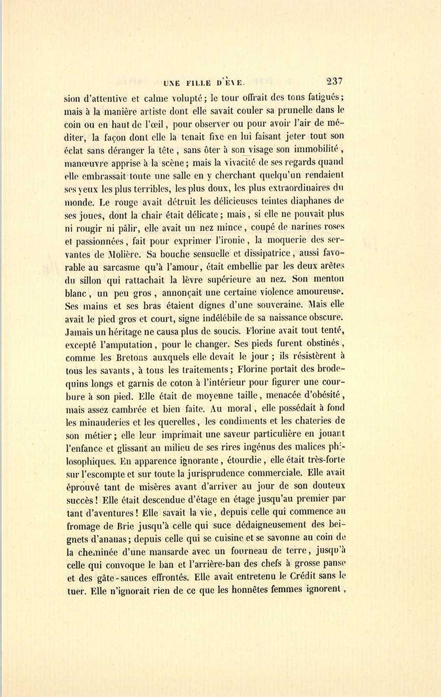 Sophie Grignoult, qui s’était surnommée Florine par un baptême assez commun au théâtre, avait débuté sur les scènes inférieures, malgré sa beauté. Son succès et sa fortune, elle les devait à Raoul Nathan. L’association de ces deux destinées, assez commune dans le monde dramatique et littéraire, ne faisait aucun tort à Raoul, qui gardait les convenances en homme de haute portée. La fortune de {p. 236} Florine n’avait néanmoins rien de stable. Ses rentes aléatoires étaient fournies par ses engagements, par ses congés, et payaient à peine sa toilette et son ménage. Nathan lui donnait quelques contributions levées sur les entreprises nouvelles de l’industrie ; mais, quoique toujours galant et protecteur avec elle, cette protection n’avait rien de régulier ni de solide. Cette incertitude, cette vie en l’air n’effrayaient point Florine. Florine croyait en son talent, elle croyait en sa beauté. Sa foi robuste avait quelque chose de comique pour ceux qui l’entendaient hypothéquer son avenir là-dessus quand on lui faisait des remontrances. « – J’aurai des rentes lorsqu’il me plaira d’en avoir, disait-elle. J’ai déjà cinquante francs sur le grand-livre. » Personne ne comprenait comment elle avait pu rester sept ans oubliée, belle comme elle était ; mais, à la vérité, Florine fut enrôlée comme comparse à treize ans, et débutait deux ans après sur un obscur théâtre des boulevards. À quinze ans, ni la beauté ni le talent n’existent : une femme est tout promesse. Elle avait alors vingt-huit ans, le moment où les beautés des femmes françaises sont dans tout leur éclat. Les peintres voyaient avant tout dans Florine des épaules d’un blanc lustré, teintes de tons olivâtres aux environs de la nuque, mais fermes et polies ; la lumière glissait dessus comme sur une étoffe moirée. Quand elle tournait la tête, il se formait dans son cou des plis magnifiques, l’admiration des sculpteurs. Elle avait sur ce cou triomphant une petite tête d’impératrice romaine, la tête élégante et fine, ronde et volontaire de Poppée, des traits d’une correction spirituelle, le front lisse des femmes qui chassent le souci et les réflexions, qui cèdent facilement, mais qui se butent aussi comme des mules et n’écoutent alors plus rien. Ce front taillé comme d’un seul coup de ciseau faisait valoir de beaux cheveux cendrés presque toujours relevés par-devant en deux masses égales, à la romaine, et mis en mamelon derrière la tête pour la prolonger et rehausser par leur couleur le blanc du col. Des sourcils noirs et fins, dessinés par quelque peintre chinois, encadraient des paupières molles où se voyait un réseau de fibrilles roses. Ses prunelles allumées par une vive lumière, mais tigrées par des rayures brunes, donnaient à son regard la cruelle fixité des bêtes fauves et révélaient la malice froide de la courtisane. Ses adorables yeux de gazelle étaient d’un beau gris et frangés de longs cils noirs, charmante opposition qui rendait encore plus sensible leur {p. 237} expression d’attentive et calme volupté ; le tour offrait des tons fatigués ; mais à la manière artiste dont elle savait couler sa prunelle dans le coin ou en haut de l’œil, pour observer ou pour avoir l’air de méditer, la façon dont elle la tenait fixe en lui faisant jeter tout son éclat sans déranger la tête, sans ôter à son visage son immobilité, manœuvre apprise à la scène ; mais la vivacité de ses regards quand elle embrassait toute une salle en y cherchant quelqu’un rendaient ses yeux les plus terribles, les plus doux, les plus extraordinaires du monde. Le rouge avait détruit les délicieuses teintes diaphanes de ses joues, dont la chair était délicate ; mais, si elle ne pouvait plus ni rougir ni pâlir, elle avait un nez mince, coupé de narines roses et passionnées, fait pour exprimer l’ironie, la moquerie des servantes de Molière. Sa bouche sensuelle et dissipatrice, aussi favorable au sarcasme qu’à l’amour, était embellie par les deux arêtes du sillon qui rattachait la lèvre supérieure au nez. Son menton blanc, un peu gros, annonçait une certaine violence amoureuse. Ses mains et ses bras étaient dignes d’une souveraine. Mais elle avait le pied gros et court, signe indélébile de sa naissance obscure. Jamais un héritage ne causa plus de soucis. Florine avait tout tenté, excepté l’amputation, pour le changer. Ses pieds furent obstinés, comme les Bretons auxquels elle devait le jour ; ils résistèrent à tous les savants, à tous les traitements ; Florine portait des brodequins longs et garnis de coton à l’intérieur pour figurer une courbure à son pied. Elle était de moyenne taille, menacée d’obésité, mais assez cambrée et bien faite. Au moral, elle possédait à fond les minauderies et les querelles, les condiments et les chateries de son métier ; elle leur imprimait une saveur particulière en jouant l’enfance et glissant au milieu de ses rires ingénus des malices philosophiques. En apparence ignorante, étourdie, elle était très-forte sur l’escompte et sur toute la jurisprudence commerciale. Elle avait éprouvé tant de misères avant d’arriver au jour de son douteux succès ! Elle était descendue d’étage en étage jusqu’au premier par tant d’aventures ! Elle savait la vie, depuis celle qui commence au fromage de Brie jusqu’à celle qui suce dédaigneusement des beignets d’ananas ; depuis celle qui se cuisine et se savonne au coin de la cheminée d’une mansarde avec un fourneau de terre, jusqu’à celle qui convoque le ban et l’arrière-ban des chefs à grosse panse et des gâte-sauces effrontés. Elle avait entretenu le Crédit sans le tuer. Elle n’ignorait rien de ce que les honnêtes femmes ignorent, {p. 238} elle parlait tous les langages ; elle était Peuple par l’expérience, et Noble par sa beauté distinguée. Difficile à surprendre,