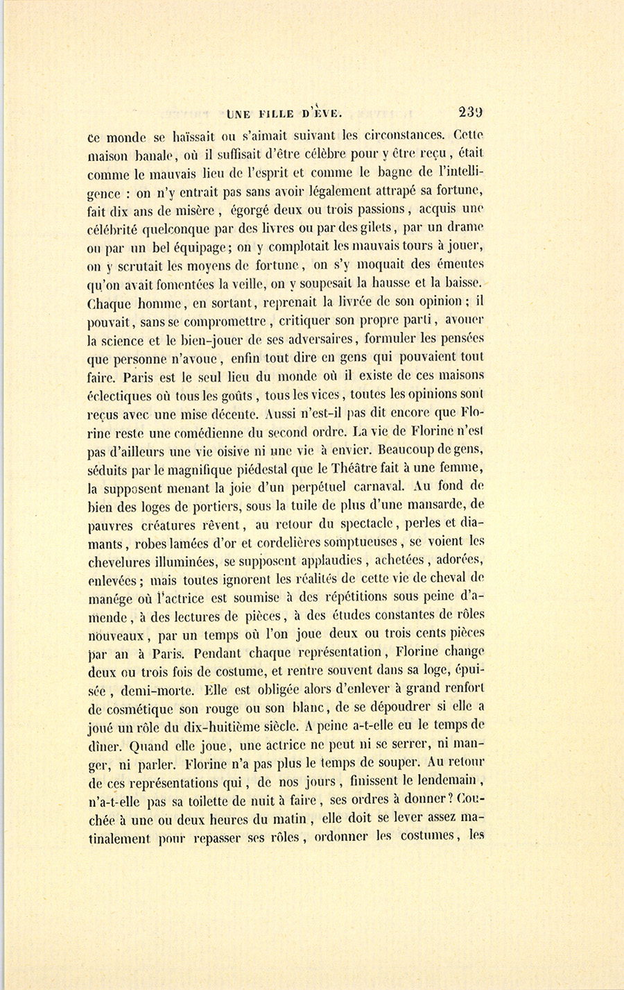 Florine donnait de charmants dîners, des concerts et des soirées très-suivis : on y jouait un jeu d’enfer. Ses amies étaient toutes belles. Jamais une vieille femme n’avait paru chez elle : elle ignorait la jalousie, elle y trouvait d’ailleurs l’aveu d’une infériorité. Elle avait connu Coralie, la Torpille, elle connaissait les Tullia, Euphrasie, les Aquilina, madame du Val-Noble, Mariette, ces femmes qui passent à travers Paris comme les fils de la Vierge dans l’atmosphère, sans qu’on sache où elles vont ni d’où elles viennent, aujourd’hui reines, demain esclaves ; puis les actrices, ses rivales, les cantatrices, enfin toute cette société féminine exceptionnelle, si bienfaisante, si gracieuse dans son sans-souci, dont la vie bohémienne absorbe ceux qui se laissent prendre dans la danse échevelée de son entrain, de sa verve, de son mépris de l’avenir. Quoique la vie de la Bohême se déployât chez elle dans tout son désordre, au milieu des rires de l’artiste, la reine du logis avait dix doigts et savait aussi bien compter que pas un de tous ses hôtes. Là se faisaient les saturnales secrètes de la littérature et de l’art mêlés à la politique et à la finance. Là le Désir régnait en souverain ; là le Spleen et la Fantaisie étaient sacrés comme chez une bourgeoise l’honneur et la vertu. Là venaient Blondet, Finot, Étienne Lousteau son septième amant et cru le premier, Félicien Vernou le feuilletoniste, Couture, Bixiou, Rastignac autrefois, Claude Vignon le critique, Nucingen le banquier, du Tillet, Conti le compositeur, enfin cette légion endiablée des plus féroces calculateurs en tout genre ; puis les amis des cantatrices, des danseuses et des actrices que connaissait Florine. Tout {p. 239} ce monde se haïssait ou s’aimait suivant les circonstances. Cette maison banale, où il suffisait d’être célèbre pour y être reçu, était comme le mauvais lieu de l’esprit et comme le bagne de l’intelligence : on n’y entrait pas sans avoir légalement attrapé sa fortune, fait dix ans de misère, égorgé deux ou trois passions, acquis une célébrité quelconque par des livres ou par des gilets, par un drame ou par un bel équipage ; on y complotait les mauvais tours à jouer, on y scrutait les moyens de fortune, on s’y moquait des émeutes qu’on avait fomentées la veille, on y soupesait la hausse et la baisse. Chaque homme, en sortant, reprenait la livrée de son opinion ; il pouvait, sans se compromettre, critiquer son propre parti, avouer la science et le bien-jouer de ses adversaires, formuler les pensées que personne n’avoue, enfin tout dire en gens qui pouvaient tout faire. Paris est le seul lieu du monde où il existe de ces maisons éclectiques où tous les goûts, tous les vices, toutes les opinions sont reçus avec une mise décente. Aussi n’est-il pas dit encore que Florine reste une comédienne du second ordre. La vie de Florine n’est pas d’ailleurs une vie oisive ni une vie à envier. Beaucoup de gens, séduits par le magnifique piédestal que le Théâtre fait à une femme, la supposent menant la joie d’un perpétuel carnaval. Au fond de bien des loges de portiers, sous la tuile de plus d’une mansarde, de pauvres créatures rêvent, au retour du spectacle, perles et diamants, robes lamées d’or et cordelières somptueuses, se voient les chevelures illuminées, se supposent applaudies, achetées, adorées, enlevées ; mais toutes ignorent les réalités de cette vie de cheval de manége où l’actrice est soumise à des répétitions sous peine d’amende, à des lectures de pièces, à des études constantes de rôles nouveaux, par un temps où l’on joue deux ou trois cents pièces par an à Paris. Pendant chaque représentation, Florine change deux ou trois fois de costume, et rentre souvent dans sa loge, épuisée, demi-morte. Elle est obligée alors d’enlever à grand renfort de cosmétique son rouge ou son blanc, de se dépoudrer si elle a joué un rôle du dix-huitième siècle. À peine a-t-elle eu le temps de dîner. Quand elle joue, une actrice ne peut ni se serrer, ni manger, ni parler. Florine n’a pas plus le temps de souper. Au retour de ces représentations qui, de nos jours, finissent le lendemain, n’a-t-elle pas sa toilette de nuit à faire, ses ordres à donner ? Couchée à une ou deux heures du matin, elle doit se lever assez matinalement pour repasser ses rôles, ordonner les costumes, les {p. 240} expliquer, les essayer, puis déjeuner, lire les billets doux, y répondre, travailler avec les entrepreneurs d’applaudissements pour faire soigner ses entrées et ses sorties, solder le compte des triomphes du mois passé en achetant en gros ceux du mois courant. Du temps de saint Genest, comédien canonisé, qui remplissait ses devoirs religieux et portait un cilice, il est à croire que le Théâtre n’exigeait pas cette féroce activité. Souvent Florine, pour pouvoir aller cueillir bourgeoisement des fleurs à la campagne, est obligée de se dire malade. Ces occupations purement mécaniques ne sont rien en comparaison des intrigues à mener, des chagrins de la vanité blessée, des préférences accordées par les auteurs, des rôles enlevés ou à enlever, des exigences des acteurs, des malices d’une rivale, des tiraillements de directeurs, de journalistes, et qui demandent une autre journée dans la journée. Jusqu’à présent il ne s’est point encore agi de l’art, de l’expression des passions, des détails de la mimique, des exigences de la scène où mille lorgnettes découvrent les taches de toute splendeur, et qui employaient la vie, la pensée de Talma, de Lekain, de Baron, de Contat, de Clairon, de Champmeslé. Dans ces infernales coulisses, l’amour-propre n’a point de sexe : l’artiste qui triomphe, homme ou femme, a contre soi les hommes et les femmes. Quant à la fortune, quelque considérables que soient les engagements de Florine, il