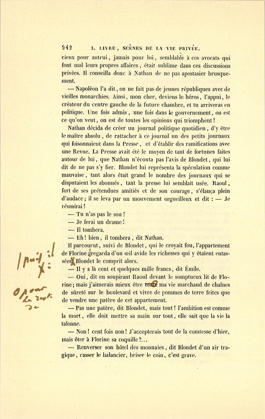 À cette époque, une foule de journaux créés pour chaque nuance accusaient l’effroyable pêle-mêle politique appelé gâchis par un soldat. Blondet, l’esprit le plus judicieux de l’époque, mais {p. 242} judicieux pour autrui, jamais pour lui, semblable à ces avocats qui font mal leurs propres affaires, était sublime dans ces discussions privées. Il conseilla donc à Nathan de ne pas apostasier brusquement.