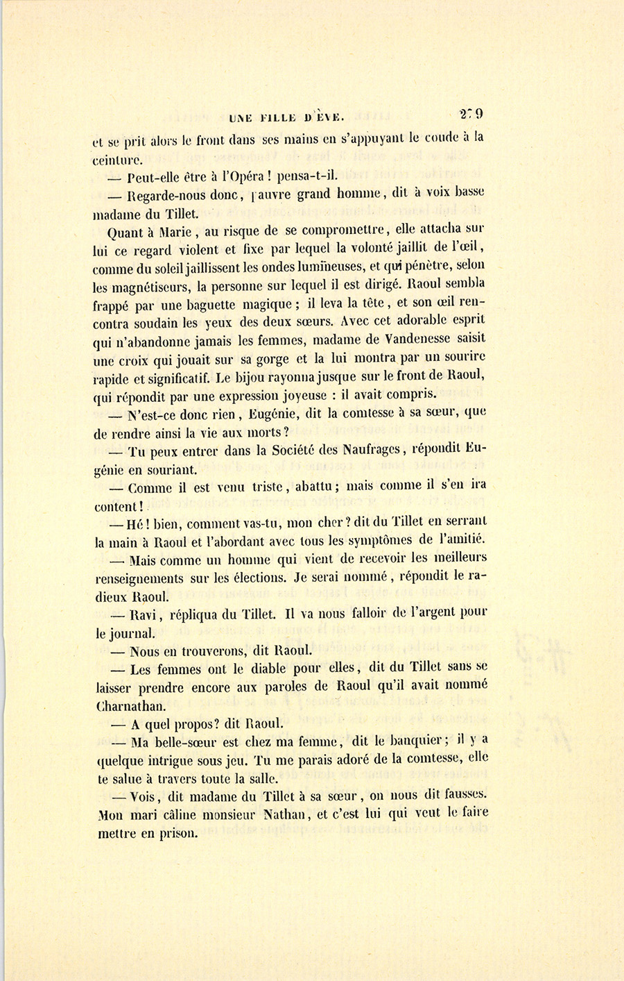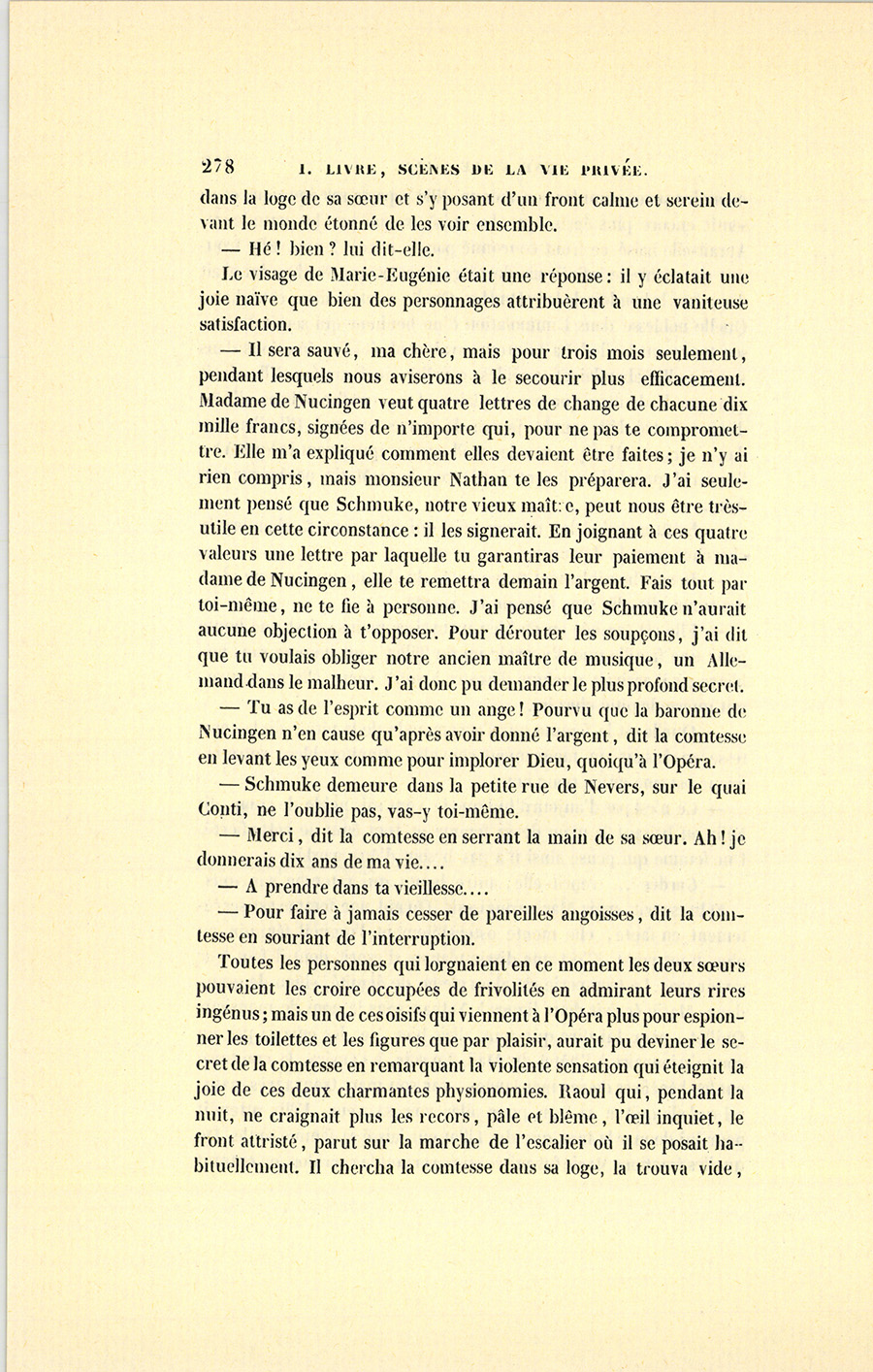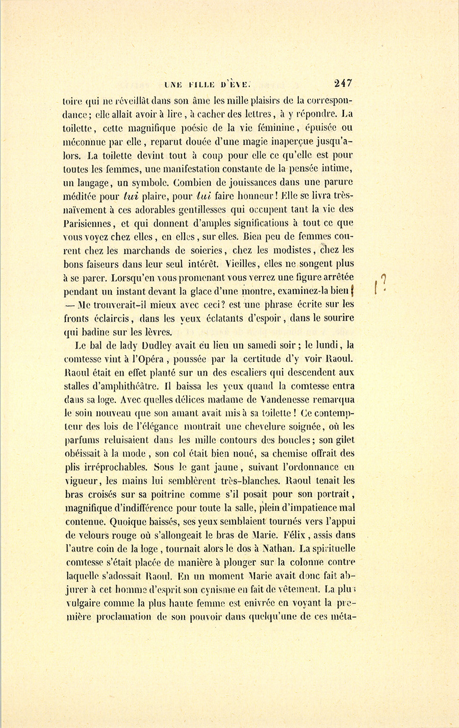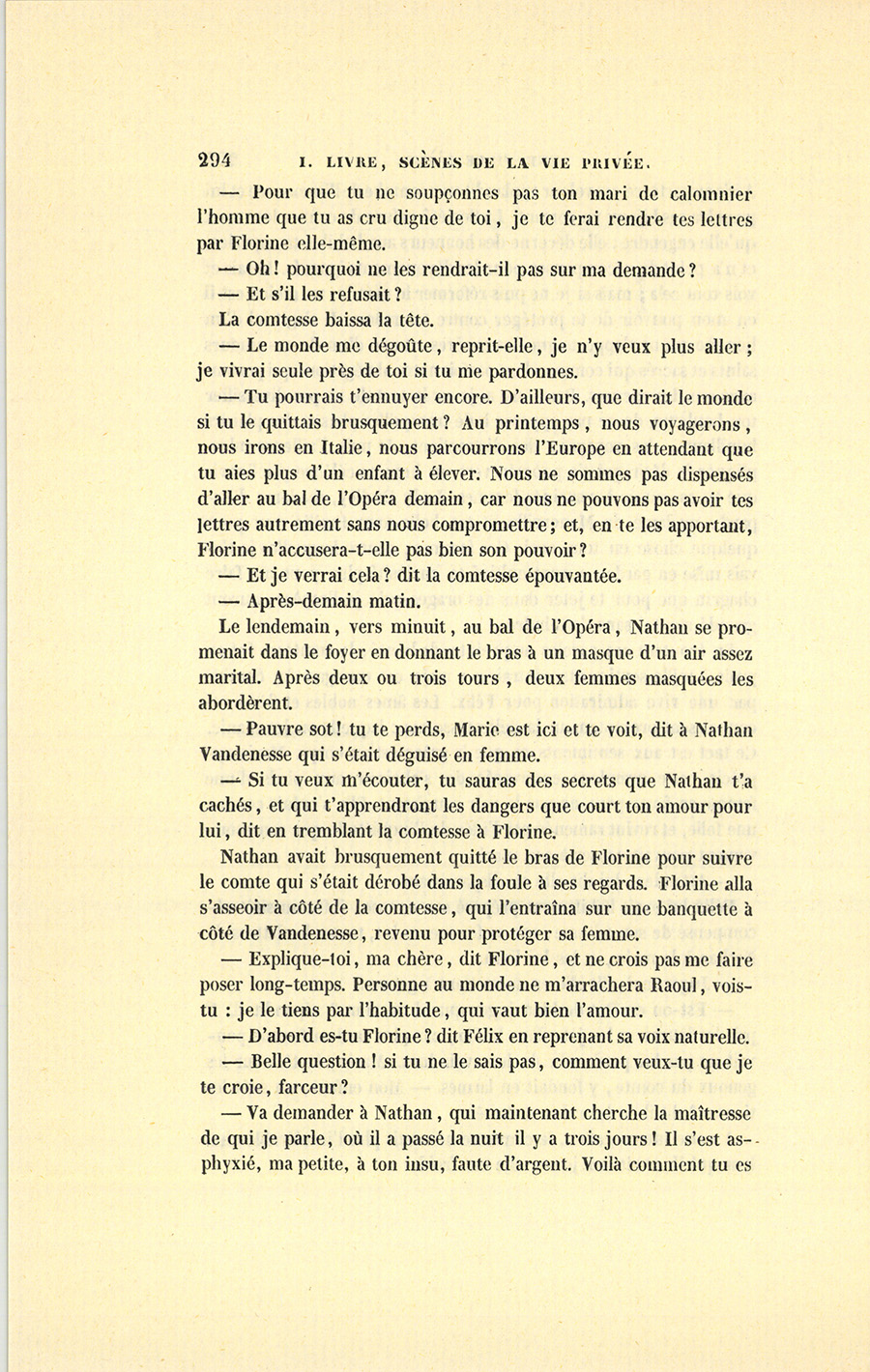 Le lendemain, vers minuit, au bal de l’Opéra, Nathan se promenait dans le foyer en donnant le bras à un masque d’un air assez marital. Après deux ou trois tours, deux femmes masquées les abordèrent.
