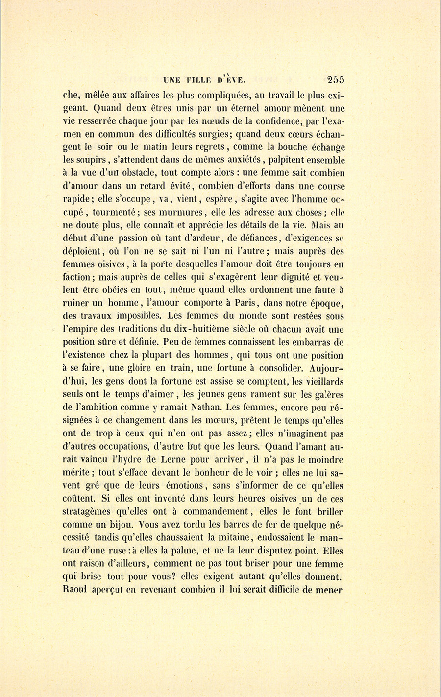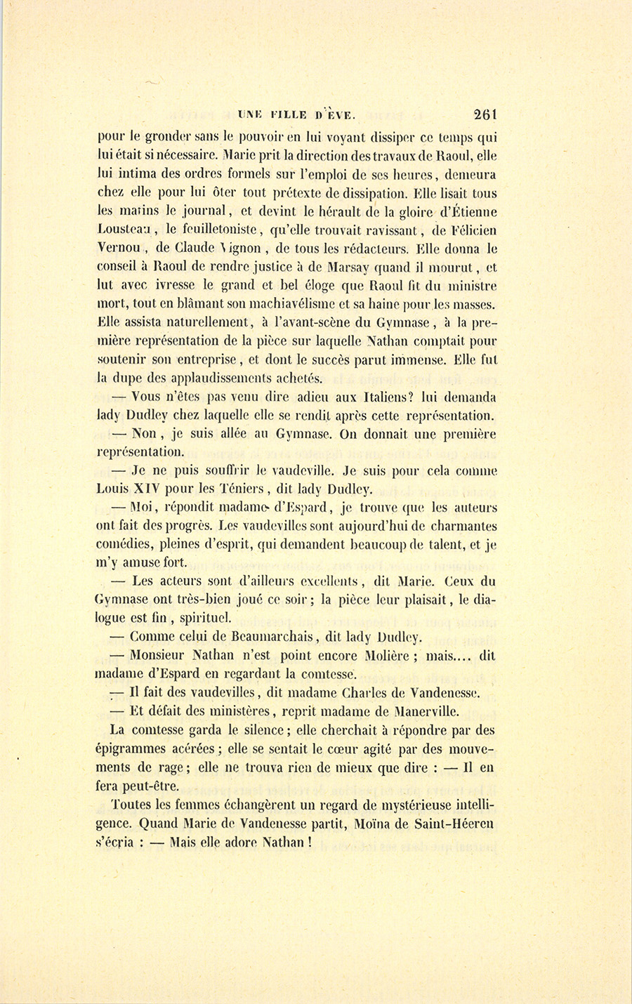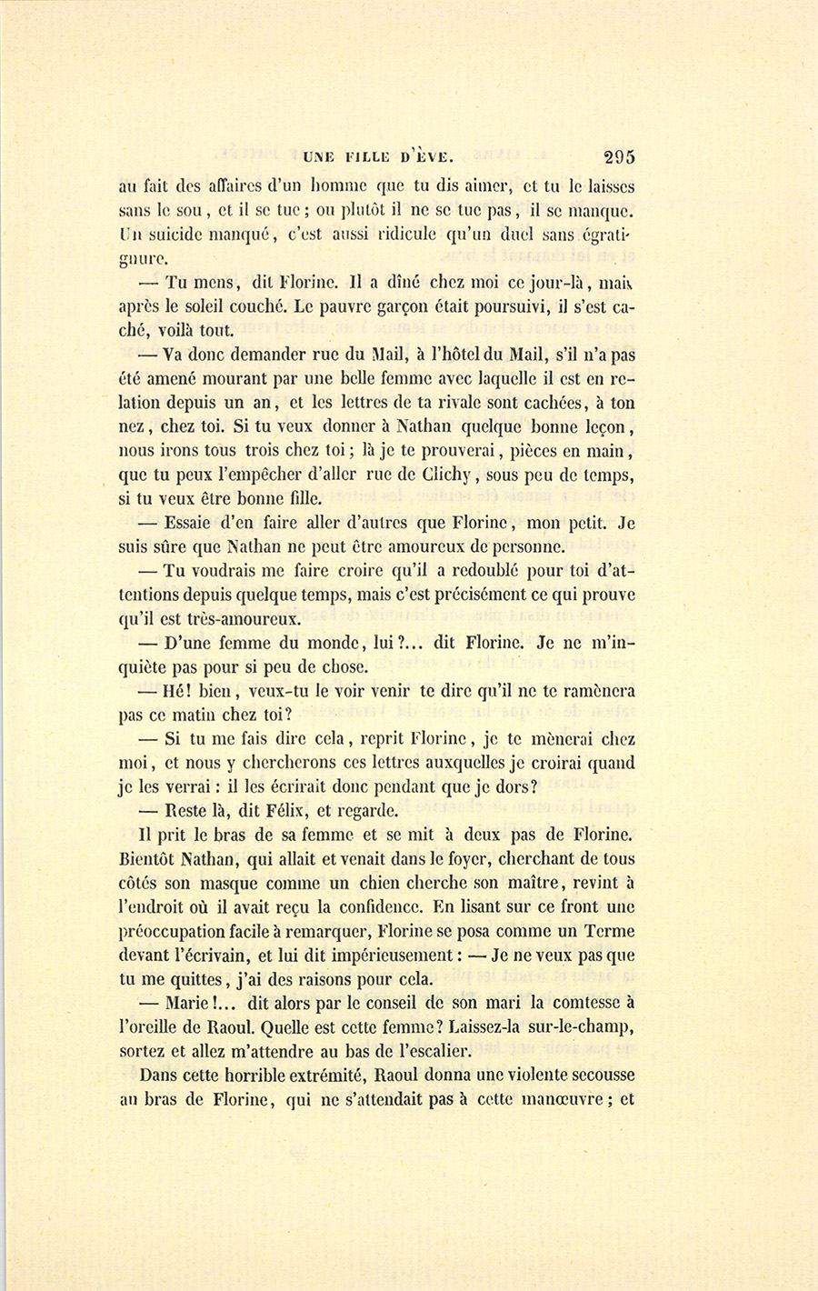 – Va demander à Nathan, qui maintenant cherche la maîtresse de qui je parle, où il a passé la nuit il y a trois jours ! Il s’est asphyxié, ma petite, à ton insu, faute d’argent. Voilà comment tu es {p. 295} au fait des affaires d’un homme que tu dis aimer, et tu le laisses sans le sou, et il se tue ; ou plutôt il ne se tue pas, il se manque. Un suicide manqué, c’est aussi ridicule qu’un duel sans égratignure.