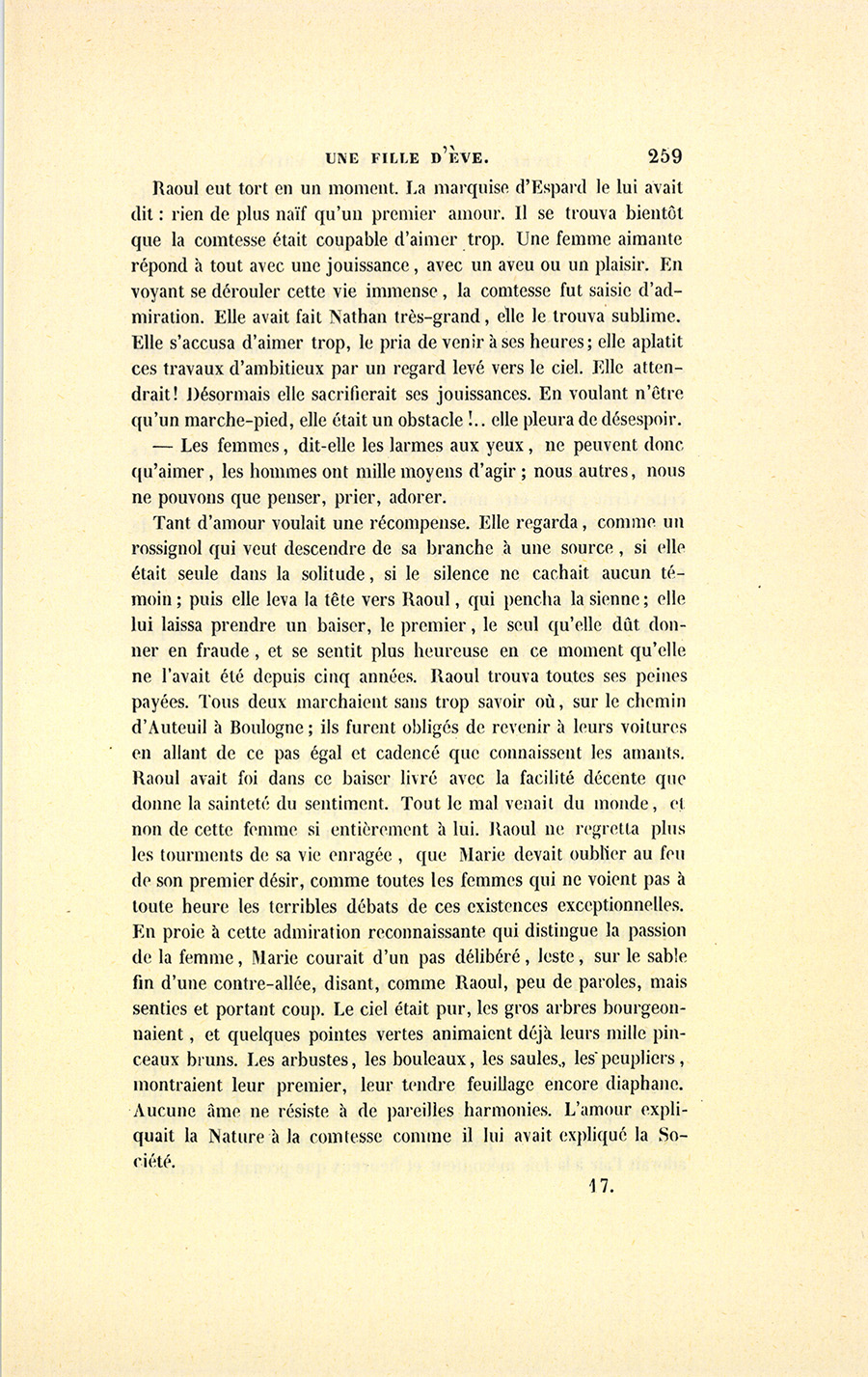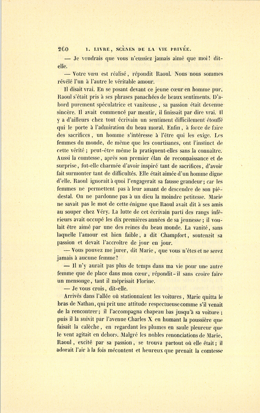 – Mes amis, leur dit-il, vous connaissez mes relations avec Florine, vous savez ma vie, vous ne serez pas étonnés de m’entendre vous avouer que j’ignore absolument la couleur de l’amour d’une comtesse. J’ai souvent été très-humilié en pensant que je ne pouvais pas me donner une Béatrix, une Laure, autrement qu’en poésie ! Une femme noble et pure est comme une conscience sans tache, qui nous représente à nous-mêmes sous une belle forme. Ailleurs, nous pouvons nous souiller ; mais là, nous restons grands, fiers, immaculés. Ailleurs nous menons une vie enragée, mais là se respire le calme, la fraîcheur, la verdure de l’oasis.