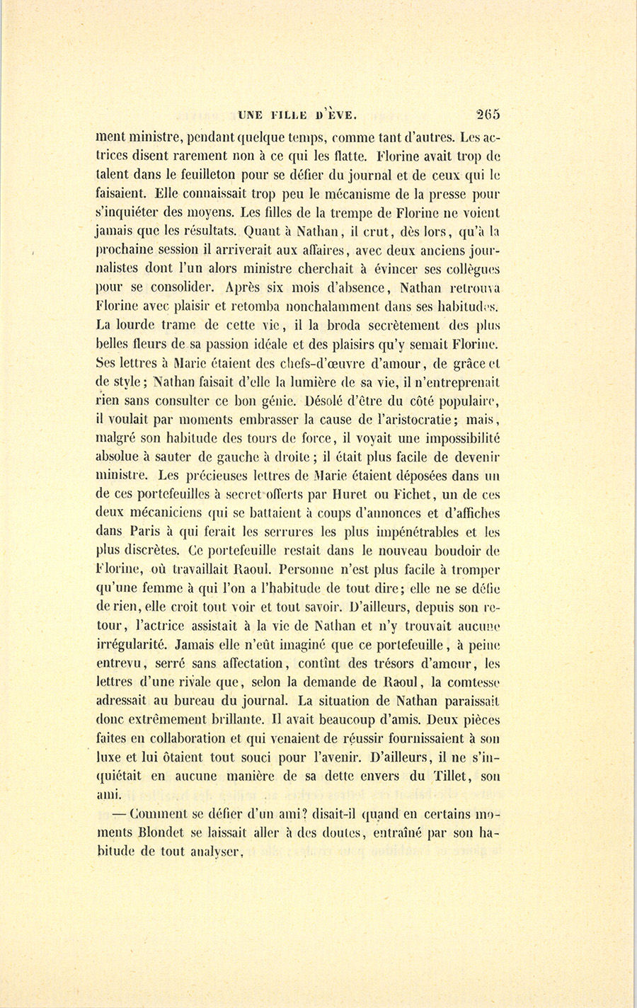 Elle alla prendre le rasoir avec lequel Nathan venait de se faire la barbe et fendit les plis du maroquin qui s’ouvrit et laissa passer les lettres de Marie. Florine en prit une au hasard.