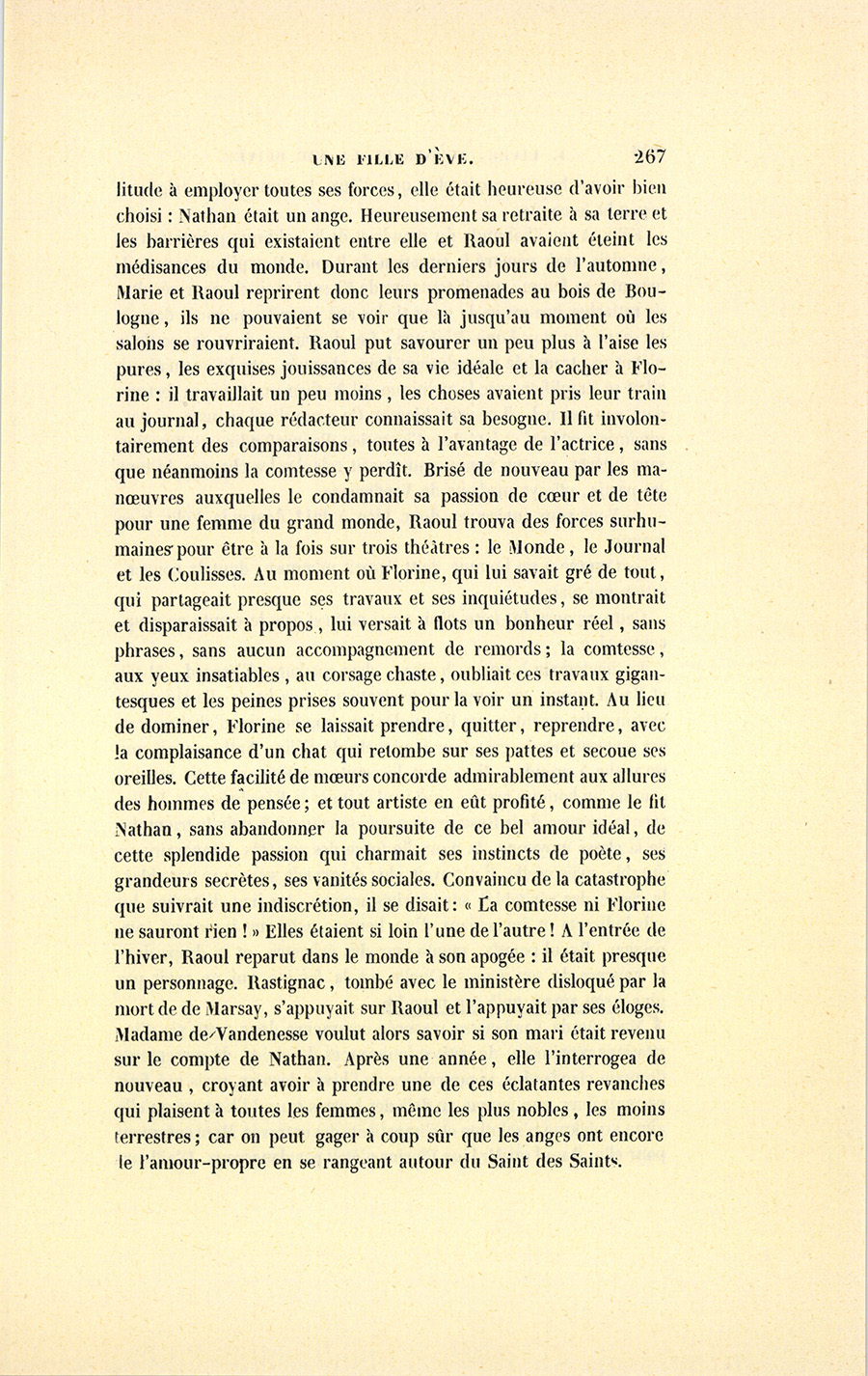 Quand, après un long et heureux voyage en Italie, la comtesse de Vandenesse revint à Paris, l’hiver suivant, Nathan avait justifié toutes les prévisions de Félix : d’après les conseils de Blondet, il parlementait avec le pouvoir. Quant aux affaires personnelles de cet écrivain, elles étaient dans un tel désordre qu’un jour, aux Champs-Élysées, la comtesse Marie vit son ancien adorateur à pied, dans le plus triste équipage, donnant le bras à Florine. Un homme indifférent est déjà passablement laid aux yeux d’une femme ; mais quand elle ne l’aime plus, il paraît horrible, surtout lorsqu’il ressemble à Nathan. Madame de Vandenesse eut un mouvement de honte en songeant qu’elle s’était intéressée à Raoul. Si elle n’eût pas été guérie de toute passion extra-conjugale, le contraste que présentait alors le comte, comparé à cet homme déjà moins digne de la faveur publique, eût suffi pour lui faire préférer son mari à un ange.