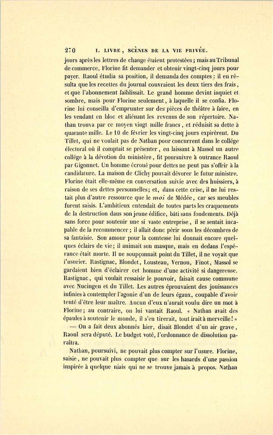 Du Tillet, en terme de Bourse, exécuta Nathan, qui, faute d’argent, abandonna sa part dans le journal. L’homme célèbre n’eut pas plus de cinq voix dans le collége où le banquier fut élu.
