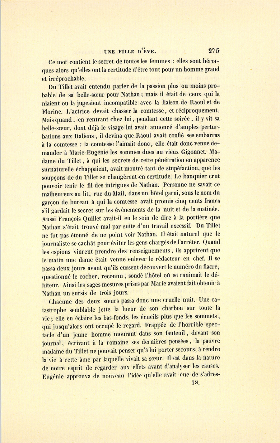 – Va donc demander rue du Mail, à l’hôtel du Mail, s’il n’a pas été amené mourant par une belle femme avec laquelle il est en relation depuis un an, et les lettres de ta rivale sont cachées, à ton nez, chez toi. Si tu veux donner à Nathan quelque bonne leçon, nous irons tous trois chez toi ; là je te prouverai, pièces en main, que tu peux l’empêcher d’aller rue de Clichy, sous peu de temps, si tu veux être bonne fille.