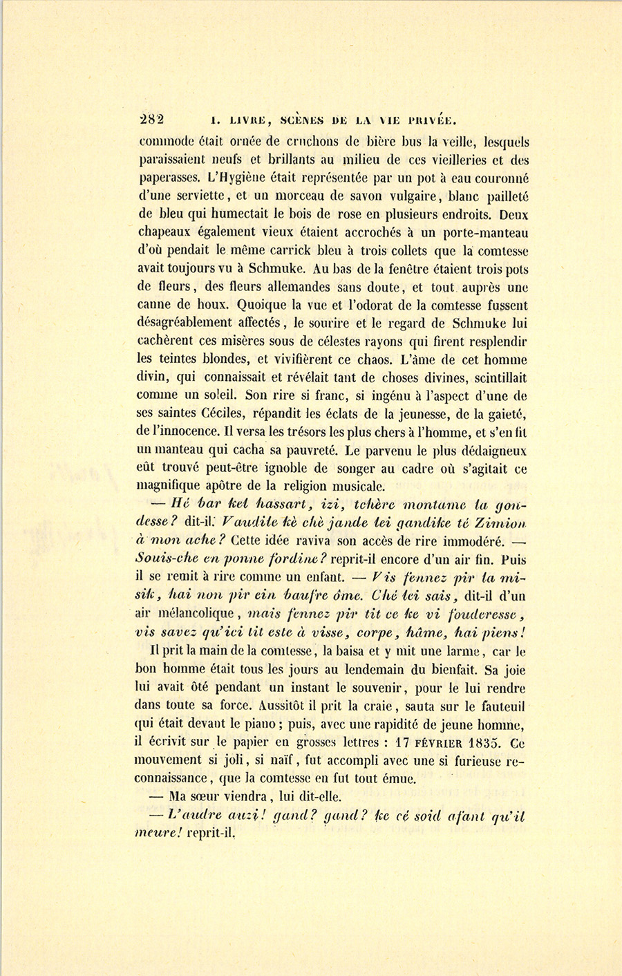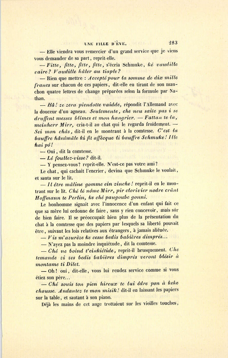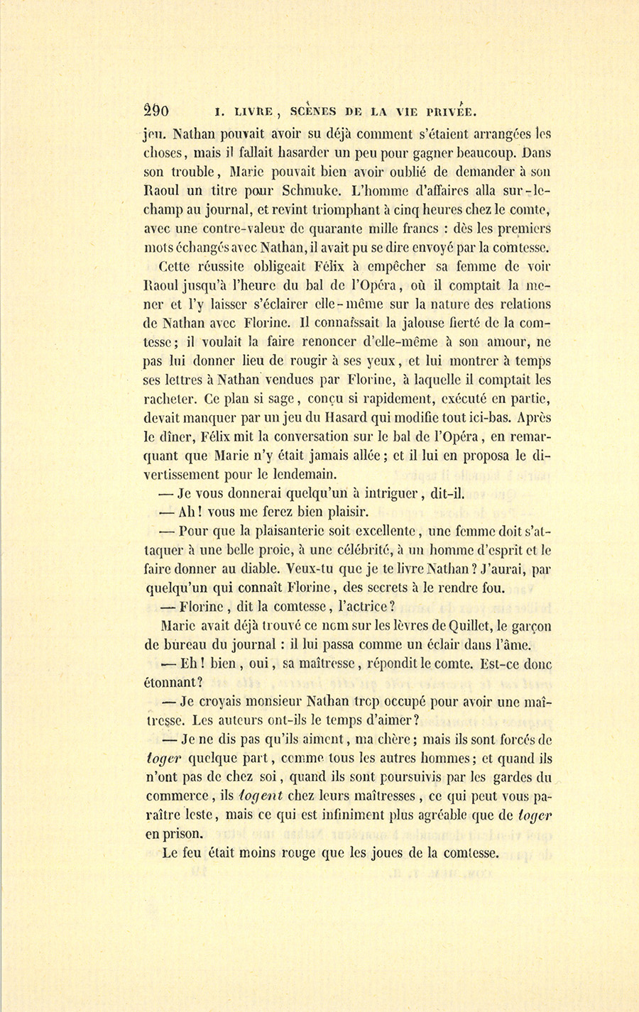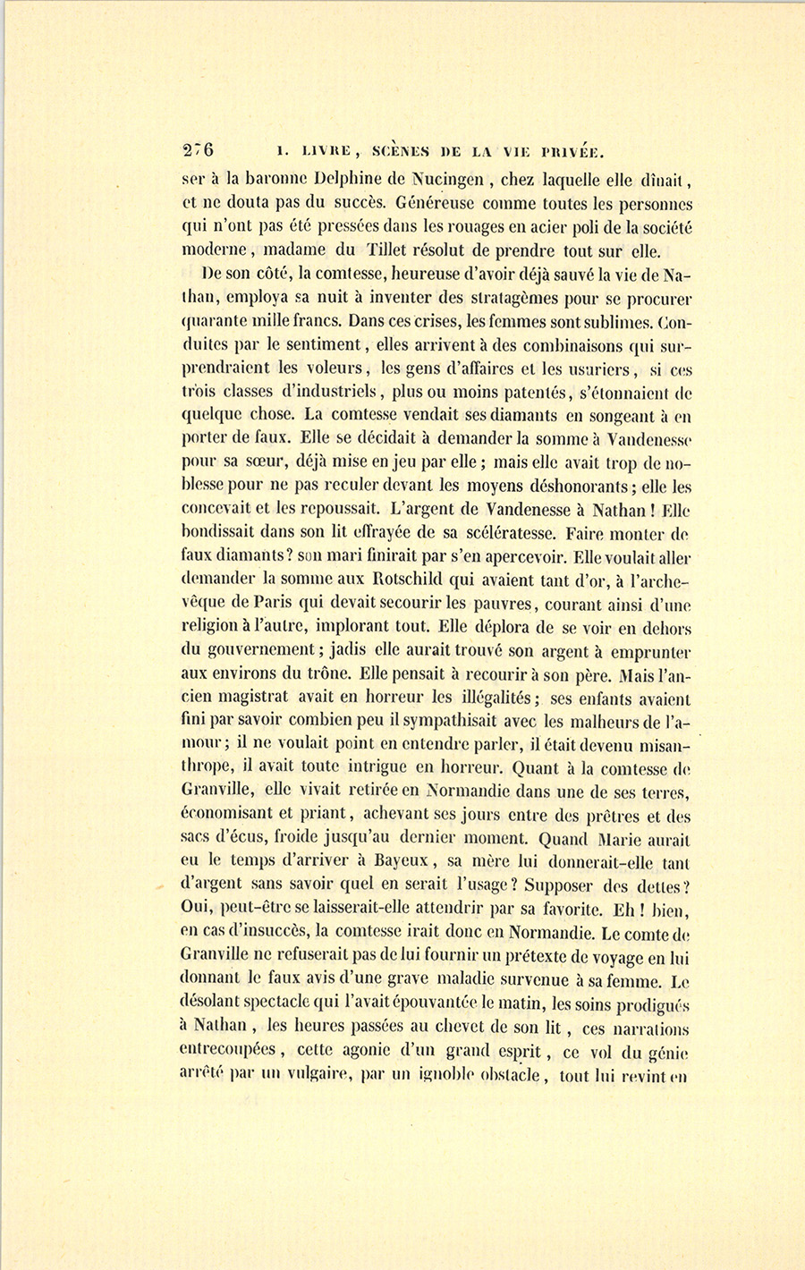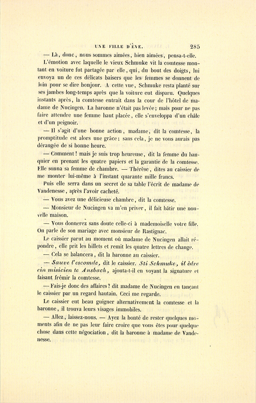 Cette lettre une fois mise à la poste, il alla chez son homme d’affaires, garçon très-habile et délié, quoique honnête ; il le pria de jouer le rôle d’un ami auquel Schmuke aurait confié la visite de madame de Vandenesse, en s’inquiétant un peu tard de la signification de ces mots : Accepté pour dix mille francs, répétés quatre fois, lequel viendrait demander à monsieur Nathan une lettre de change de quarante mille francs comme contre-valeur. C’était jouer gros {p. 290} jeu. Nathan pouvait avoir su déjà comment s’étaient arrangées les choses, mais il fallait hasarder un peu pour gagner beaucoup. Dans son trouble, Marie pouvait bien avoir oublié de demander à son Raoul un titre pour Schmuke. L’homme d’affaires alla sur-le-champ au journal, et revint triomphant à cinq heures chez le comte, avec une contre-valeur de quarante mille francs : dès les premiers mots échangés avec Nathan, il avait pu se dire envoyé par la comtesse.