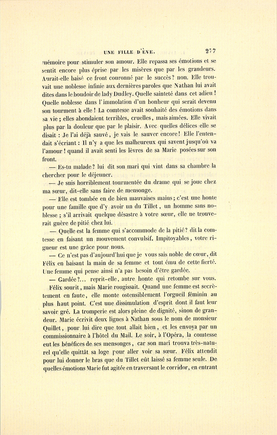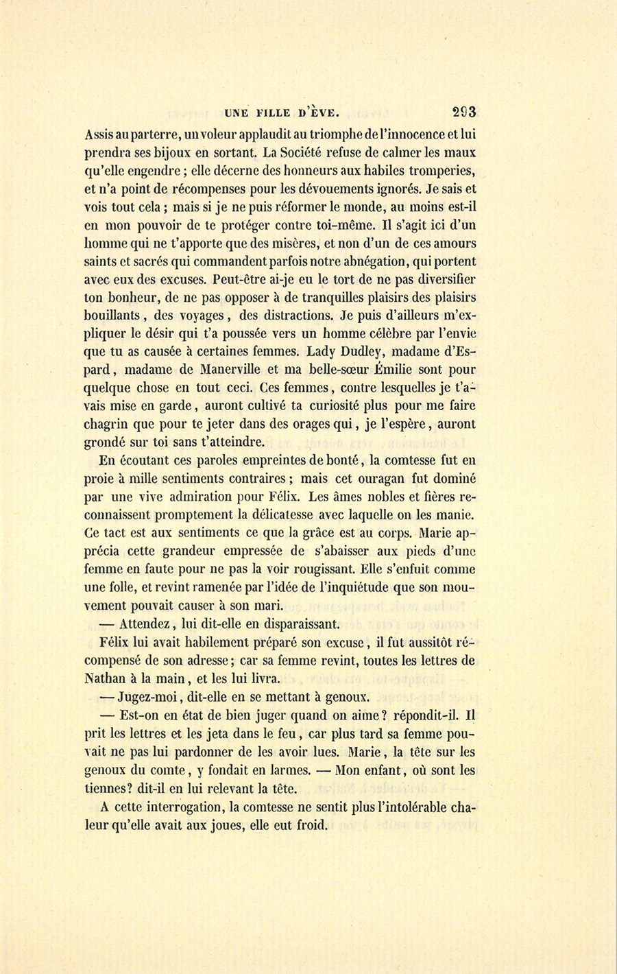 – Que serais-tu devenue, pauvre Marie, dans trois mois d’ici ? tu te serais vue traînée par les huissiers devant les tribunaux. Ne baisse pas la tête, ne t’humilie point : tu as été la dupe des sentiments les plus beaux, tu as coqueté avec la poésie et non avec un homme. Toutes les femmes, toutes, entends-tu, Marie, eussent été séduites à ta place. Ne serions-nous pas absurdes, nous autres hommes, qui avons fait mille sottises en vingt ans, de vouloir que vous ne soyez pas imprudentes une seule fois dans toute votre vie ? Dieu me garde de triompher de toi ou de t’accabler d’une pitié que tu repoussais si vivement l’autre jour. Peut-être ce malheureux était-il sincère quand il t’écrivait, sincère en se tuant, sincère en revenant le soir même chez Florine. Nous valons moins que vous. Je ne parle pas pour moi dans ce moment, mais pour toi. Je suis indulgent ; mais la Société ne l’est point, elle fuit la femme qui fait un éclat, elle ne veut pas qu’on cumule un bonheur complet et la considération. Est-ce juste, je ne saurais le dire. Le monde est cruel, voilà tout. Peut-être est-il plus envieux en masse qu’il ne l’est pris en détail. {p. 293} Assis au parterre, un voleur applaudit au triomphe de l’innocence et lui prendra ses bijoux en sortant. La Société refuse de calmer les maux qu’elle engendre ; elle décerne des honneurs aux habiles tromperies, et n’a point de récompenses pour les dévouements ignorés. Je sais et vois tout cela ; mais si je ne puis réformer le monde, au moins est-il en mon pouvoir de te protéger contre toi-même. Il s’agit ici d’un homme qui ne t’apporte que des misères, et non d’un de ces amours saints et sacrés qui commandent parfois notre abnégation, qui portent avec eux des excuses. Peut-être ai-je eu le tort de ne pas diversifier ton bonheur, de ne pas opposer à de tranquilles plaisirs des plaisirs bouillants, des voyages, des distractions. Je puis d’ailleurs m’expliquer le désir qui t’a poussée vers un homme célèbre par l’envie que tu as causée à certaines femmes. Lady Dudley, madame d’Espard, madame de Manerville et ma belle-sœur Émilie sont pour quelque chose en tout ceci. Ces femmes, contre lesquelles je t’avais mise en garde, auront cultivé ta curiosité plus pour me faire chagrin que pour te jeter dans des orages qui, je l’espère, auront grondé sur toi sans t’atteindre.