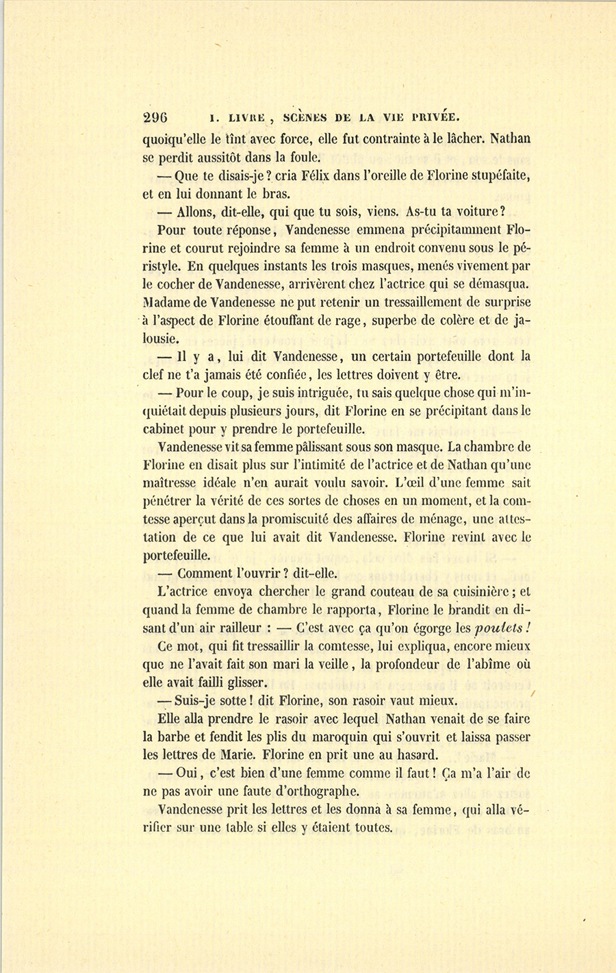 L’actrice envoya chercher le grand couteau de sa cuisinière ; et quand la femme de chambre le rapporta, Florine le brandit en disant d’un air railleur : – C’est avec ça qu’on égorge les poulets !