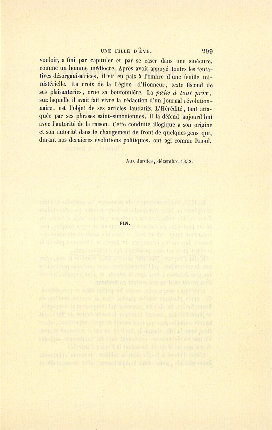 Aujourd’hui, cet ambitieux, si riche en encre et si pauvre en {p. 299} vouloir, a fini par capituler et par se caser dans une sinécure, comme un homme médiocre. Après avoir appuyé toutes les tentatives désorganisatrices, il vit en paix à l’ombre d’une feuille ministérielle. La croix de la Légion-d’Honneur, texte fécond de ses plaisanteries, orne sa boutonnière. La paix à tout prix, sur laquelle il avait fait vivre la rédaction d’un journal révolutionnaire, est l’objet de ses articles laudatifs. L’Hérédité, tant attaquée par ses phrases saint-simoniennes, il la défend aujourd’hui avec l’autorité de la raison. Cette conduite illogique a son origine et son autorité dans le changement de front de quelques gens qui, durant nos dernières évolutions politiques, ont agi comme Raoul.
