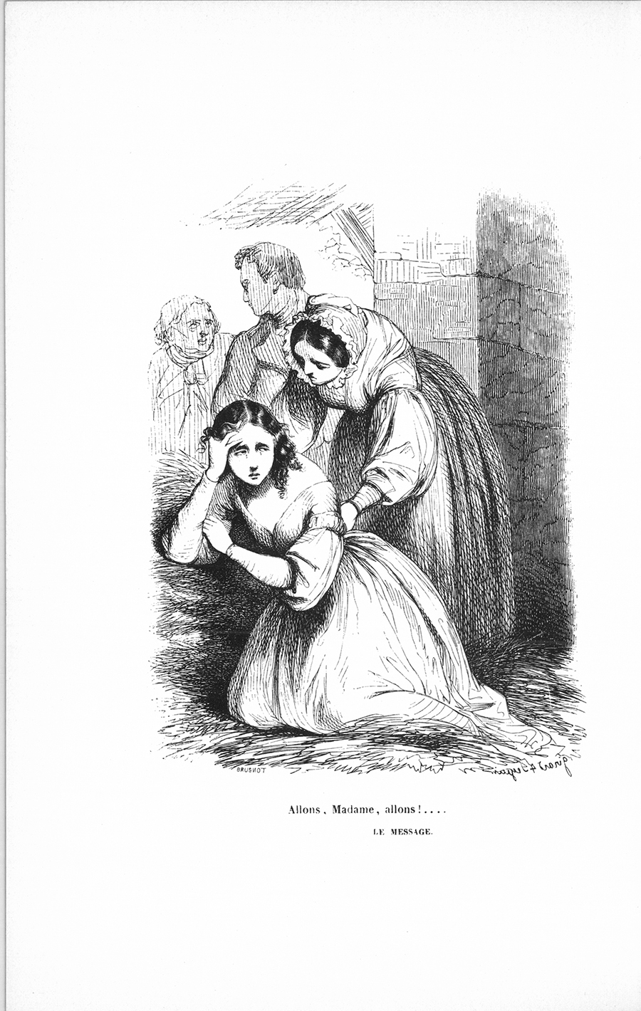 Mais il ne nous accompagna point. Le chanoine, la femme de chambre et moi nous parcourûmes les sentiers et les boulingrins du parc, appelant, écoutant, et d’autant plus inquiets, que j’annonçai la mort du jeune vicomte. En courant, je racontai les circonstances de ce fatal événement, et m’aperçus que la femme de chambre était extrêmement attachée à sa maîtresse ; car elle entra bien mieux que le chanoine dans les secrets de ma terreur. Nous allâmes aux pièces d’eau, nous visitâmes tout sans trouver la comtesse, ni le moindre vestige de son passage. Enfin, en revenant le long d’un mur, j’entendis des gémissements sourds et profondément étouffés qui semblaient sortir d’une espèce de grange. À tout hasard, j’y entrai. Nous y découvrîmes Juliette, qui, mue par l’instinct du désespoir, s’y était ensevelie au milieu du foin. Elle avait caché là sa tête afin d’assourdir ses horribles cris, obéissant à une invincible pudeur : c’était des sanglots, des pleurs d’enfant, mais plus pénétrants, plus plaintifs. Il n’y avait plus rien dans le monde pour elle. La femme de chambre dégagea sa maîtresse, qui se laissa faire avec la flasque insouciance de l’animal mourant. Cette fille ne savait rien dire autre chose que : – Allons, madame, allons ?… [ill.]