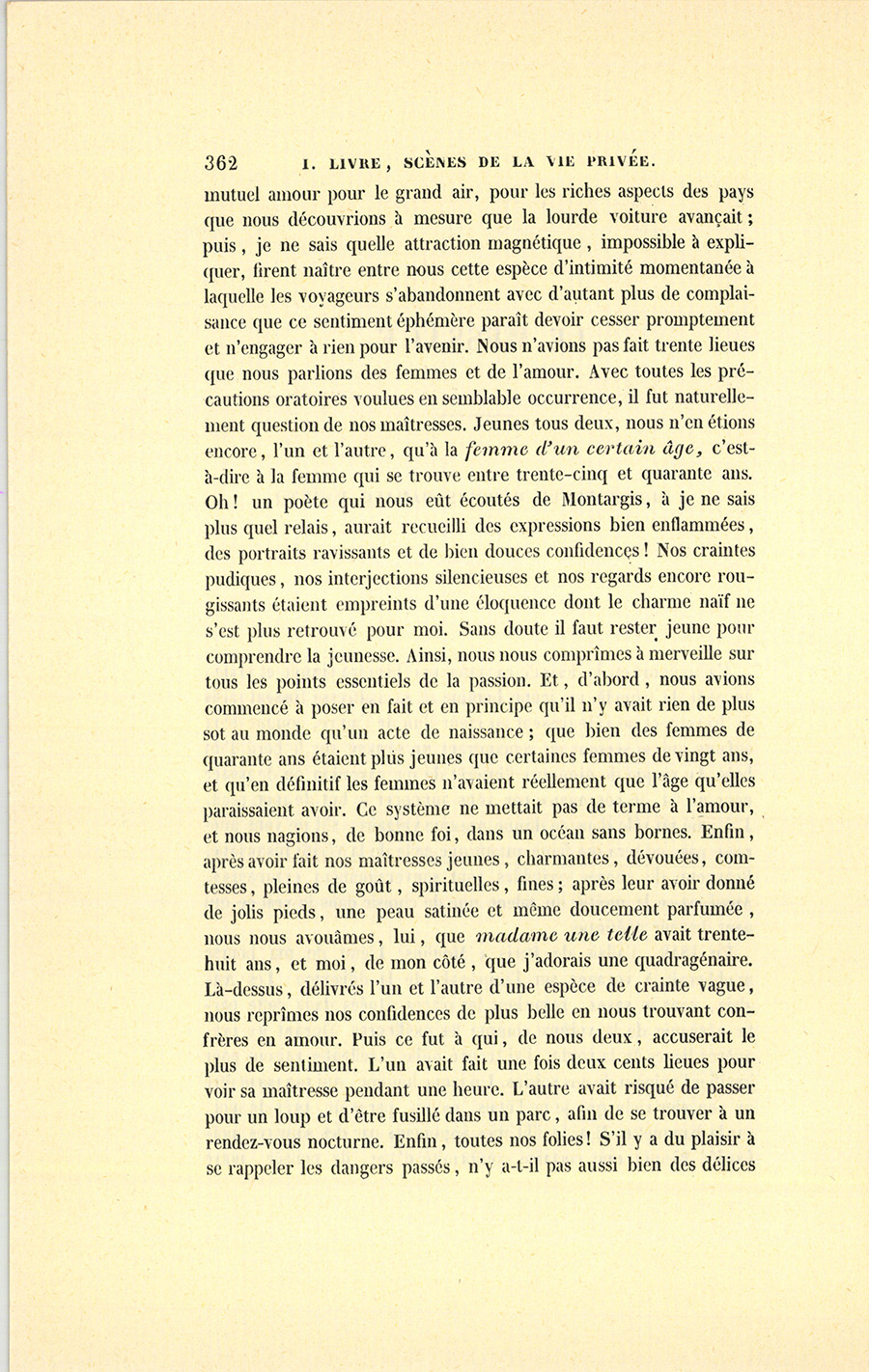 En 1819, j’allais de Paris à Moulins. L’état de ma bourse m’obligeait à voyager sur l’impériale de la diligence. Les Anglais, vous le savez, regardent les places situées dans cette partie aérienne de la voiture comme les meilleures. Durant les premières lieues de la route, j’ai trouvé mille excellentes raisons pour justifier l’opinion de nos voisins. Un jeune homme, qui me parut être un peu plus riche que je ne l’étais, monta, par goût, près de moi, sur la banquette. Il accueillit mes arguments par des sourires inoffensifs. Bientôt une certaine conformité d’âge, de pensée, notre {p. 362} mutuel amour pour le grand air, pour les riches aspects des pays que nous découvrions à mesure que la lourde voiture avançait ; puis, je ne sais quelle attraction magnétique, impossible à expliquer, firent naître entre nous cette espèce d’intimité momentanée à laquelle les voyageurs s’abandonnent avec d’autant plus de complaisance que ce sentiment éphémère paraît devoir cesser promptement et n’engager à rien pour l’avenir. Nous n’avions pas fait trente lieues que nous parlions des femmes et de l’amour. Avec toutes les précautions oratoires voulues en semblable occurrence, il fut naturellement question de nos maîtresses. Jeunes tous deux, nous n’en étions encore, l’un et l’autre, qu’à la femme d’un certain âge, c’est-à-dire à la femme qui se trouve entre trente-cinq et quarante ans. Oh ! un poète qui nous eût écoutés de Montargis, à je ne sais plus quel relais, aurait recueilli des expressions bien enflammées, des portraits ravissants et de bien douces confidences ! Nos craintes pudiques, nos interjections silencieuses et nos regards encore rougissants étaient empreints d’une éloquence dont le charme naïf ne s’est plus retrouvé pour moi. Sans doute il faut rester jeune pour comprendre la jeunesse. Ainsi, nous nous comprîmes à merveille sur tous les points essentiels de la passion. Et, d’abord, nous avions commencé à poser en fait et en principe qu’il n’y avait rien de plus sot au monde qu’un acte de naissance ; que bien des femmes de quarante ans étaient plus jeunes que certaines femmes de vingt ans, et qu’en définitif les femmes n’avaient réellement que l’âge qu’elles paraissaient avoir. Ce système ne mettait pas de terme à l’amour, et nous nagions, de bonne foi, dans un océan sans bornes. Enfin, après avoir fait nos maîtresses jeunes, charmantes, dévouées, comtesses, pleines de goût, spirituelles, fines ; après leur avoir donné de jolis pieds, une peau satinée et même doucement parfumée, nous nous avouâmes, lui, que madame une telle avait trente-huit ans, et moi, de mon côté, que j’adorais une quadragénaire. Là-dessus, délivrés l’un et l’autre d’une espèce de crainte vague, nous reprîmes nos confidences de plus belle en nous trouvant confrères en amour. Puis ce fut à qui, de nous deux, accuserait le plus de sentiment. L’un avait fait une fois deux cents lieues pour voir sa maîtresse pendant une heure. L’autre avait risqué de passer pour un loup et d’être fusillé dans un parc, afin de se trouver à un rendez-vous nocturne. Enfin, toutes nos folies ! S’il y a du plaisir à se rappeler les dangers passés, n’y a-t-il pas aussi bien des délices {p. 363} à se souvenir des plaisirs évanouis : c’est jouir deux fois. Les périls, les grands et petits bonheurs, nous nous disions tout, même les plaisanteries. La comtesse de mon ami avait fumé un cigare pour lui plaire ; la mienne me faisait mon chocolat et ne passait pas un jour sans m’écrire ou me voir ; la sienne était venue demeurer chez lui pendant trois jours au risque de se perdre ; la mienne avait fait encore mieux, ou pis si vous voulez. Nos maris adoraient d’ailleurs nos comtesses ; ils vivaient esclaves sous le charme que possèdent toutes les femmes aimantes ; et, plus niais que l’ordonnance ne le porte, ils ne nous faisaient tout juste de péril que ce qu’il en fallait pour augmenter nos plaisirs. Oh ! comme le vent emportait vite nos paroles et nos douces risées !