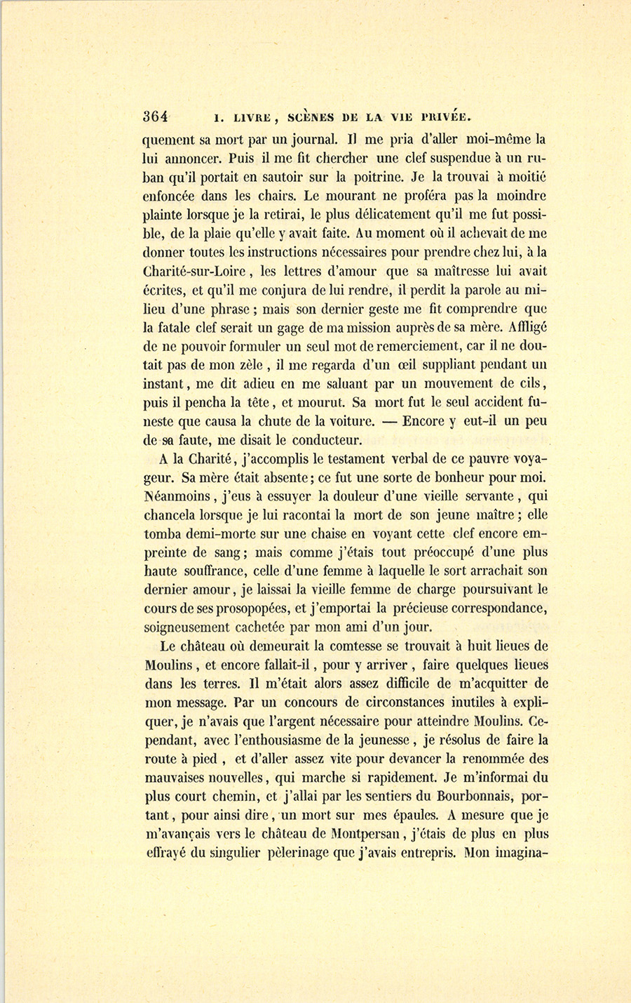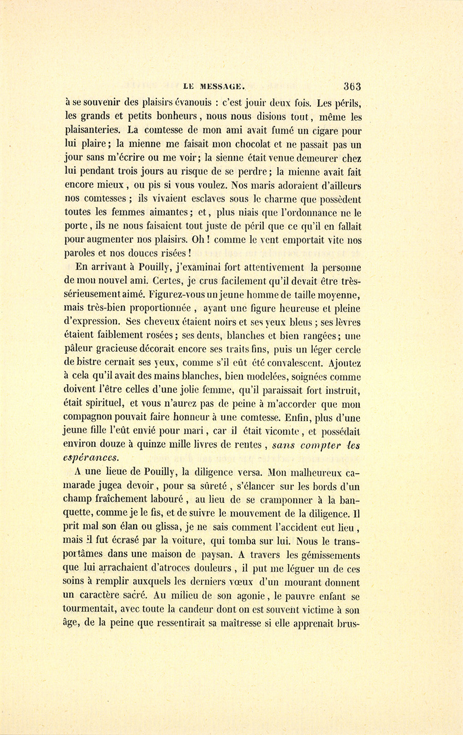À une lieue de Pouilly, la diligence versa. Mon malheureux camarade jugea devoir, pour sa sûreté, s’élancer sur les bords d’un champ fraîchement labouré, au lieu de se cramponner à la banquette, comme je le fis, et de suivre le mouvement de la diligence. Il prit mal son élan ou glissa, je ne sais comment l’accident eut lieu, mais il fut écrasé par la voiture, qui tomba sur lui. Nous le transportâmes dans une maison de paysan. À travers les gémissements que lui arrachaient d’atroces douleurs, il put me léguer un de ces soins à remplir auxquels les derniers vœux d’un mourant donnent un caractère sacré. Au milieu de son agonie, le pauvre enfant se tourmentait, avec toute la candeur dont on est souvent victime à son âge, de la peine que ressentirait sa maîtresse si elle apprenait {p. 364} brusquement sa mort par un journal. Il me pria d’aller moi-même la lui annoncer. Puis il me fit chercher une clef suspendue à un ruban qu’il portait en sautoir sur la poitrine. Je la trouvai à moitié enfoncée dans les chairs. Le mourant ne proféra pas la moindre plainte lorsque je la retirai, le plus délicatement qu’il me fut possible, de la plaie qu’elle y avait faite. Au moment où il achevait de me donner toutes les instructions nécessaires pour prendre chez lui, à la Charité-sur-Loire, les lettres d’amour que sa maîtresse lui avait écrites, et qu’il me conjura de lui rendre, il perdit la parole au milieu d’une phrase ; mais son dernier geste me fit comprendre que la fatale clef serait un gage de ma mission auprès de sa mère. Affligé de ne pouvoir formuler un seul mot de remerciement, car il ne doutait pas de mon zèle, il me regarda d’un œil suppliant pendant un instant, me dit adieu en me saluant par un mouvement de cils, puis il pencha la tête, et mourut. Sa mort fut le seul accident funeste que causa la chute de la voiture. – Encore y eut-il un peu de sa faute, me disait le conducteur.