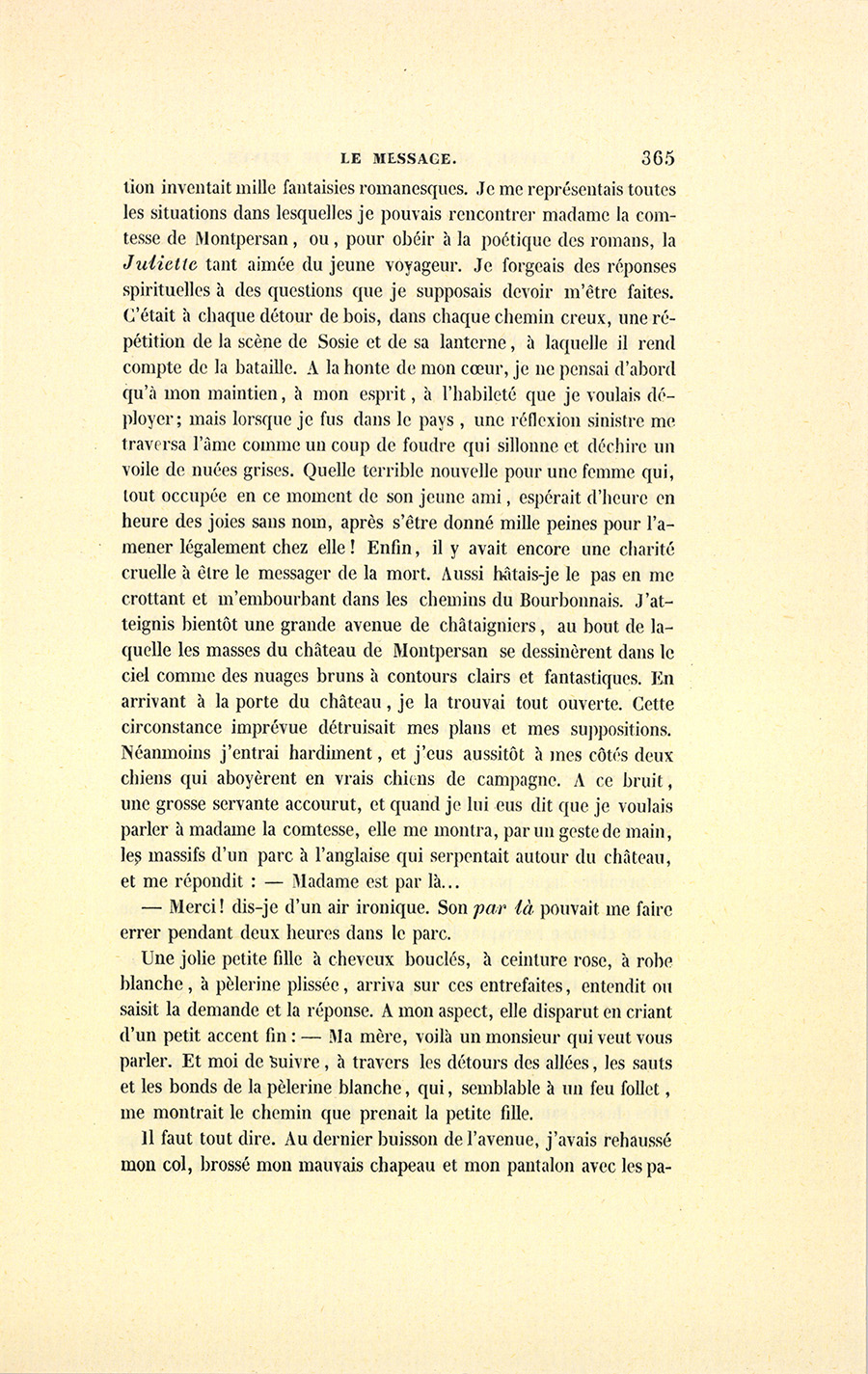Le château où demeurait la comtesse se trouvait à huit lieues de Moulins, et encore fallait-il, pour y arriver, faire quelques lieues dans les terres. Il m’était alors assez difficile de m’acquitter de mon message. Par un concours de circonstances inutiles à expliquer, je n’avais que l’argent nécessaire pour atteindre Moulins. Cependant, avec l’enthousiasme de la jeunesse, je résolus de faire la route à pied, et d’aller assez vite pour devancer la renommée des mauvaises nouvelles, qui marche si rapidement. Je m’informai du plus court chemin, et j’allai par les sentiers du Bourbonnais, portant, pour ainsi dire, un mort sur mes épaules. À mesure que je m’avançais vers le château de Montpersan, j’étais de plus en plus effrayé du singulier pèlerinage que j’avais entrepris. Mon {p. 365} imagination inventait mille fantaisies romanesques. Je me représentais toutes les situations dans lesquelles je pouvais rencontrer madame la comtesse de Montpersan, ou, pour obéir à la poétique des romans, la Juliette tant aimée du jeune voyageur. Je forgeais des réponses spirituelles à des questions que je supposais devoir m’être faites. C’était à chaque détour de bois, dans chaque chemin creux, une répétition de la scène de Sosie et de sa lanterne, à laquelle il rend compte de la bataille. À la honte de mon cœur, je ne pensai d’abord qu’à mon maintien, à mon esprit, à l’habileté que je voulais déployer ; mais lorsque je fus dans le pays, une réflexion sinistre me traversa l’âme comme un coup de foudre qui sillonne et déchire un voile de nuées grises. Quelle terrible nouvelle pour une femme qui, tout occupée en ce moment de son jeune ami, espérait d’heure en heure des joies sans nom, après s’être donné mille peines pour l’amener légalement chez elle ! Enfin, il y avait encore une charité cruelle à être le messager de la mort. Aussi hâtais-je le pas en me crottant et m’embourbant dans les chemins du Bourbonnais. J’atteignis bientôt une grande avenue de châtaigniers, au bout de laquelle les masses du château de Montpersan se dessinèrent dans le ciel comme des nuages bruns à contours clairs et fantastiques. En arrivant à la porte du château, je la trouvai tout ouverte. Cette circonstance imprévue détruisait mes plans et mes suppositions. Néanmoins j’entrai hardiment, et j’eus aussitôt à mes côtés deux chiens qui aboyèrent en vrais chiens de campagne. À ce bruit, une grosse servante accourut, et quand je lui eus dit que je voulais parler à madame la comtesse, elle me montra, par un geste de main, les massifs d’un parc à l’anglaise qui serpentait autour du château, et me répondit : – Madame est par là…