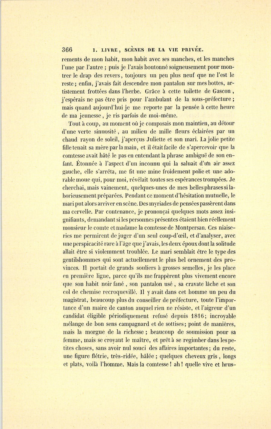 Tout à coup, au moment où je composais mon maintien, au détour d’une verte sinuosité, au milieu de mille fleurs éclairées par un chaud rayon de soleil, j’aperçus Juliette et son mari. La jolie petite fille tenait sa mère par la main, et il était facile de s’apercevoir que la comtesse avait hâté le pas en entendant la phrase ambiguë de son enfant. Étonnée à l’aspect d’un inconnu qui la saluait d’un air assez gauche, elle s’arrêta, me fit une mine froidement polie et une adorable moue qui, pour moi, révélait toutes ses espérances trompées. Je cherchai, mais vainement, quelques-unes de mes belles phrases si laborieusement préparées. Pendant ce moment d’hésitation mutuelle, le mari put alors arriver en scène. Des myriades de pensées passèrent dans ma cervelle. Par contenance, je prononçai quelques mots assez insignifiants, demandant si les personnes présentes étaient bien réellement monsieur le comte et madame la comtesse de Montpersan. Ces niaiseries me permirent de juger d’un seul coup d’œil, et d’analyser, avec une perspicacité rare à l’âge que j’avais, les deux époux dont la solitude allait être si violemment troublée. Le mari semblait être le type des gentilshommes qui sont actuellement le plus bel ornement des provinces. Il portait de grands souliers à grosses semelles, je les place en première ligne, parce qu’ils me frappèrent plus vivement encore que son habit noir fané, son pantalon usé, sa cravate lâche et son col de chemise recroquevillé. Il y avait dans cet homme un peu du magistrat, beaucoup plus du conseiller de préfecture, toute l’importance d’un maire de canton auquel rien ne résiste, et l’aigreur d’un candidat éligible périodiquement refusé depuis 1816 ; incroyable mélange de bon sens campagnard et de sottises ; point de manières, mais la morgue de la richesse ; beaucoup de soumission pour sa femme, mais se croyant le maître, et prêt à se regimber dans les petites choses, sans avoir nul souci des affaires importantes ; du reste, une figure flétrie, très-ridée, hâlée ; quelques cheveux gris, longs et plats, voilà l’homme. Mais la comtesse ! ah ! quelle vive et {p. 367} brusque opposition ne faisait-elle pas auprès de son mari ! C’était une petite femme à taille plate et gracieuse, ayant une tournure ravissante ; mignonne et si délicate, que vous eussiez eu peur de lui briser les os en la touchant. Elle portait une robe de mousseline blanche ; elle avait sur la tête un joli bonnet à rubans roses, une ceinture rose, une guimpe remplie si délicieusement par ses épaules et par les plus beaux contours, qu’en les voyant il naissait au fond du cœur une irrésistible envie de les posséder. Ses yeux étaient vifs, noirs, expressifs, ses mouvements doux, son pied charmant. Un vieil homme à bonnes fortunes ne lui eût pas donné plus de trente années, tant il y avait de jeunesse dans son front et dans les détails les plus fragiles de sa tête. Quant au caractère, elle me parut tenir tout à la fois de la comtesse de Lignolles et de la marquise de B…, deux types de femme toujours frais dans la mémoire d’un jeune homme, quand il a lu le roman de Louvet. Je pénétrai soudain dans tous les secrets de ce ménage, et pris une résolution diplomatique digne d’un vieil ambassadeur. Ce fut peut-être la seule fois de ma vie que j’eus du tact et que je compris en quoi consistait l’adresse des courtisans ou des gens du monde.